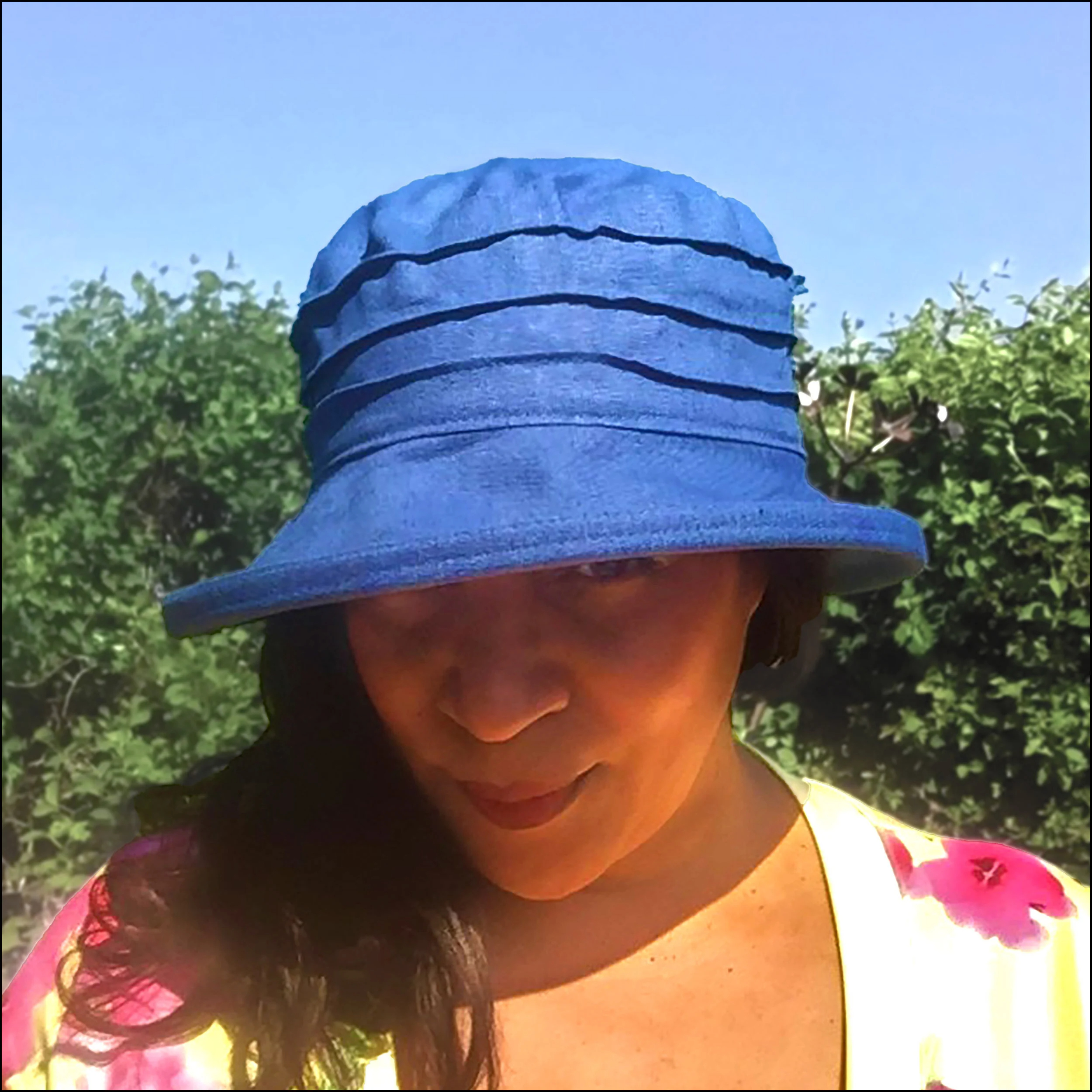 This sun hat features an elegant, pleated detail that creates a timeless, classic silhouette. Crafted from rich blue linen, the lightweight and breathable fabric is ideal for warm weather. The rounded crown is adorned with multiple horizontal pleats, adding depth and movement to a sophisticated look that enhances the overall design without being overly complicated.