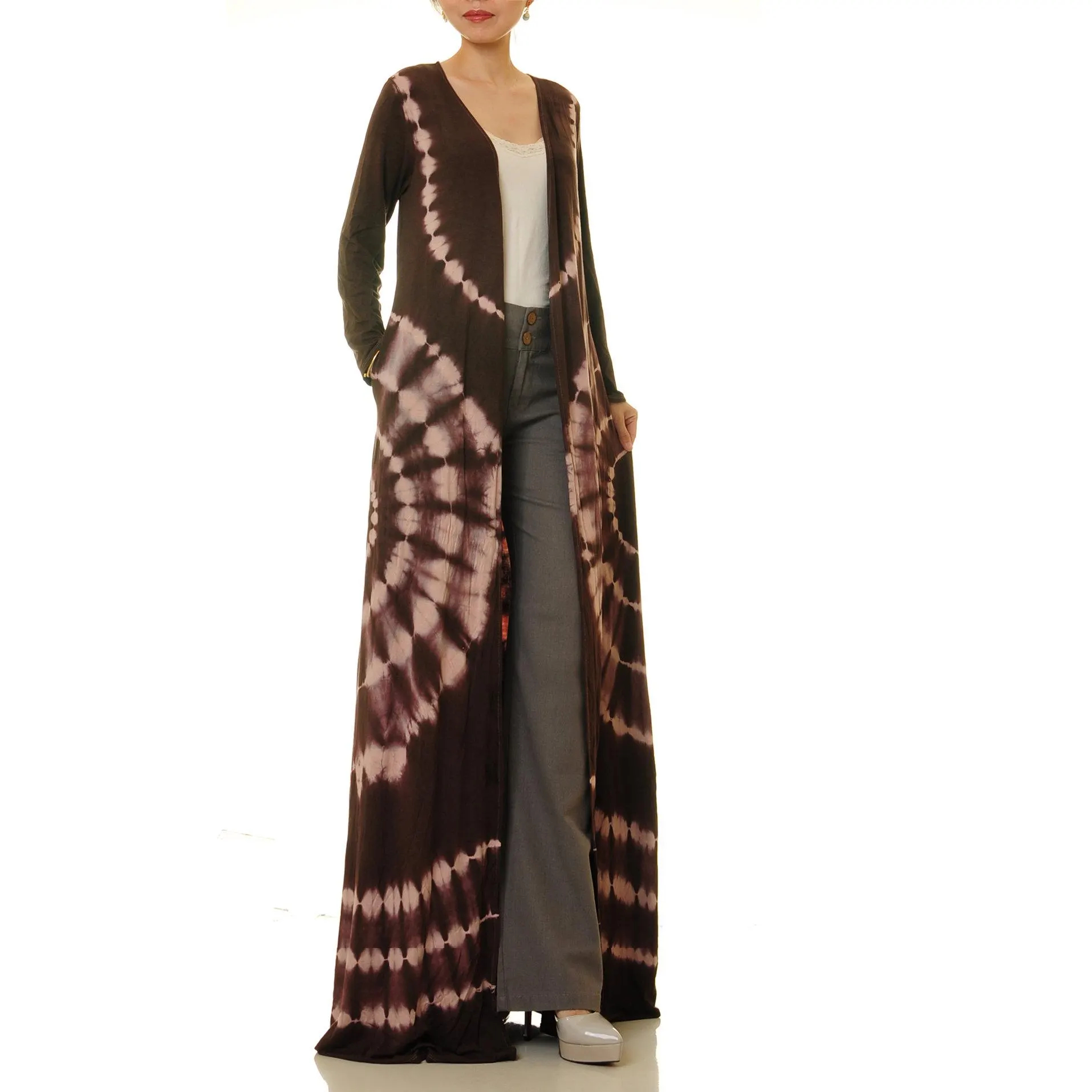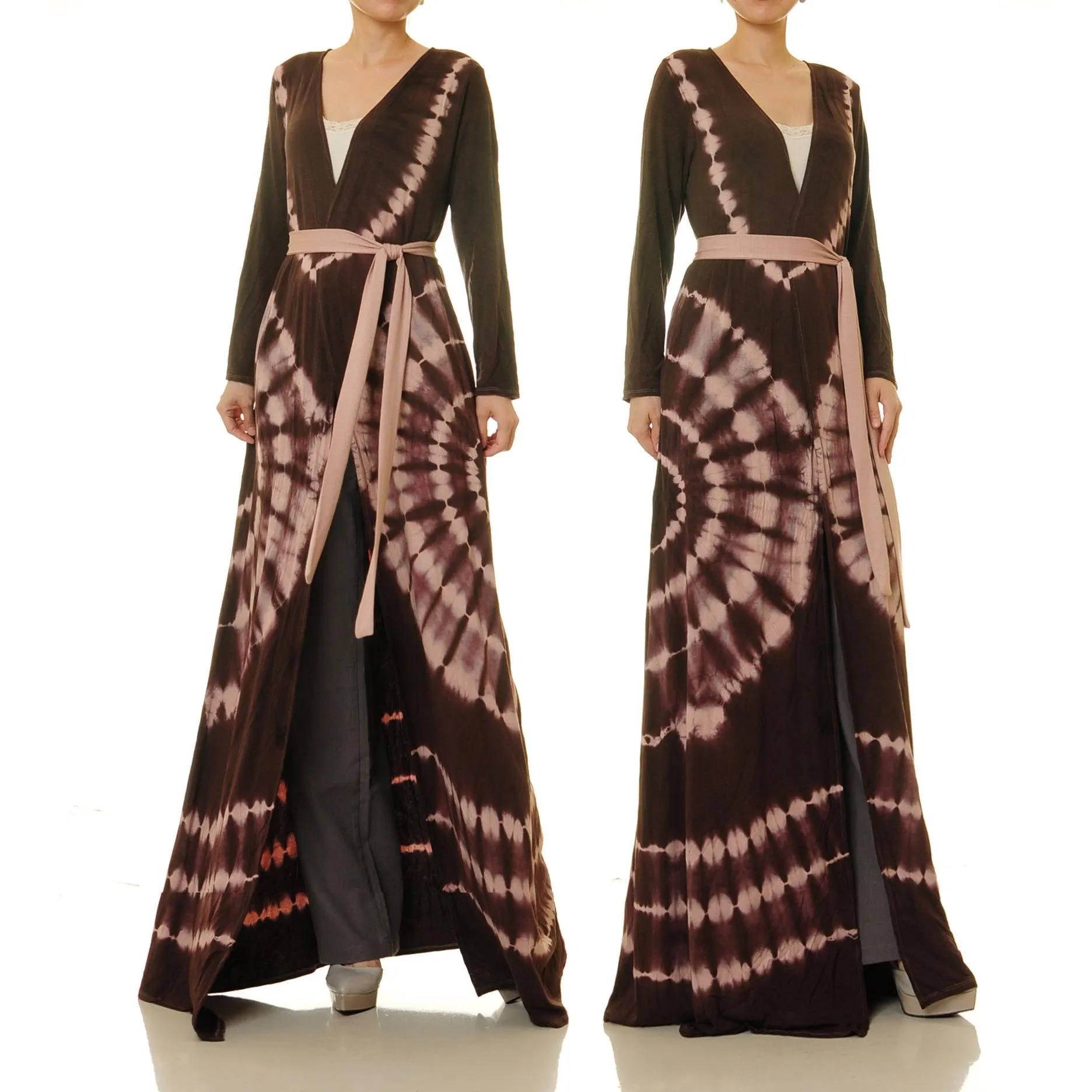 This robe outerwear piece combines a minimalist wrap silhouette with an artistic tie-dye look. Cocoa brown and light cherry pink create a spiraling halo that cascades down from the waist, like beams of light blooming across the fabric. The V-neckline flatters the neckline, and the ties allow for an adjustable fit. The flowing hem and center front slit enhance mobility and a sense of lightness. Throw it casually for a relaxed look, or cinch it at the waist for a refined and airy look.