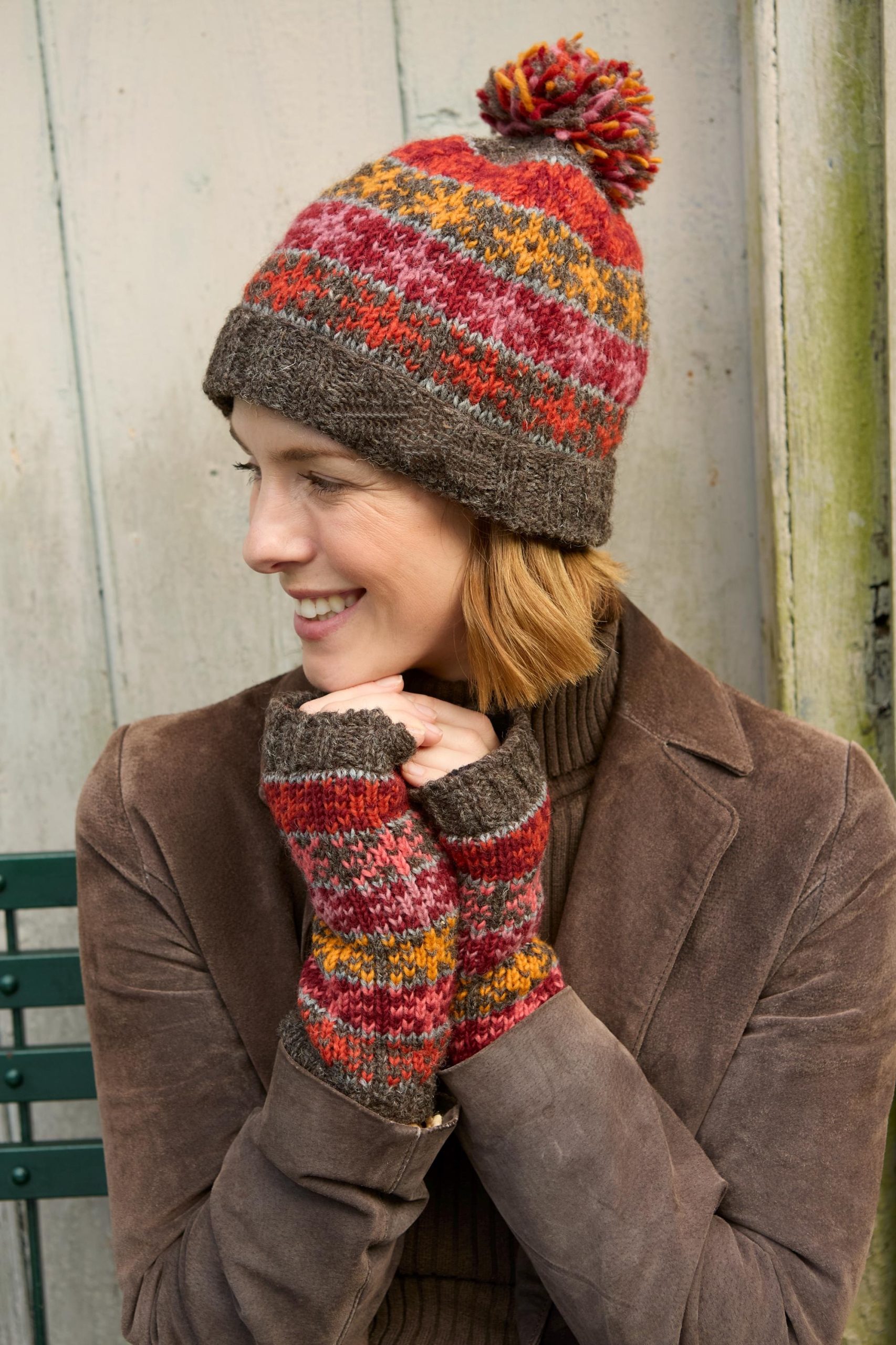 Details: Multi-colored Fair Isle pattern, ribbed knit cuffs for a sturdy and structured look, and securely stitched pom-poms.