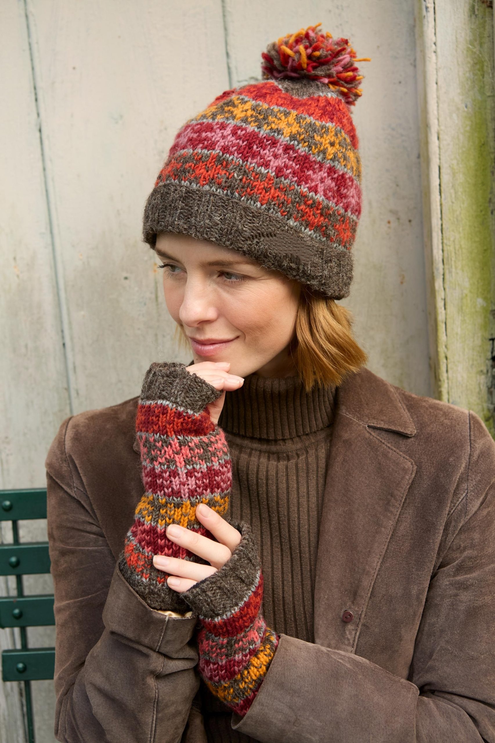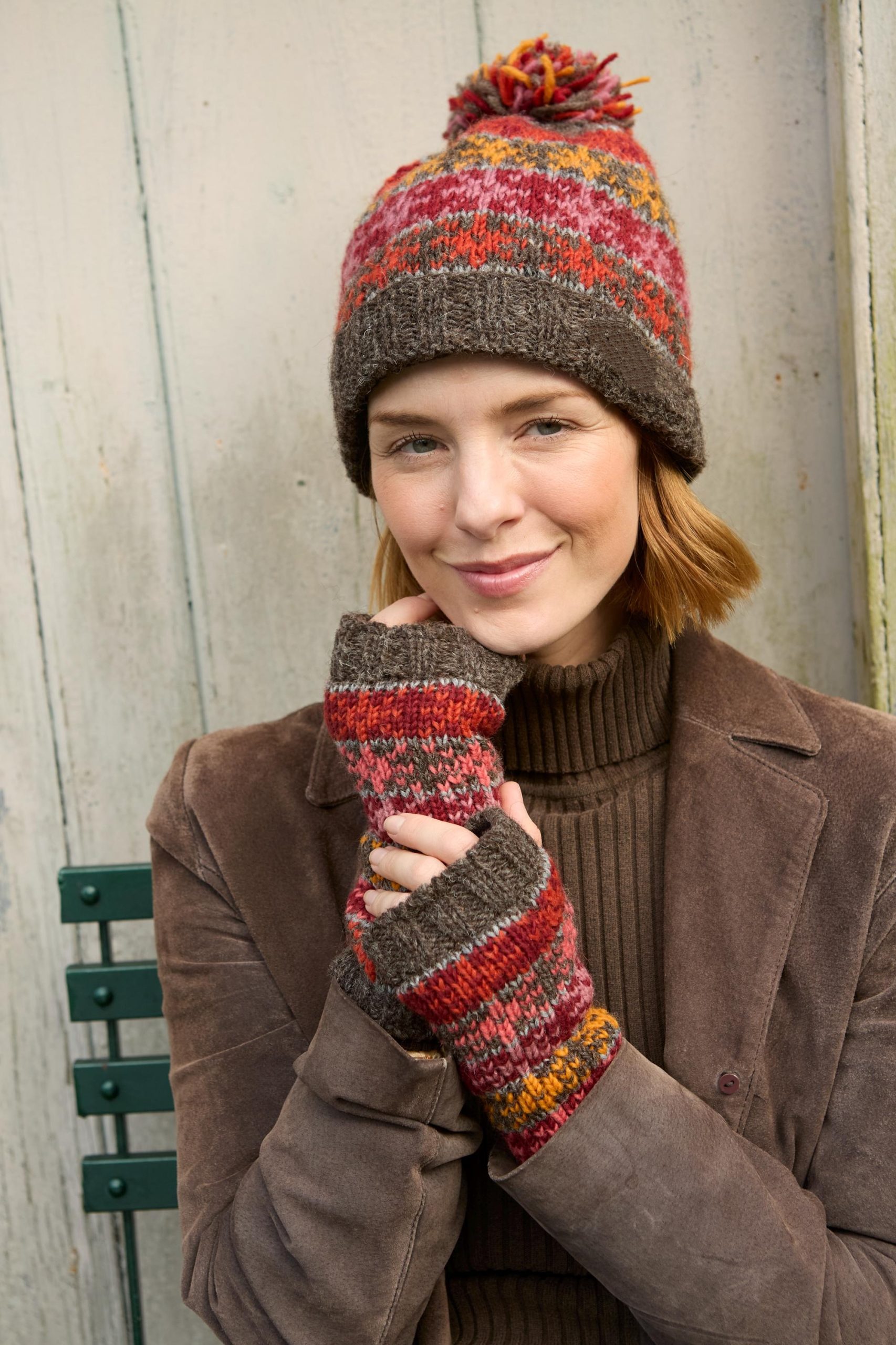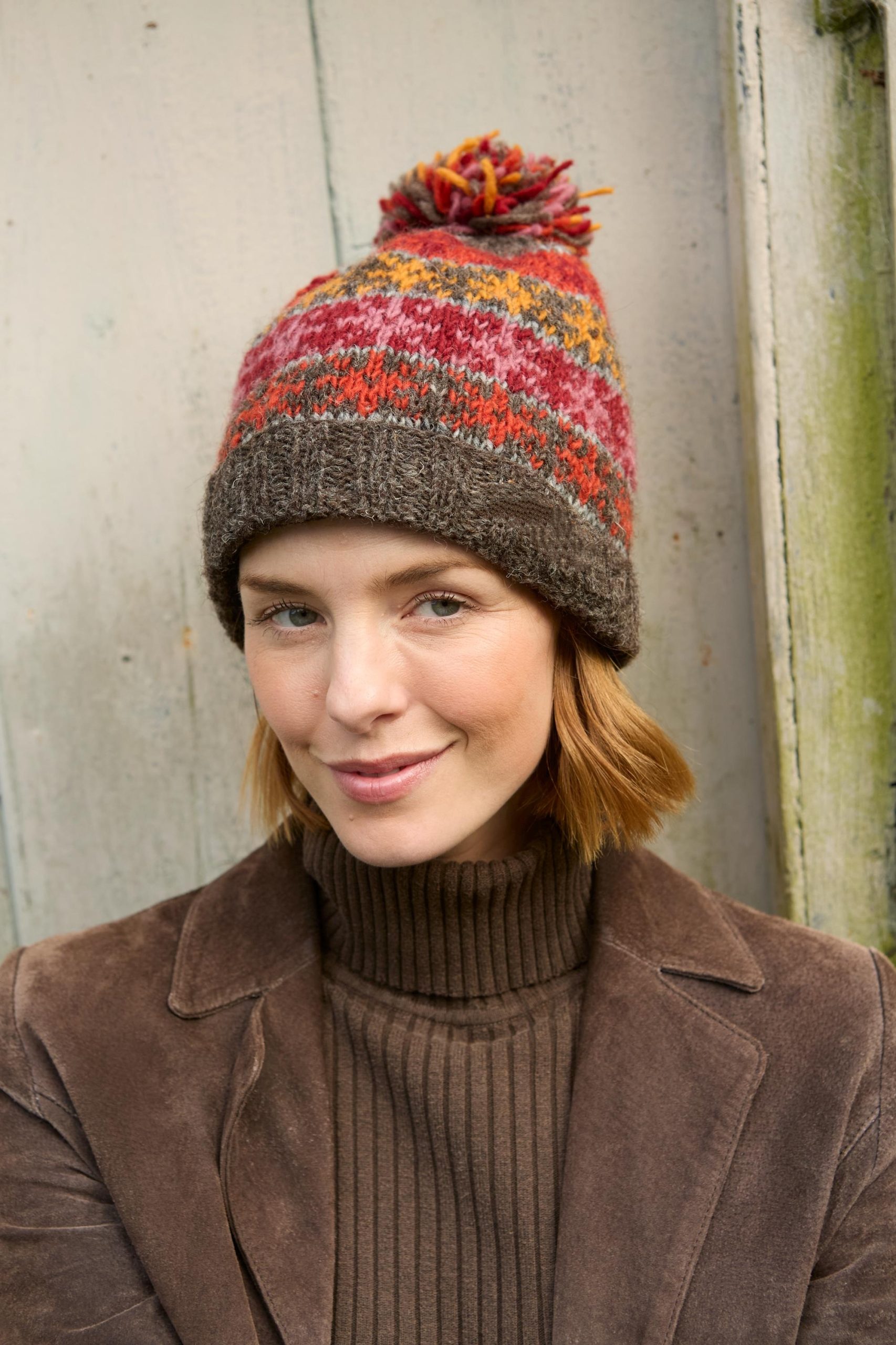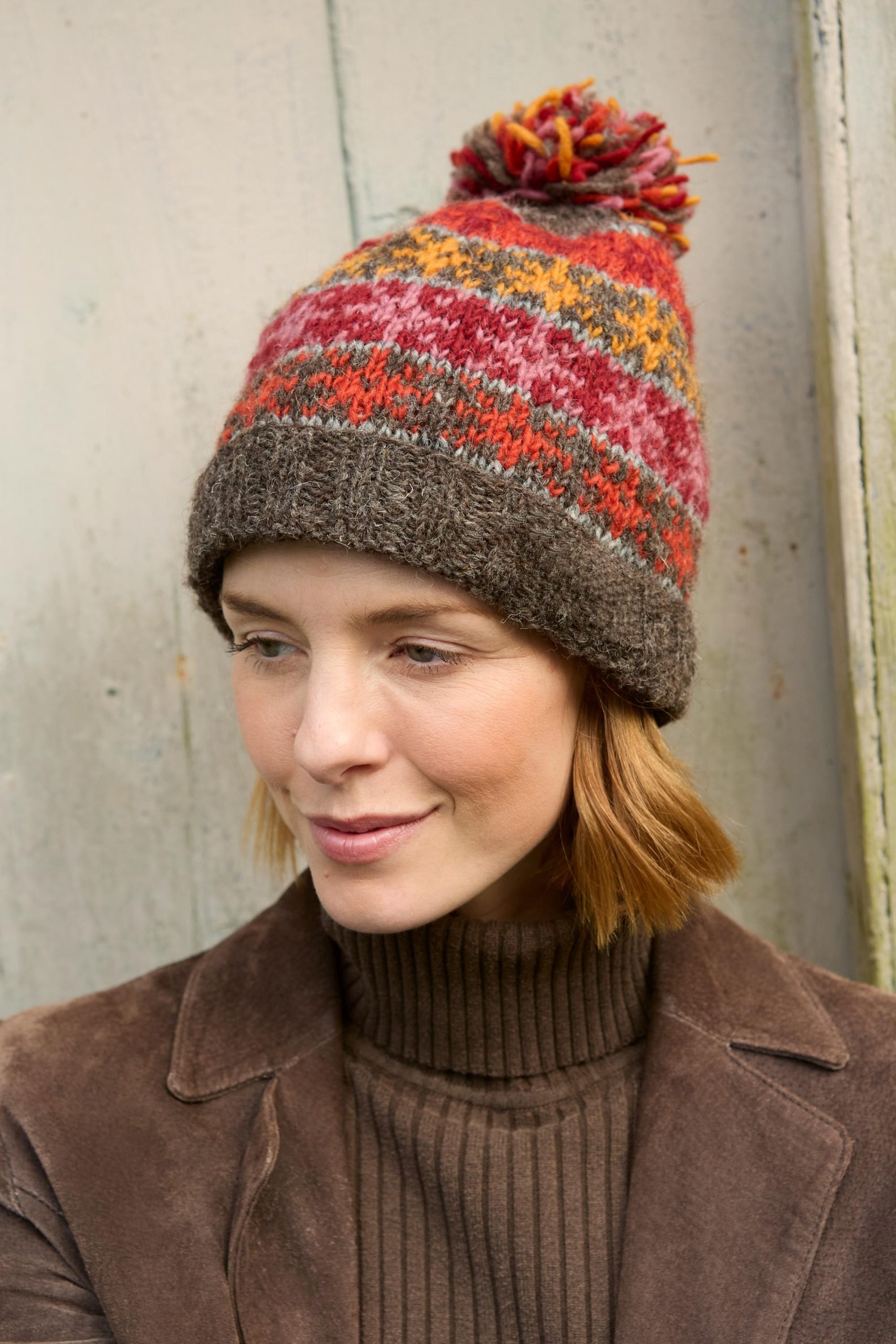 A mocha-colored blended brim adorned with a striking Fair Isle pattern in shades of amber, sunset orange, and golden yellow, topped with a mixed-color pom-pom. Comfortable and durable, it’s the perfect way to brighten up a gloomy day.