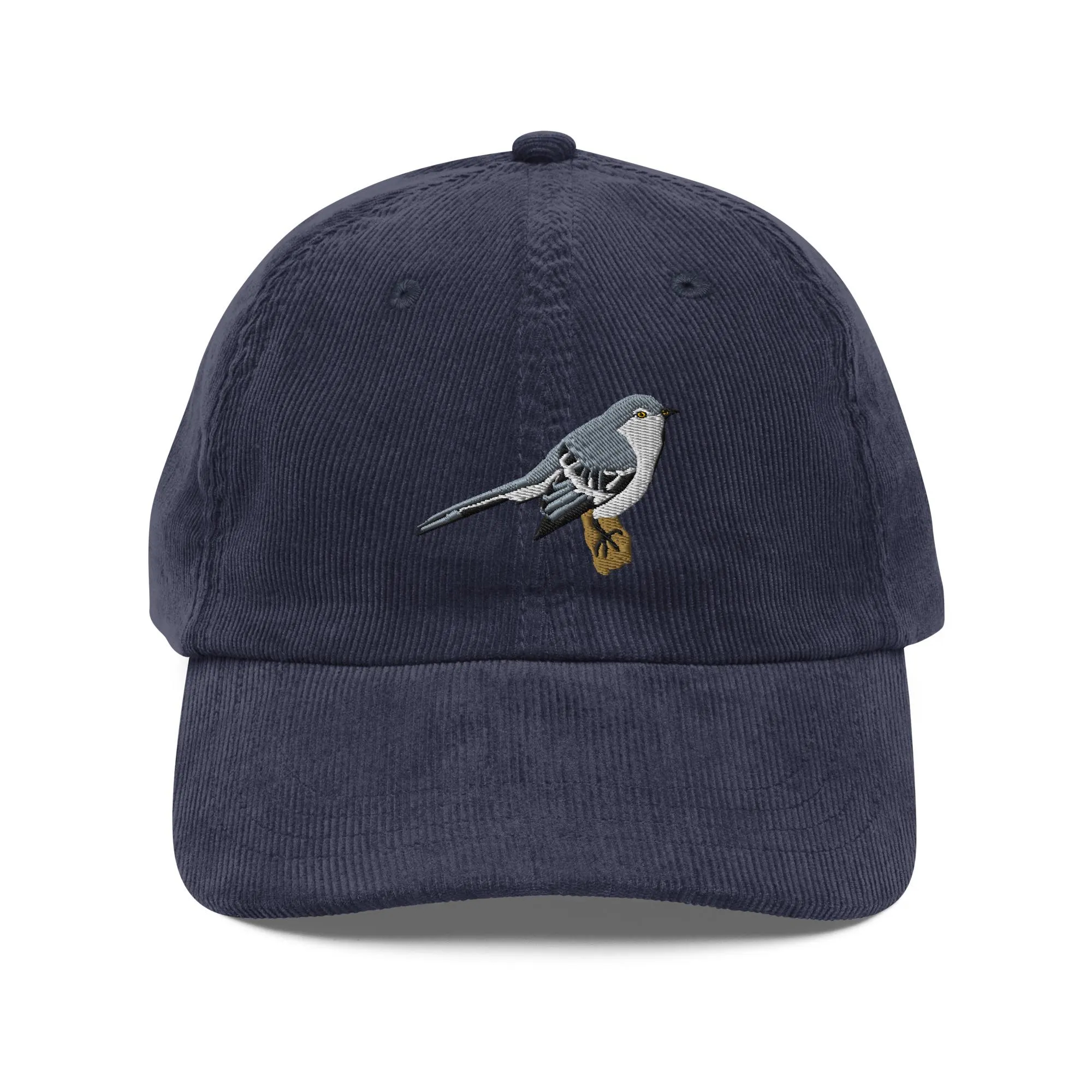 This hat features an exquisite embroidered design of a grey songbird perched on a golden-brown branch—the soft grey hues, clean lines, and subtle shading bring the bird to life. The design stands out against the deep navy corduroy fabric, adding a touch of refined naturalness without being overpowering. The corduroy fabric offers a warm texture and vintage charm, making this hat a versatile everyday accessory.