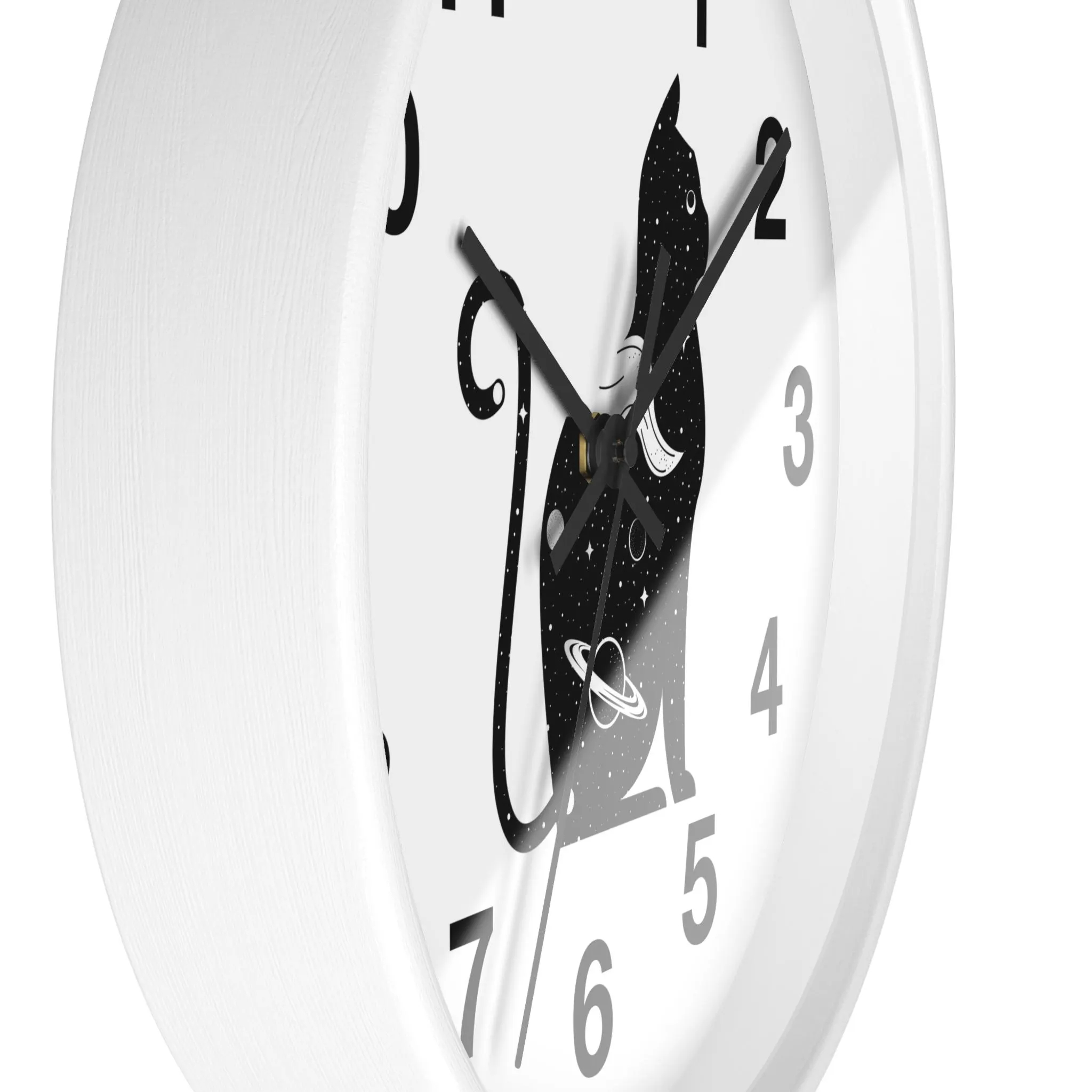 This charming and modern wall clock adds a touch of mystery and whimsy to your home décor. At the center of the clock face is a sleek black cat silhouette, concealing a rich array of starry details—twinkling stars, galaxies, and even a tiny Saturn-shaped planet. The minimalist white background contrasts sharply with the striking black design, creating a visually appealing effect. Clear, legible numerals and sharp black hands ensure the time is immediately apparent while maintaining an overall clean and modern aesthetic.