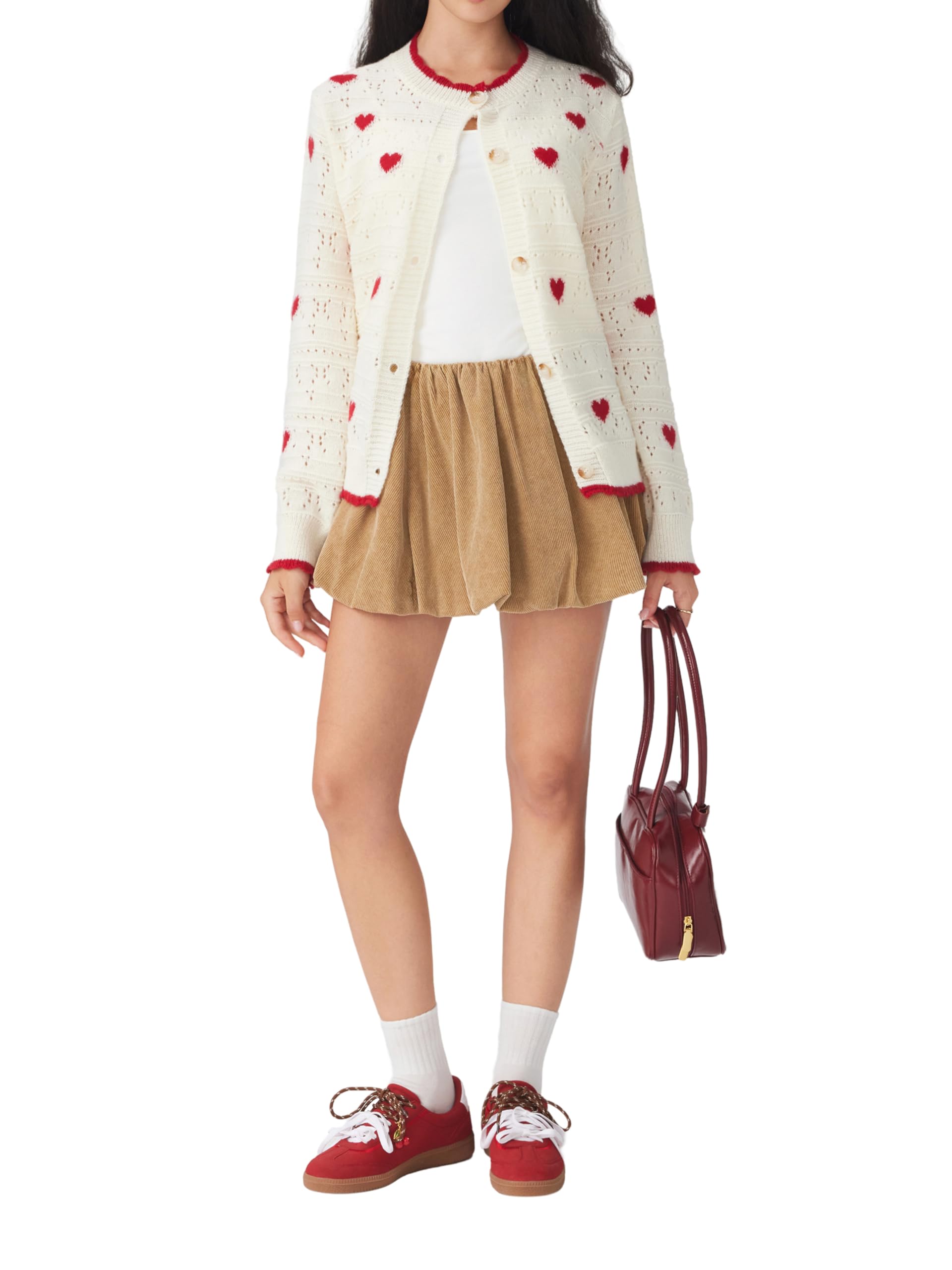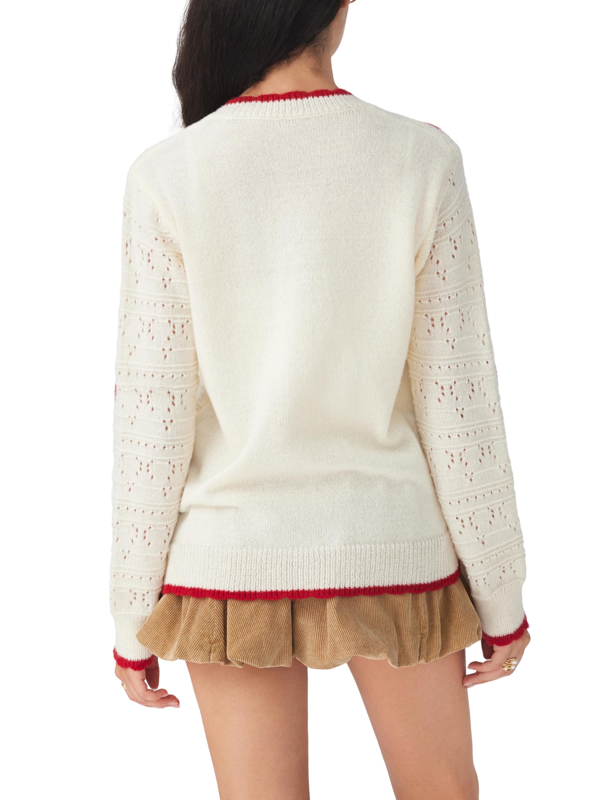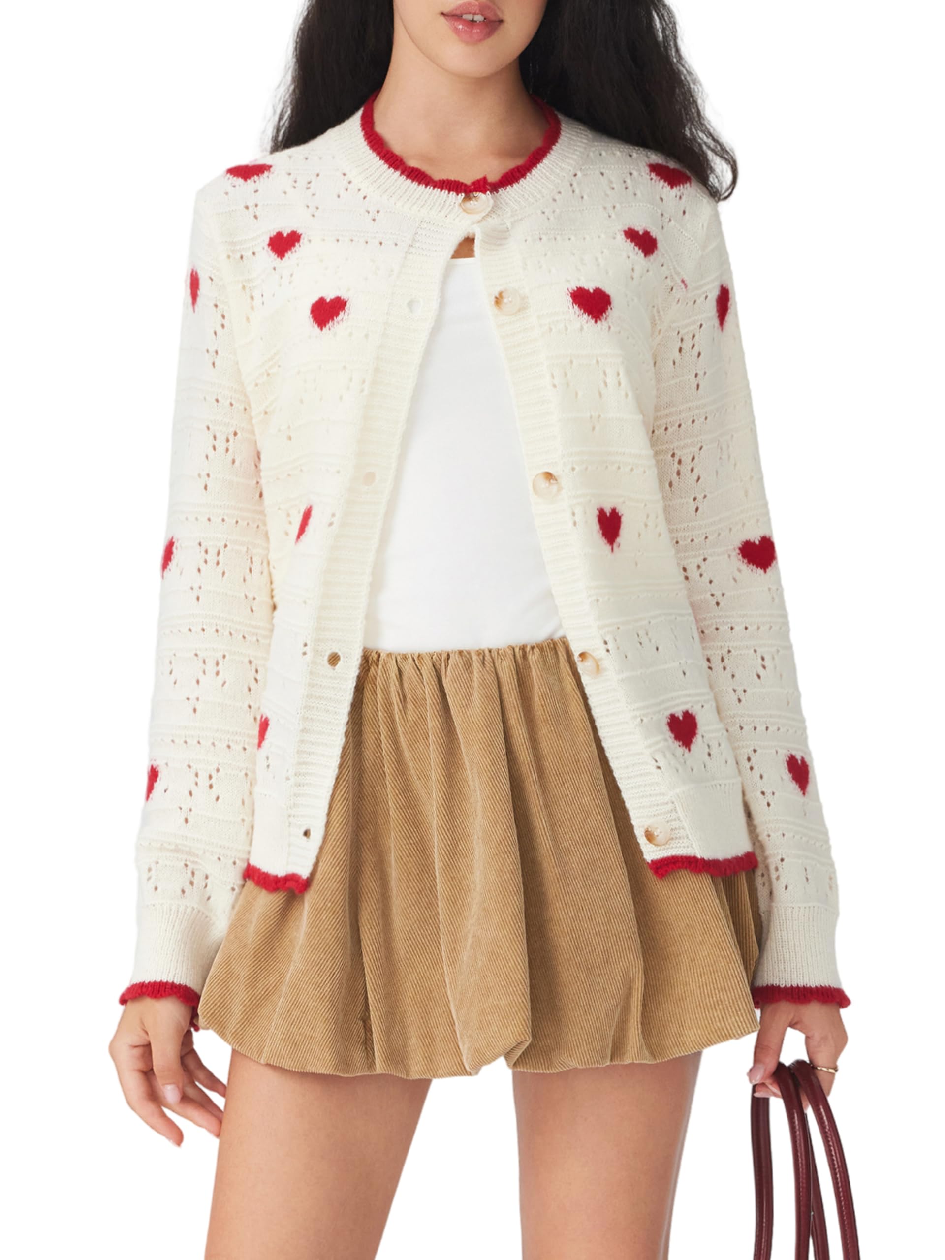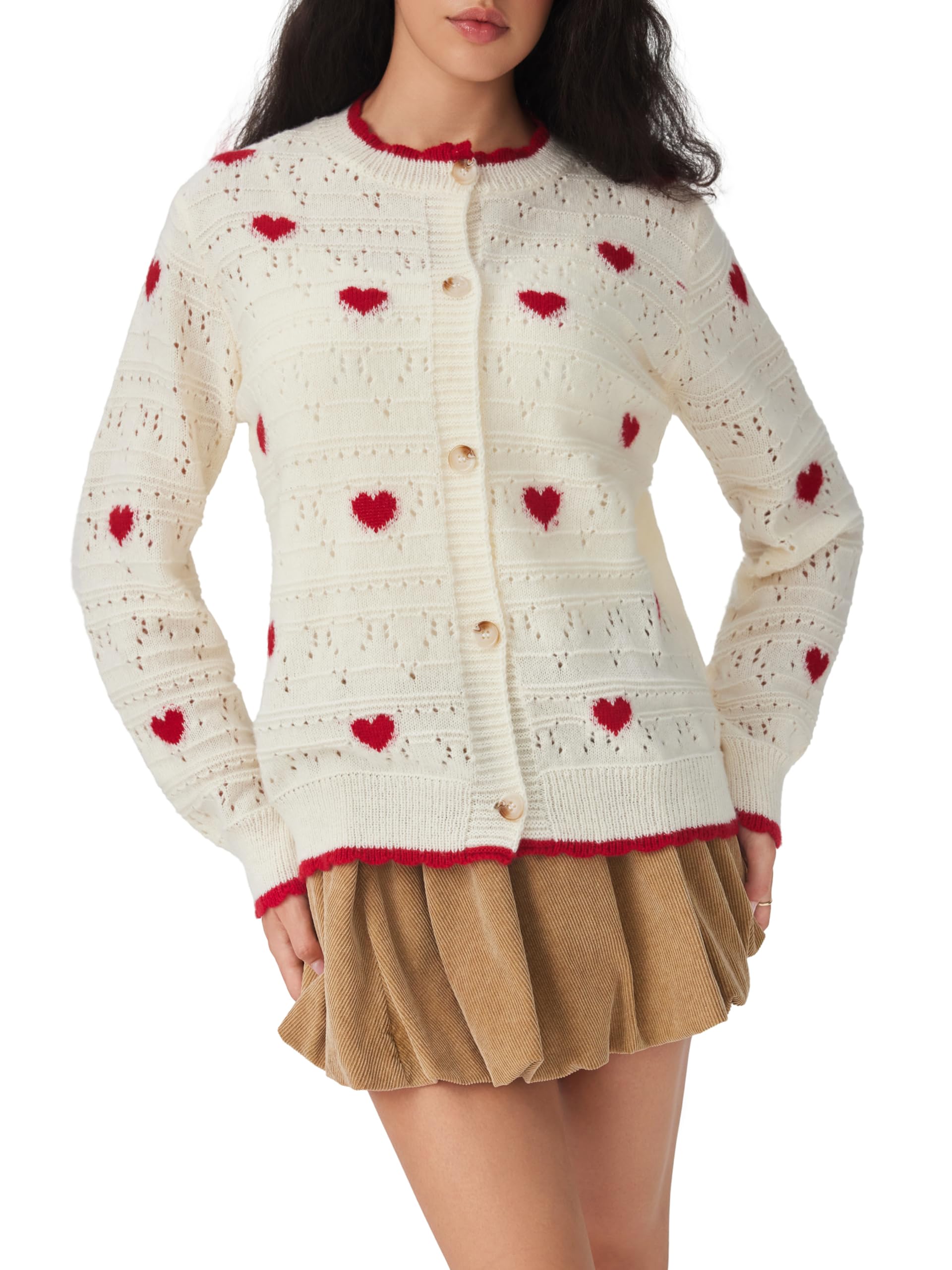 Sporadic red heart patterns adorn the cream-colored openwork knit fabric.
