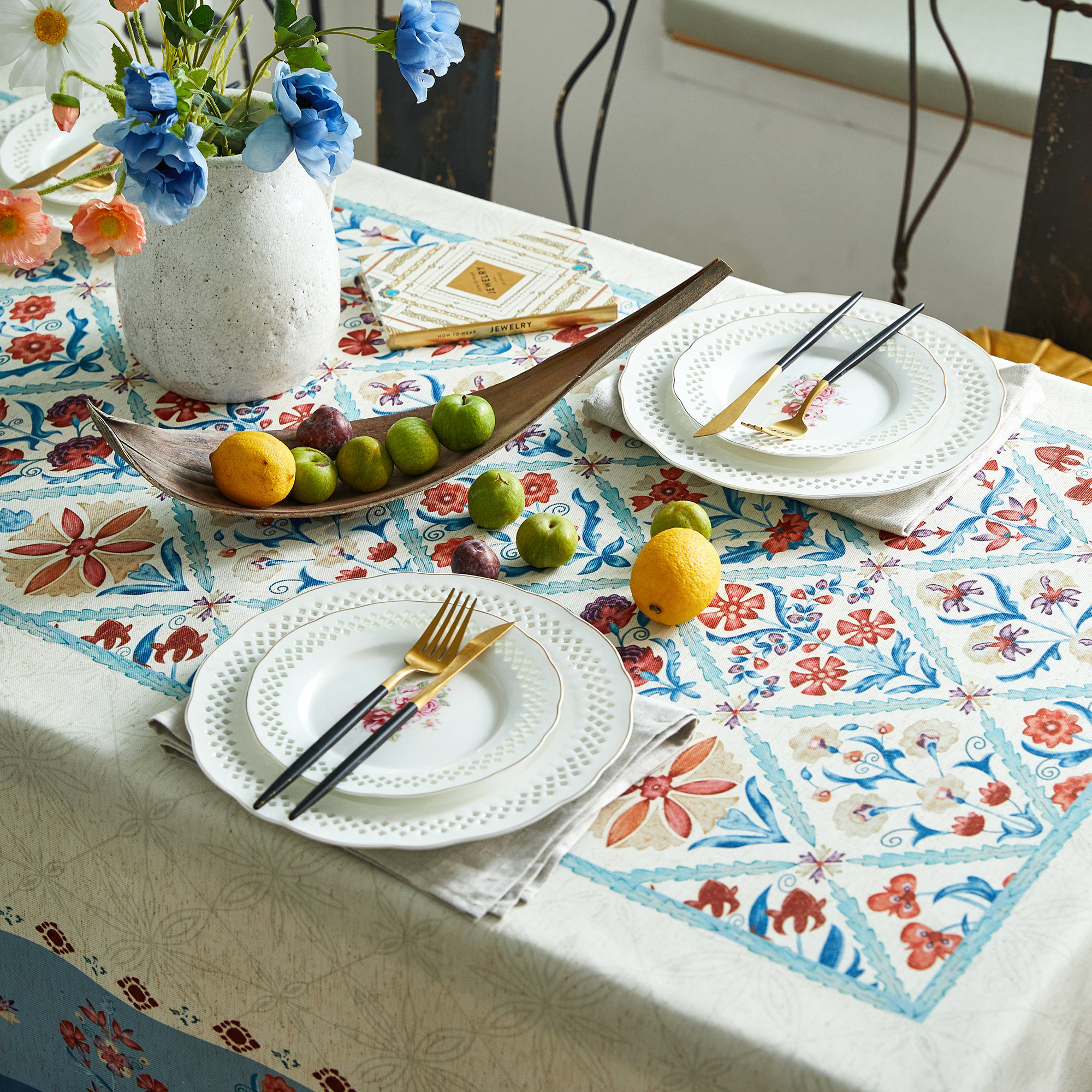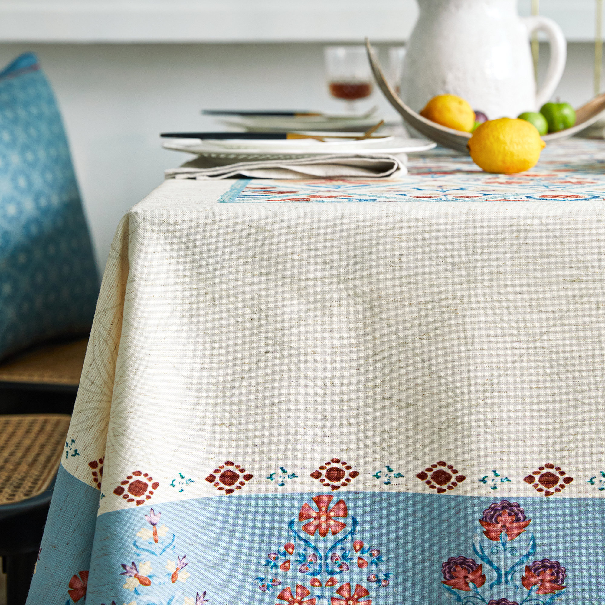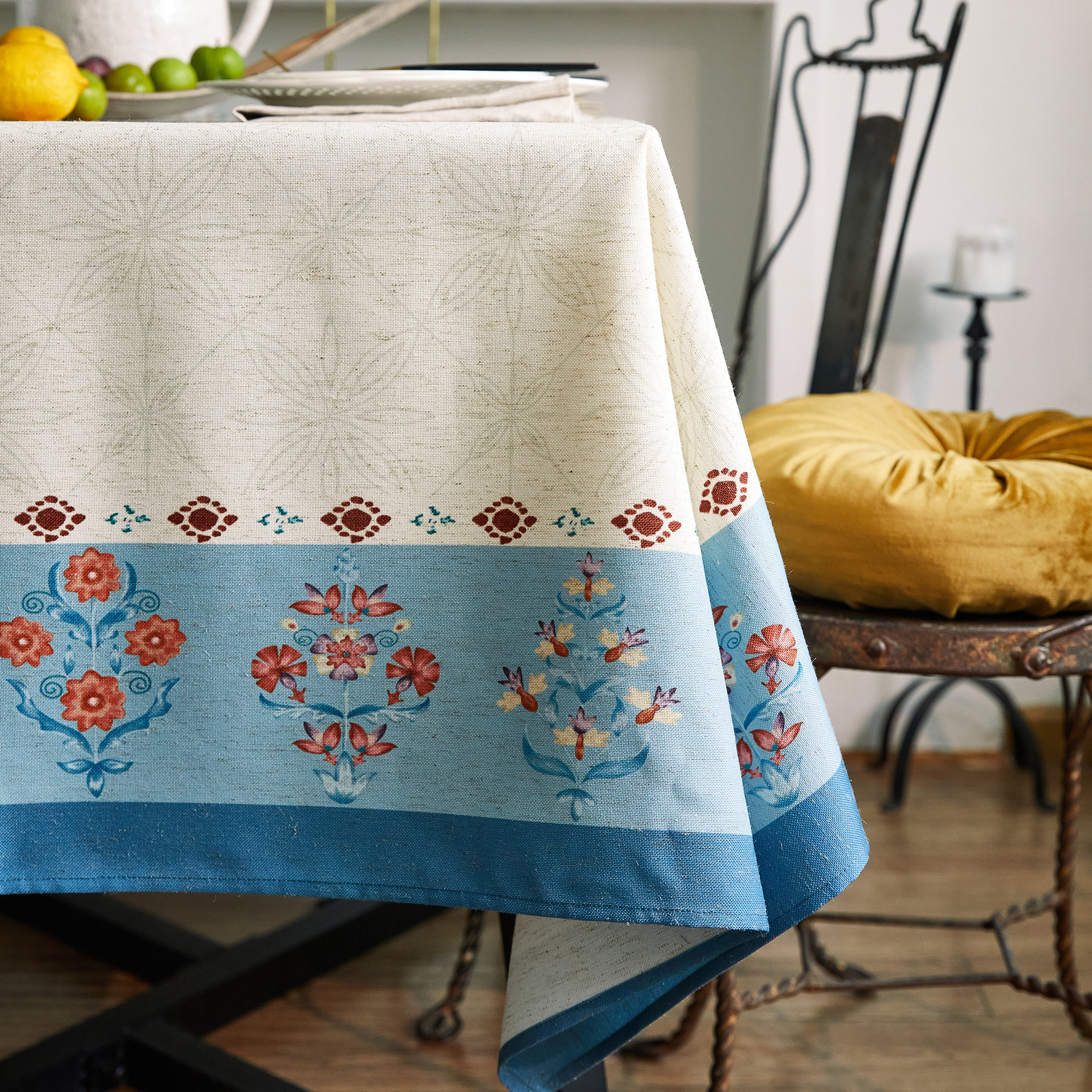 Multi-layered border: A narrow floral ribbon, a wide, misty blue border, and a dark blue binding create a clean, organized surface.