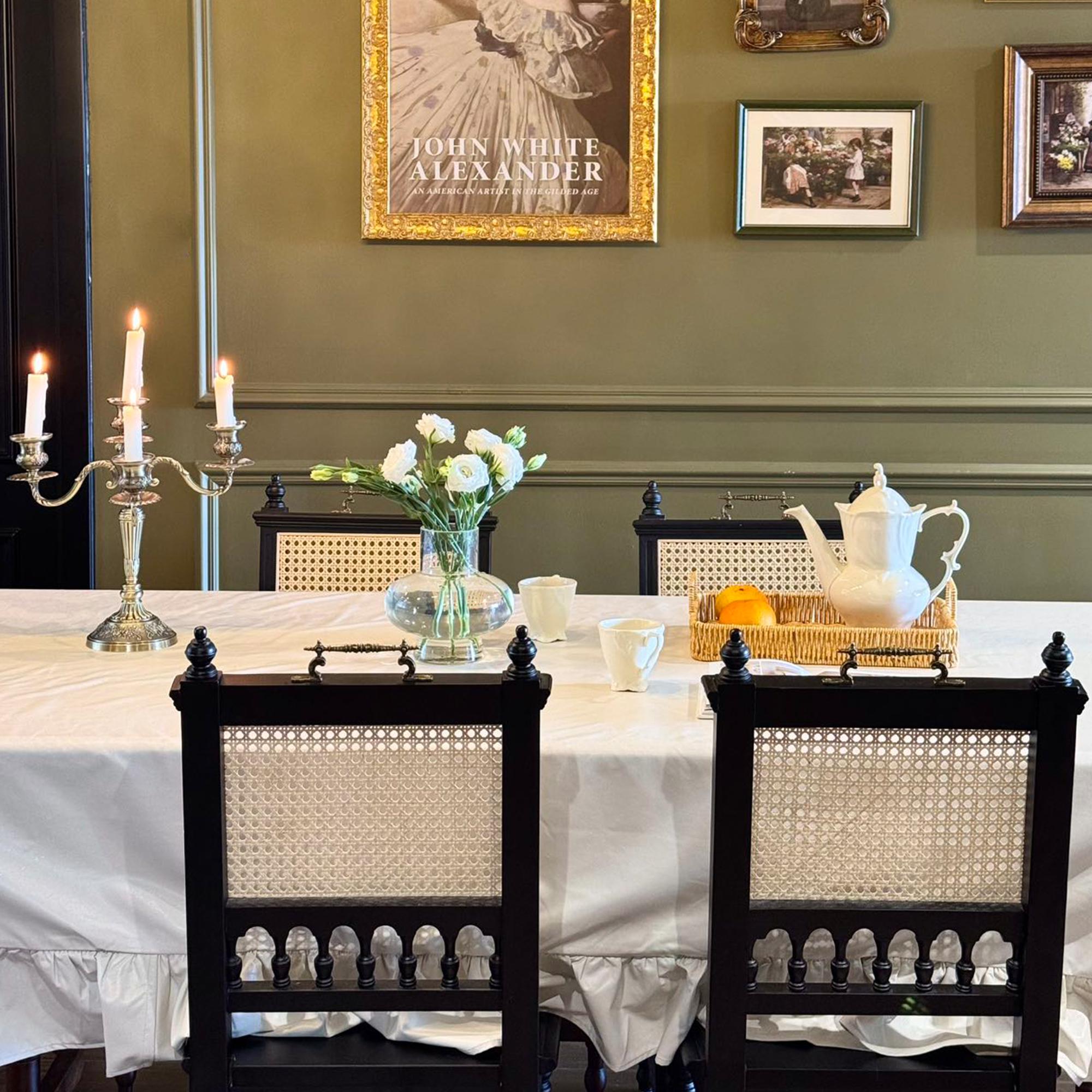 Add a light-colored table runner or rattan placemats, and accent with a vase and candles for afternoon tea or a small gathering.