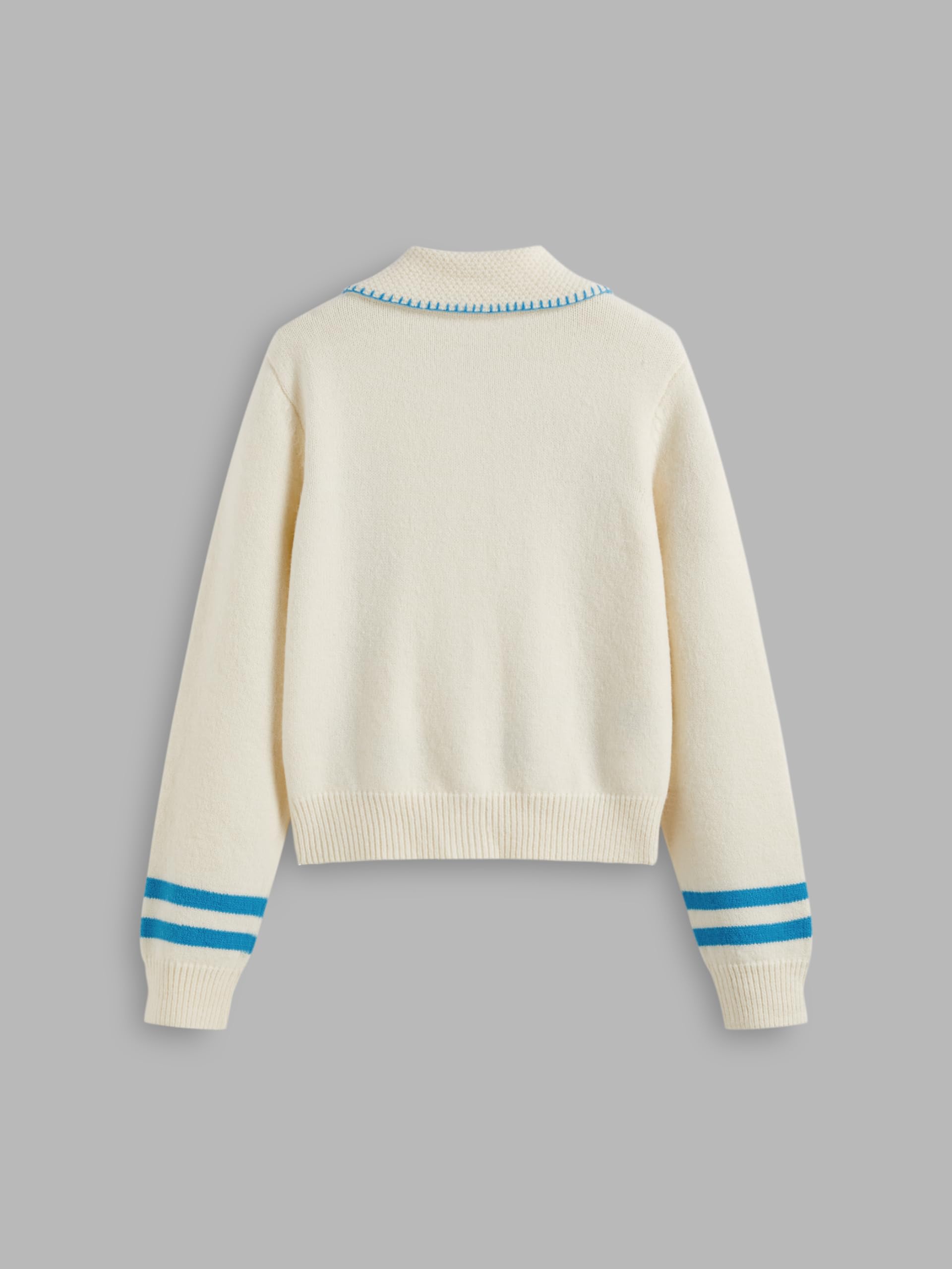 Contrasting Trim – Sky blue collar piping and double stripes on cuffs add a sporty touch