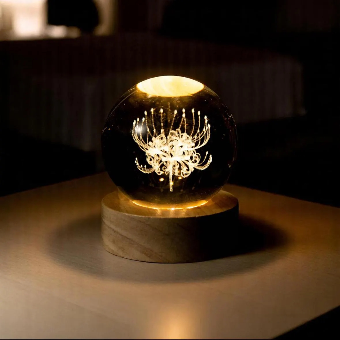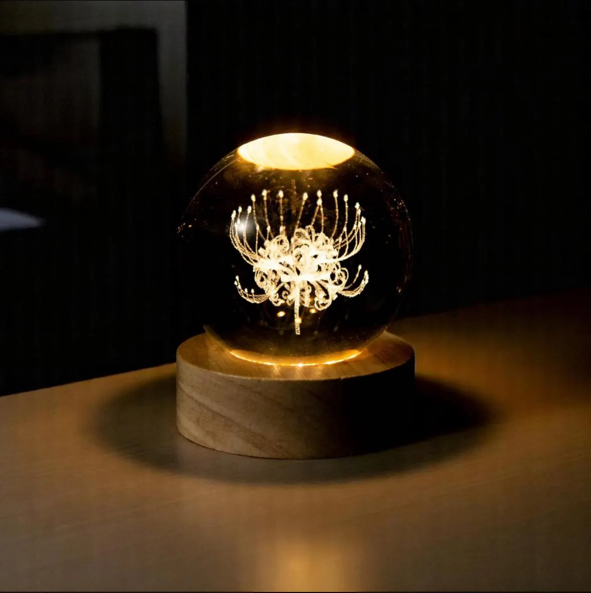Ambient Lighting: A built-in soft light source diffuses warm yellow light evenly from the bottom of the crystal ball, gently illuminating the Red Spider Lily pattern and creating a tranquil and slightly mysterious atmosphere. The soft, non-glaring light creates a subtle, romantic and mysterious atmosphere at night, resembling fireworks blooming in the dark night.