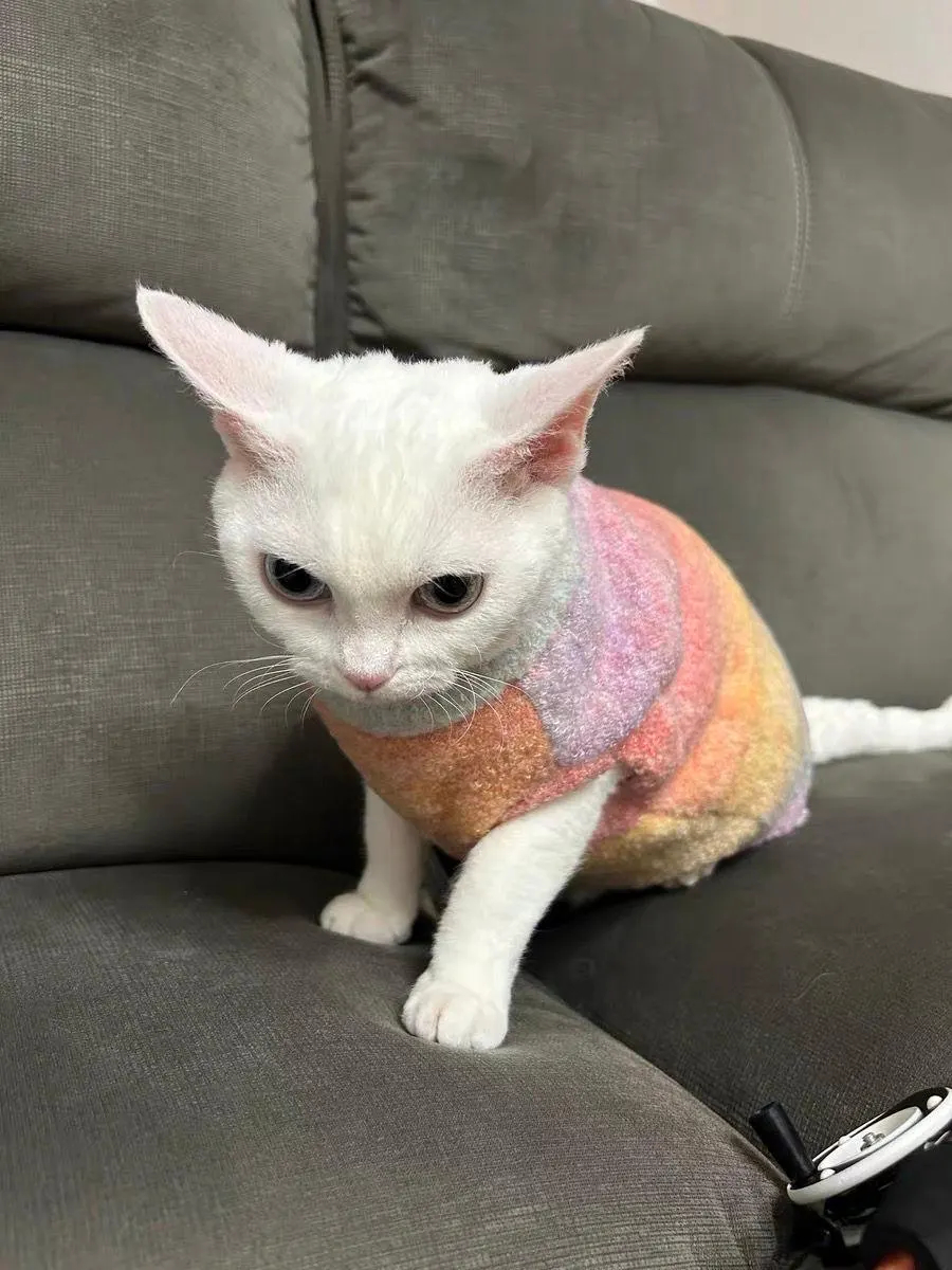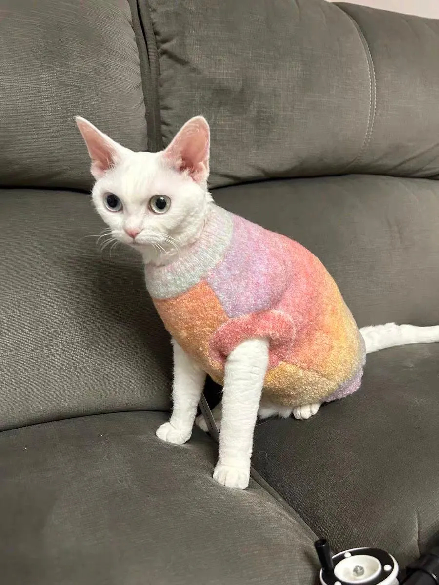 Its gradient isn’t a harsh patchwork of colors, but rather like “a sunset caressed by an evening breeze”: it gently blends from a light, misty purple at the collar, transitioning to a peachy pink in the middle, then connecting to warm orange-orange to a gentle, creamy yellow finish—each color transition has a hazy, soft feel, and the low-saturation Morandi style avoids any hint of gaudiness. Whether it’s a white-furred pet, it will make them look like they’re “covered in spring cream”; for dark-furred pets, the warm gradient balances the heaviness of the fur, making them appear more vibrant and healthy. Even if you just toss it on the sofa, the clothes themselves are “gentle color blocks that can serve as decoration.”