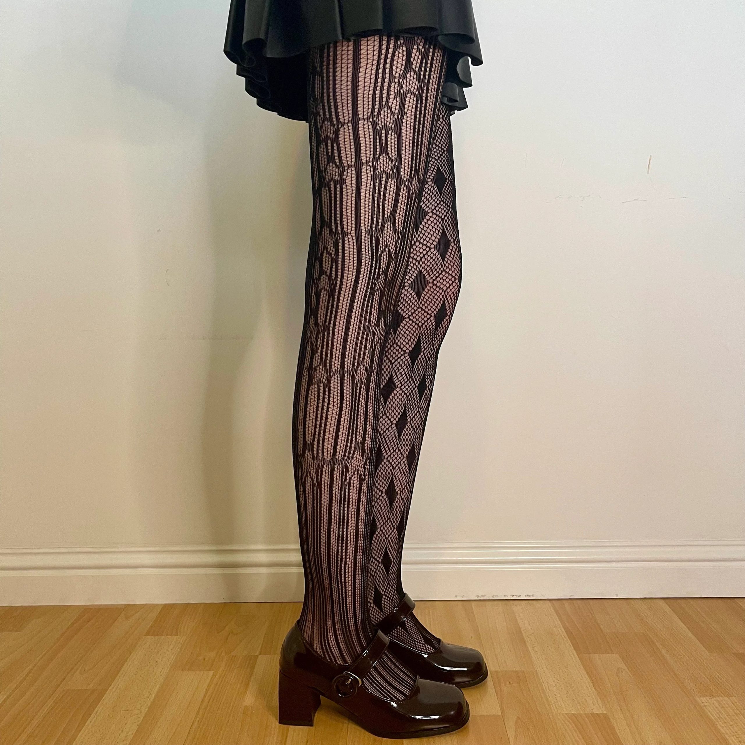 Asymmetrical contrasting patterns: Vertical lace and diamond mesh designs are featured on each leg, respectively. This dark clash of styles breaks with conventional symmetry, maximizing a unique and distinctive style, instantly elevating your outfit beyond the norm and becoming a highly recognizable style focal point.