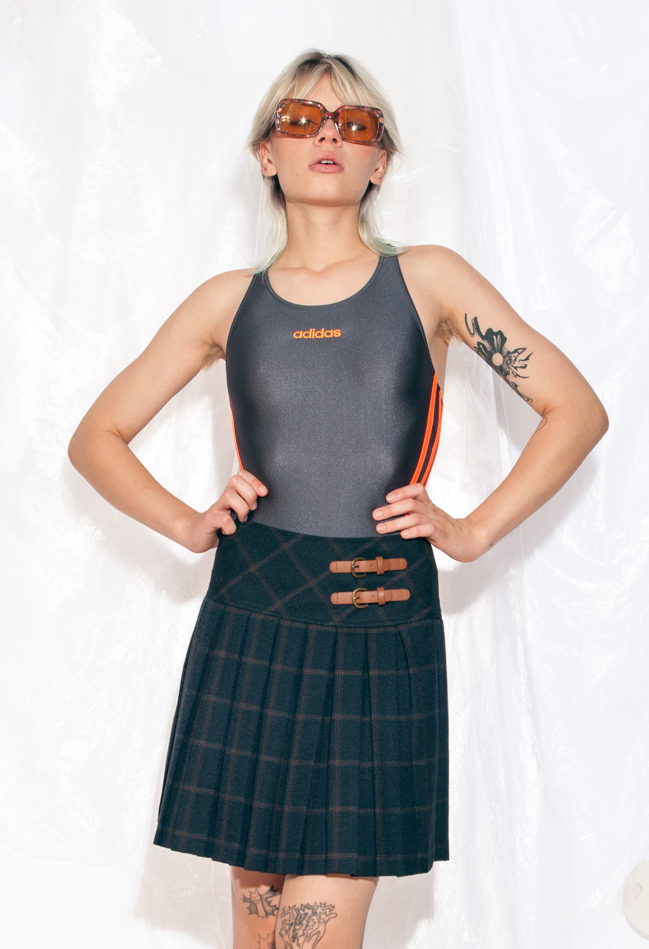 Inspired by the Scottish kilt, this miniskirt features a sculpted yoke and sharp knife pleats. The dark check adds a touch of classic elegance, while the double-buttoned sides add a modern, streetwear edge—easily styled with a T-shirt, sneakers, a sweater, and boots.