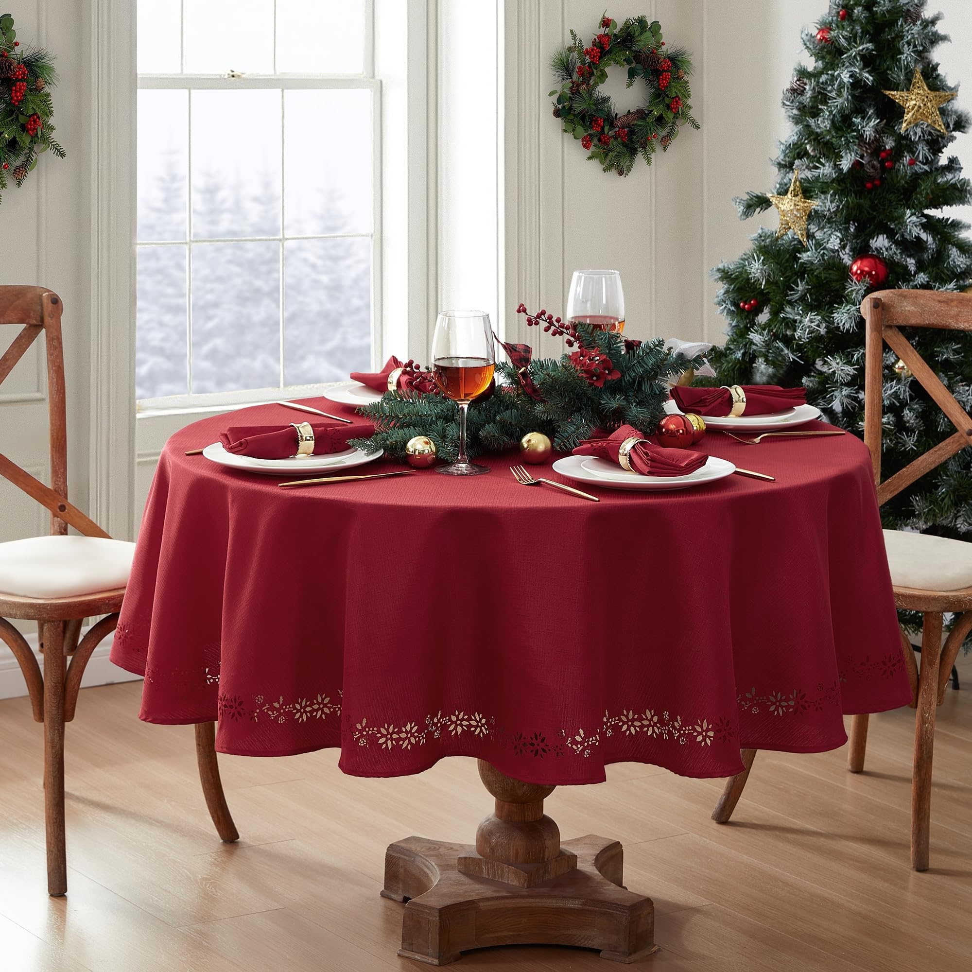 This elegant and festive crimson tablecloth adds a touch of sophisticated holiday charm to your tablescape. Its delicate laser-cut snowflake border and rich color create a warm and sophisticated winter atmosphere.