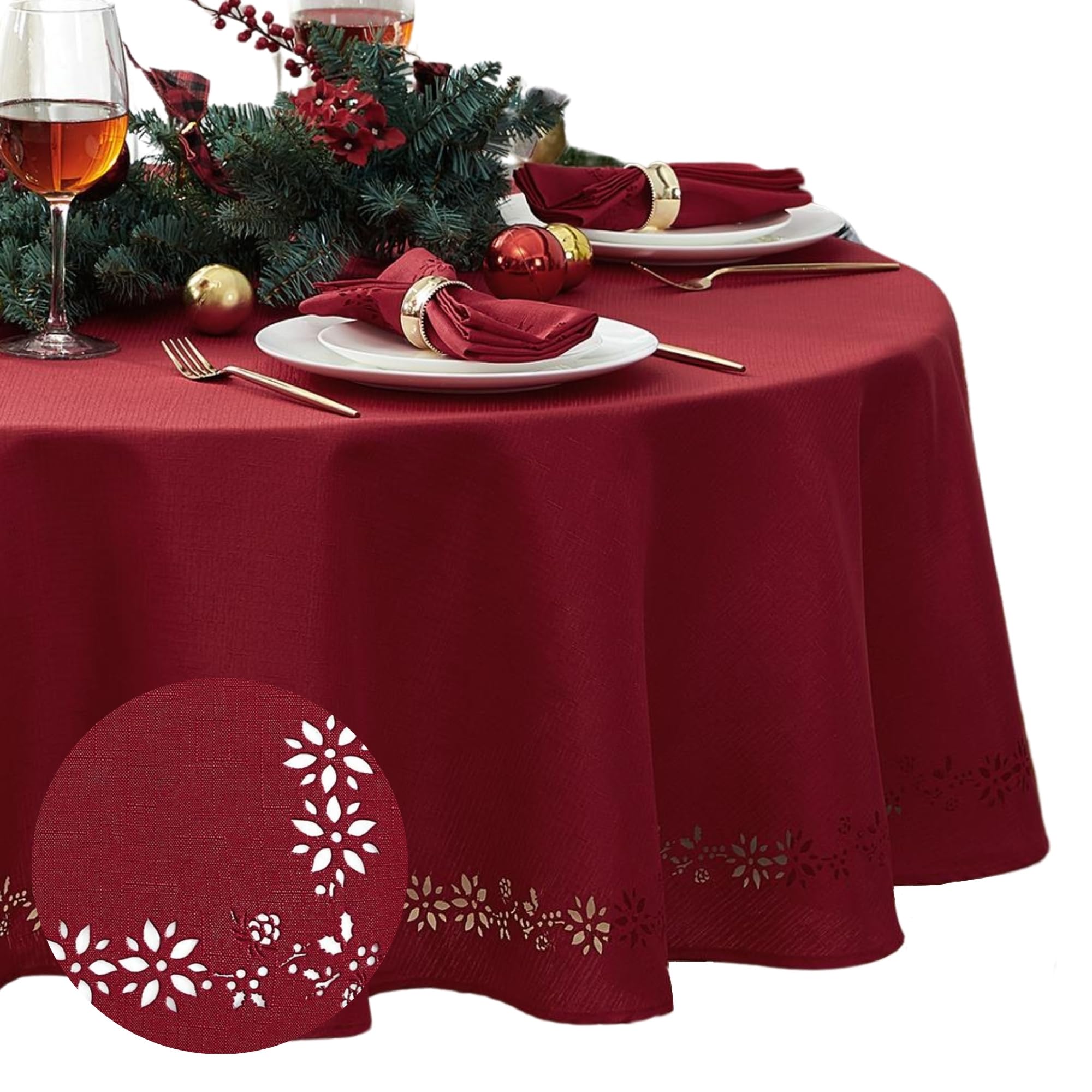 The hem of this tablecloth features delicate snowflake and floral cutouts, creating an elegant border that catches the light beautifully. The crimson hue evokes the warmth of a winter night and complements a variety of holiday themes—from classic Christmas decor to sophisticated seasonal celebrations.