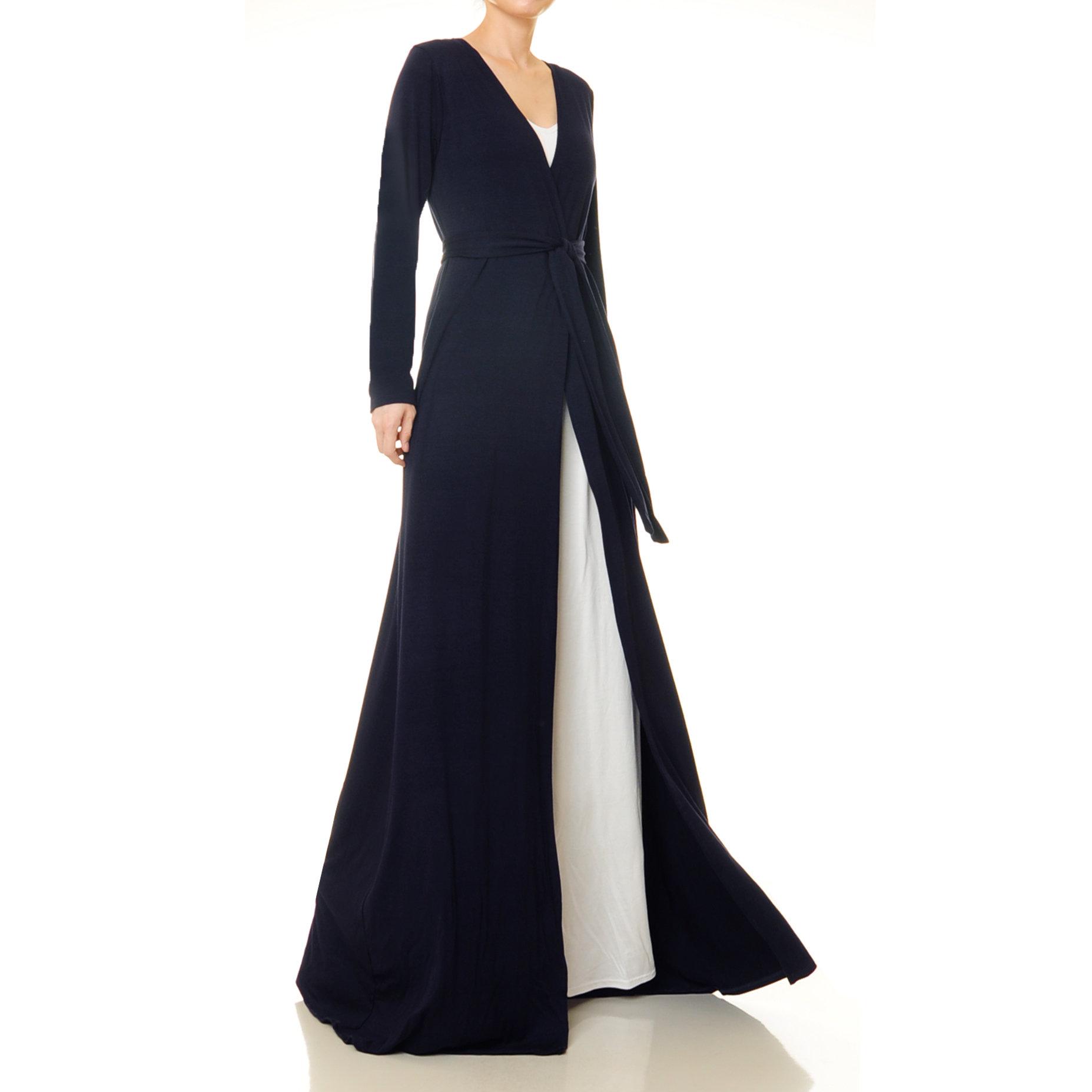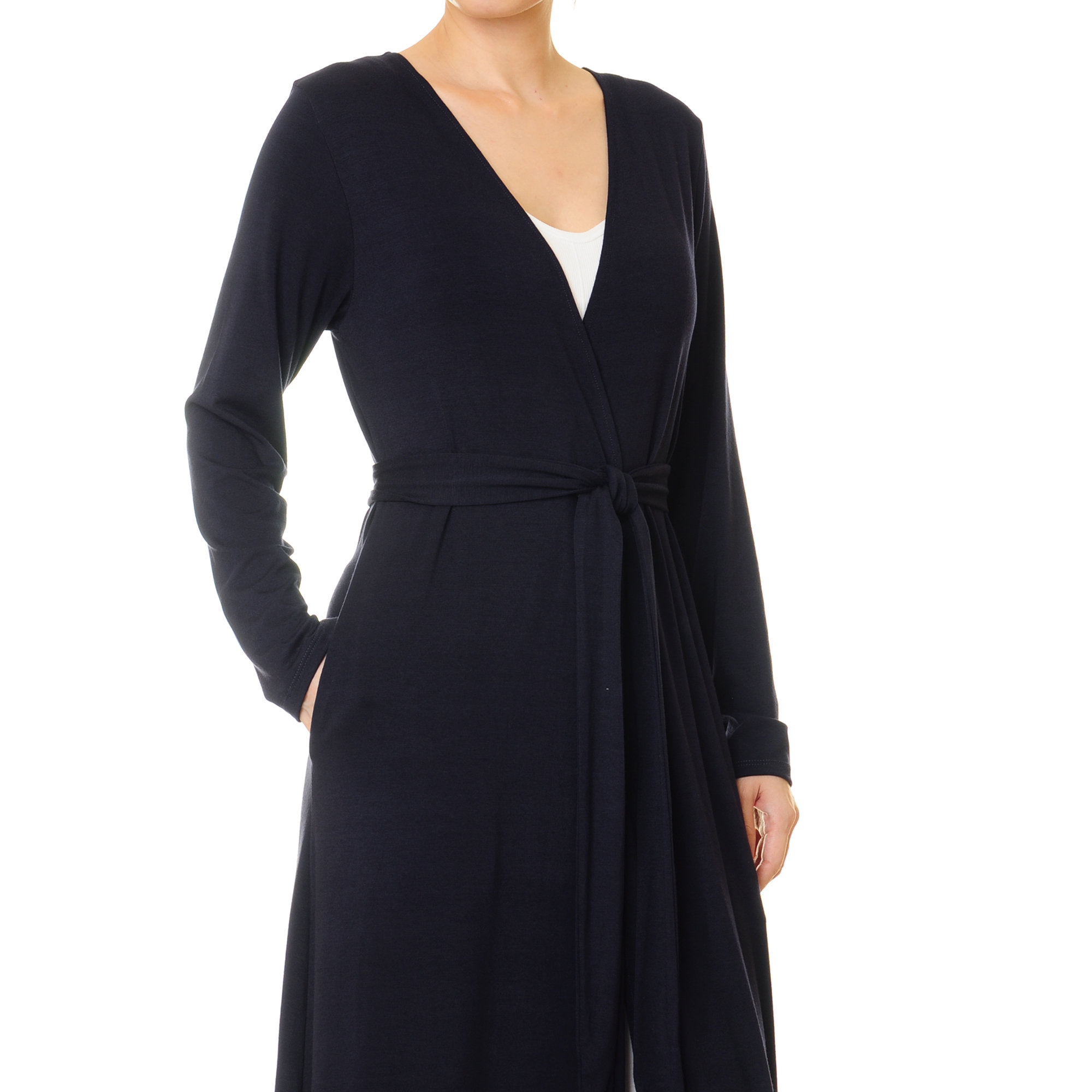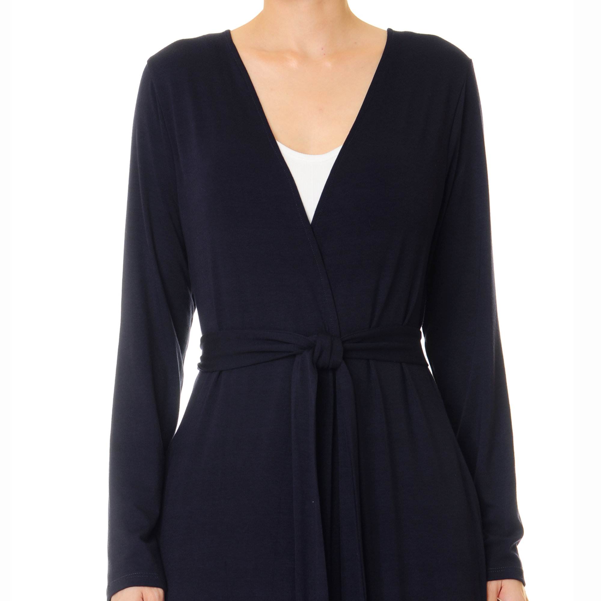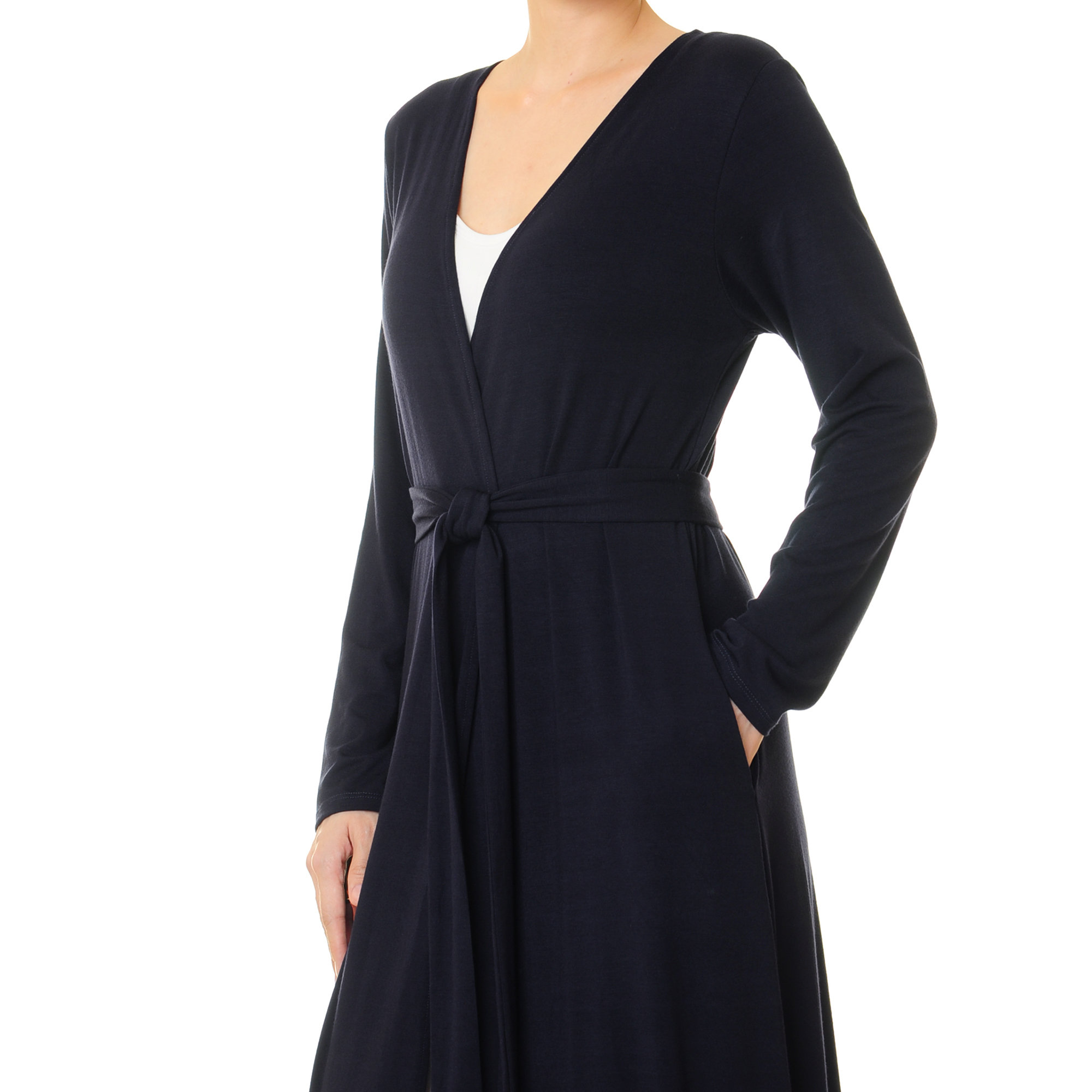 This deep navy robe features a minimalist wrap construction: a flattering V-neck and a built-in waist tie for an adjustable fit. The long hem sways with your steps, creating an elegant, vertically proportioned look. Pair it with a white base layer for a striking contrast, or layer it with tonal pieces for a sophisticated monochromatic look. It’s perfect for everything from commuting to evening getaways.