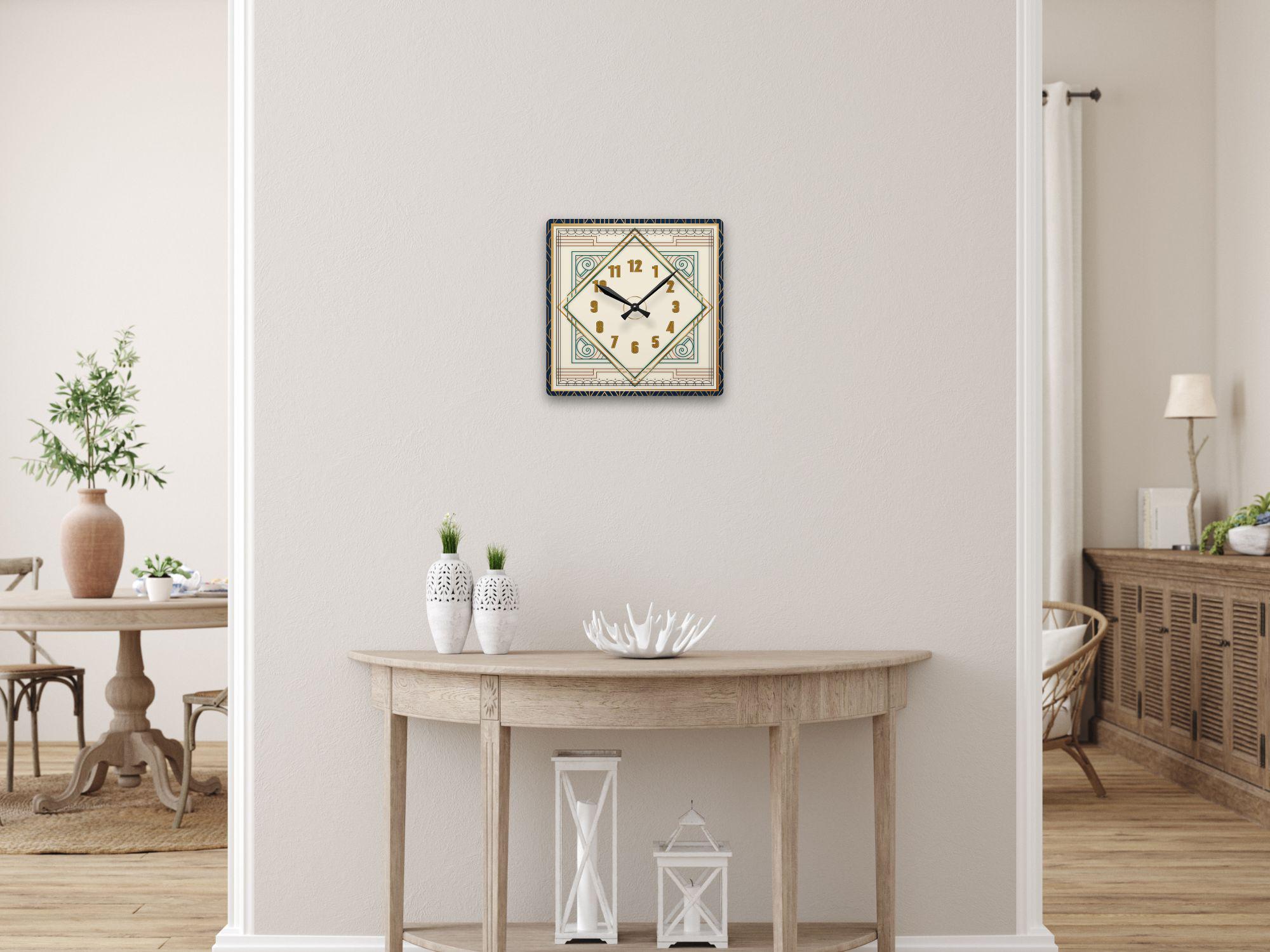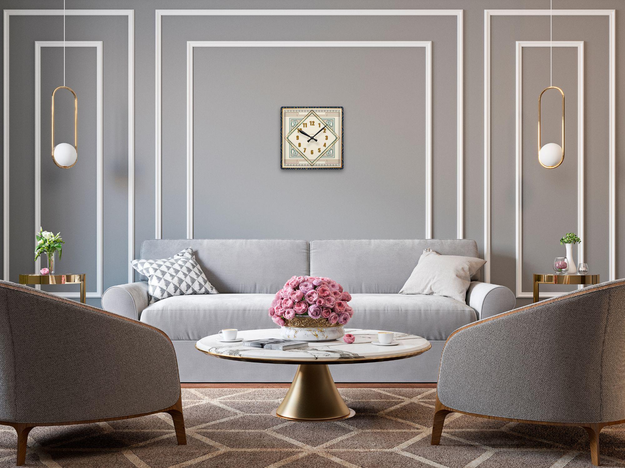 This clock, designed with Art Deco style at its core, blends a nested diamond structure with contrasting blue and gold elements. It serves not only as a precise timekeeping tool but also as an artistic piece of interior design that infuses a space with a touch of understated luxury and retro charm.