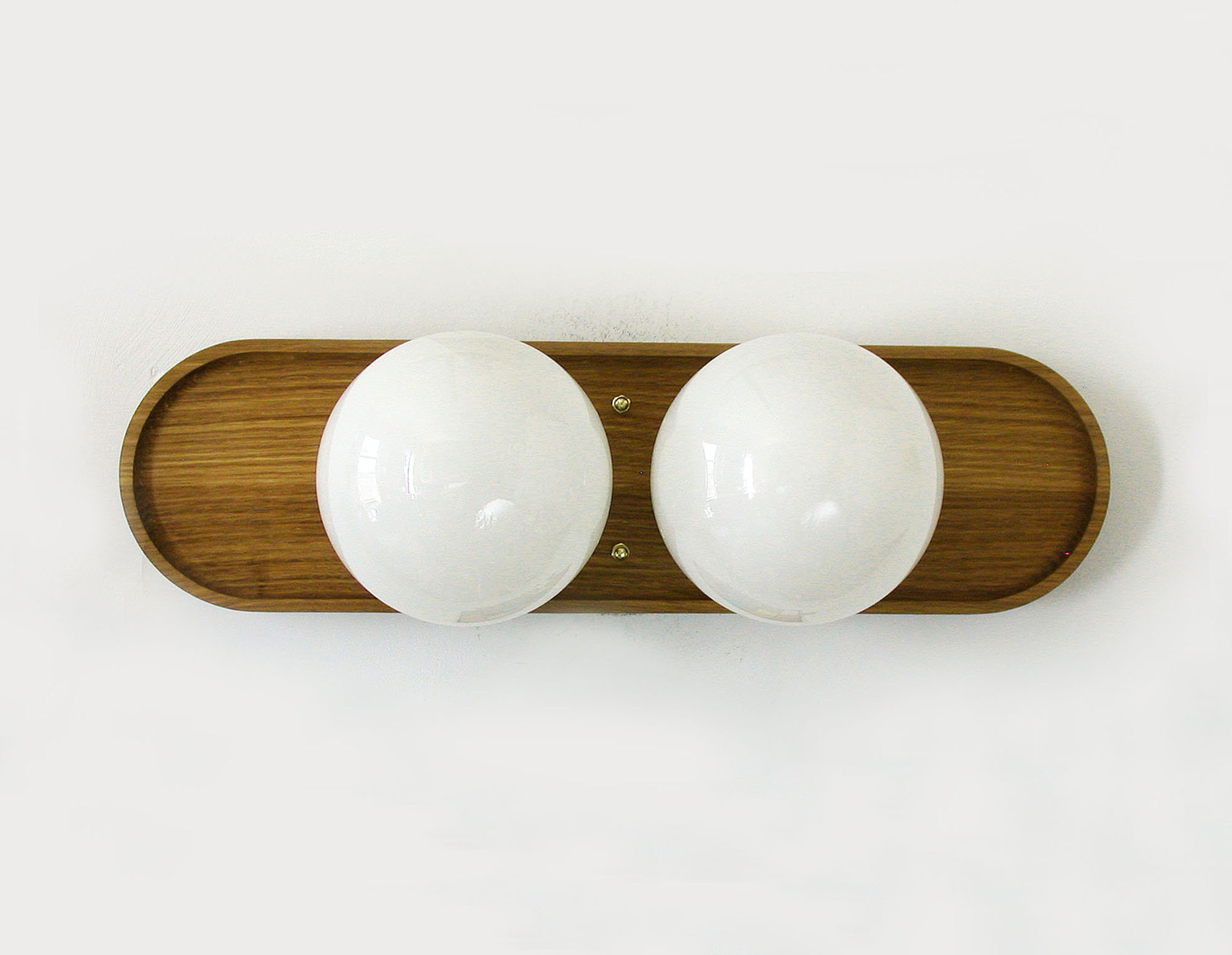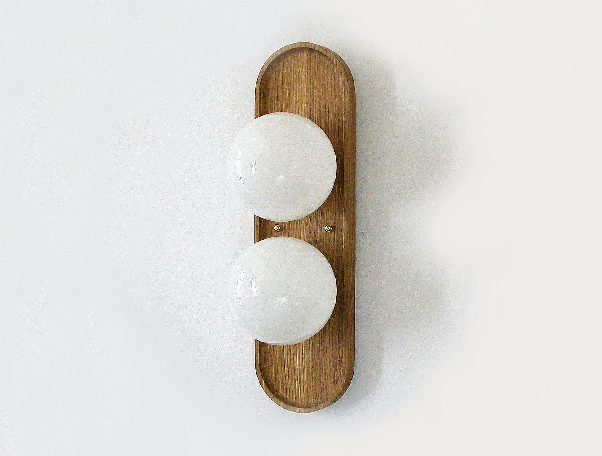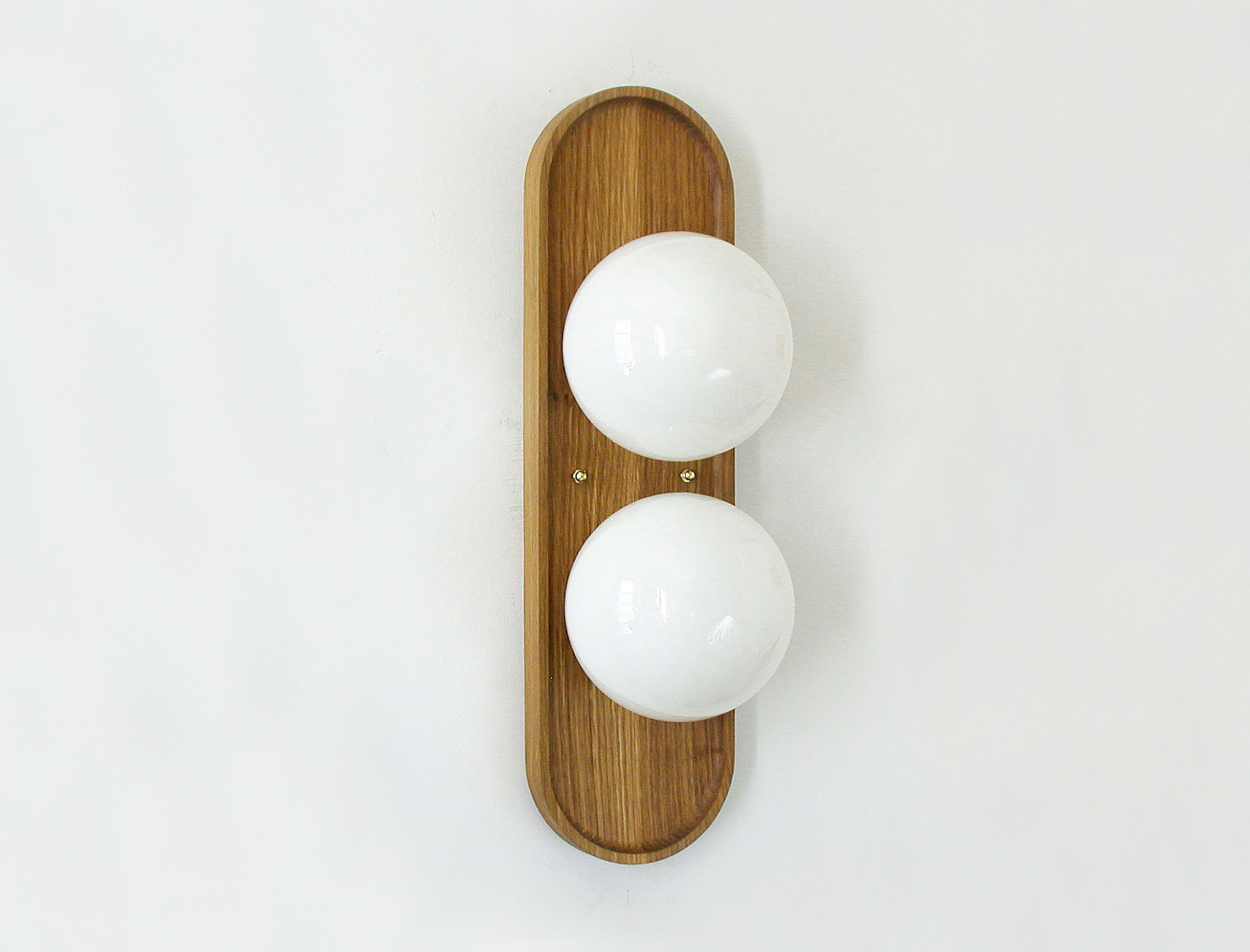 — The slender, oval-shaped “tray” back panel is crafted from warm wood and features two vertically arranged opalescent globes, creating a soft, glare-free, diffused effect.