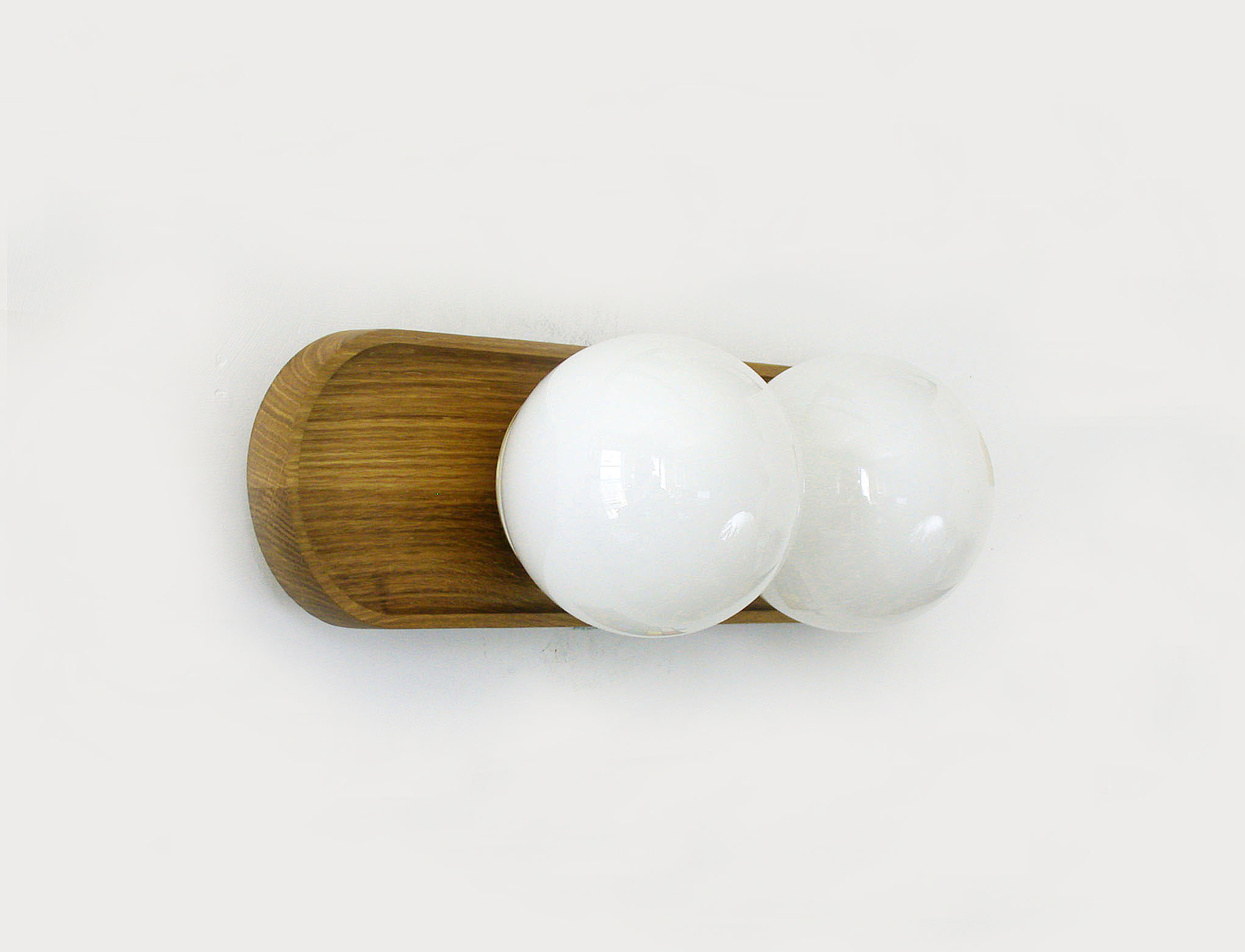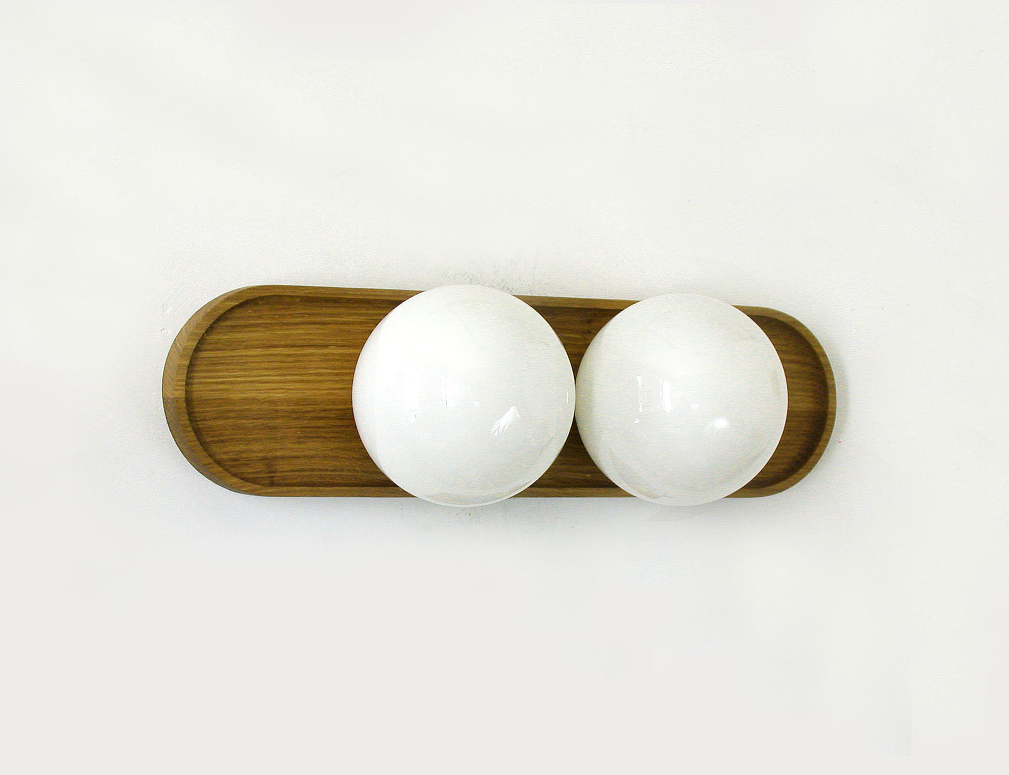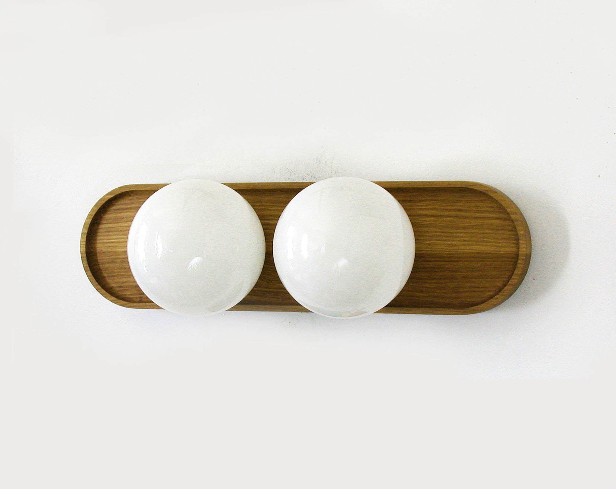 — The slender, oval-shaped “tray” back panel is crafted from warm wood and features two vertically arranged opalescent globes, creating a soft, glare-free, diffused effect.
