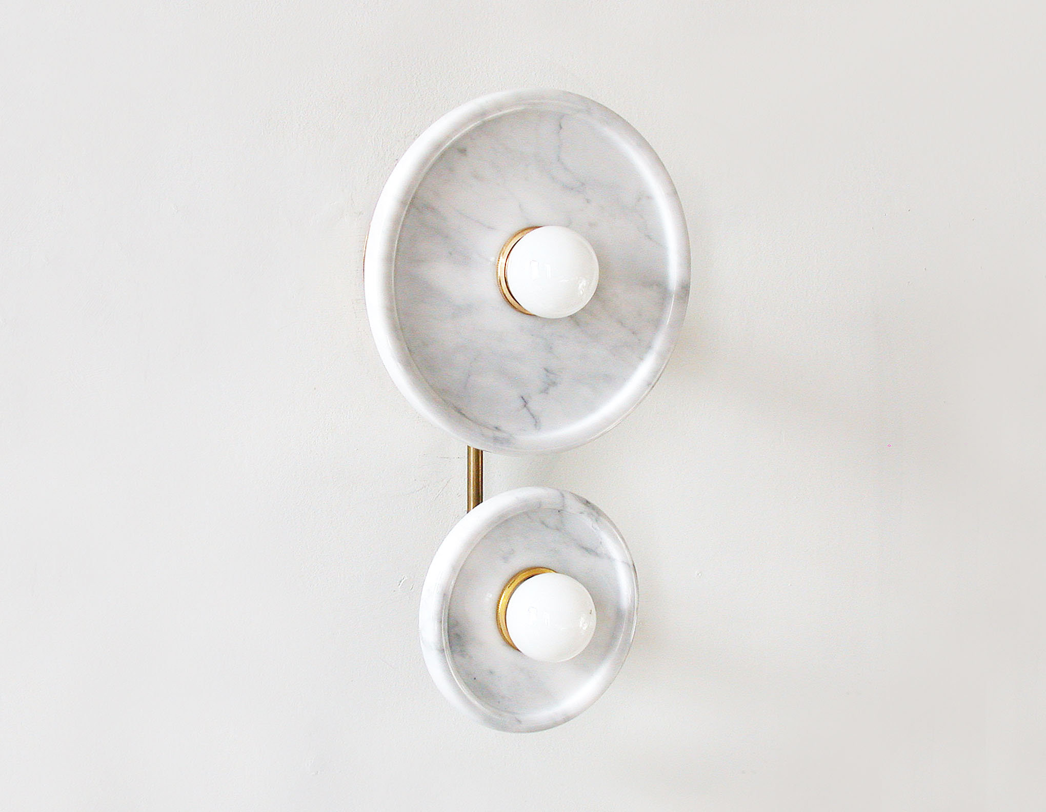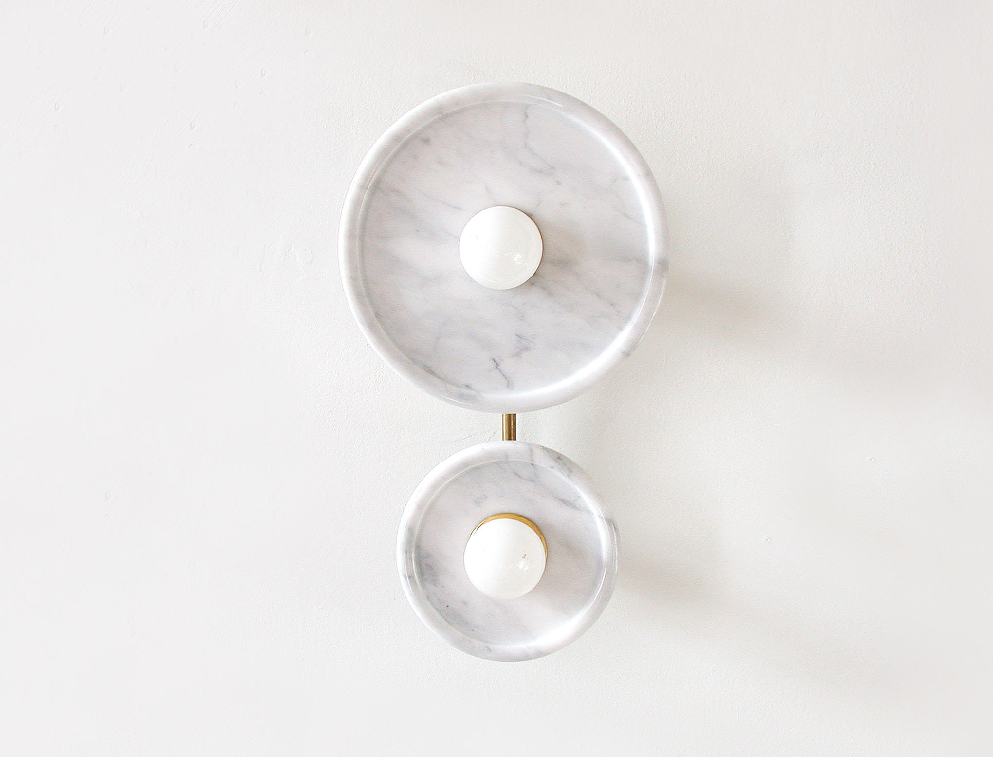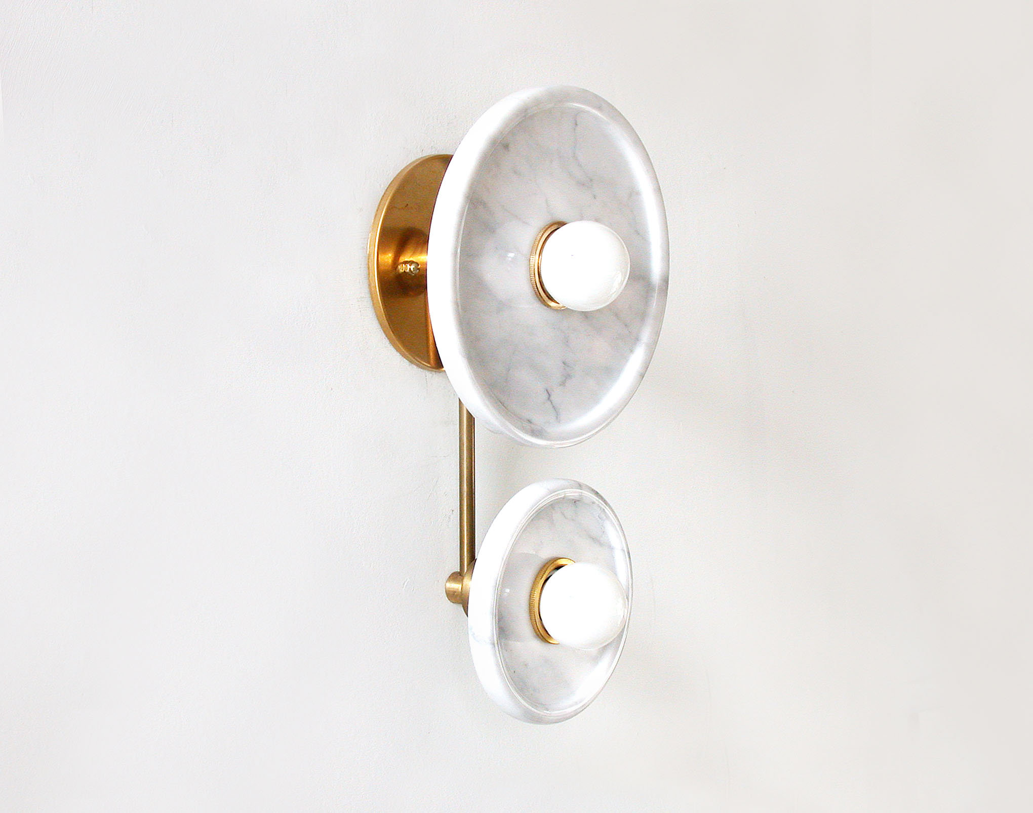 Two polished marble “dish-shaped” panels (one large, one small) are arranged on slender brass supports. Each panel has an opalescent light bulb in the center, creating a soft, glare-free diffused effect. – A layered, gallery-like composition creates a light, architectural feel; the light gray texture emits a subtle glow when lit.