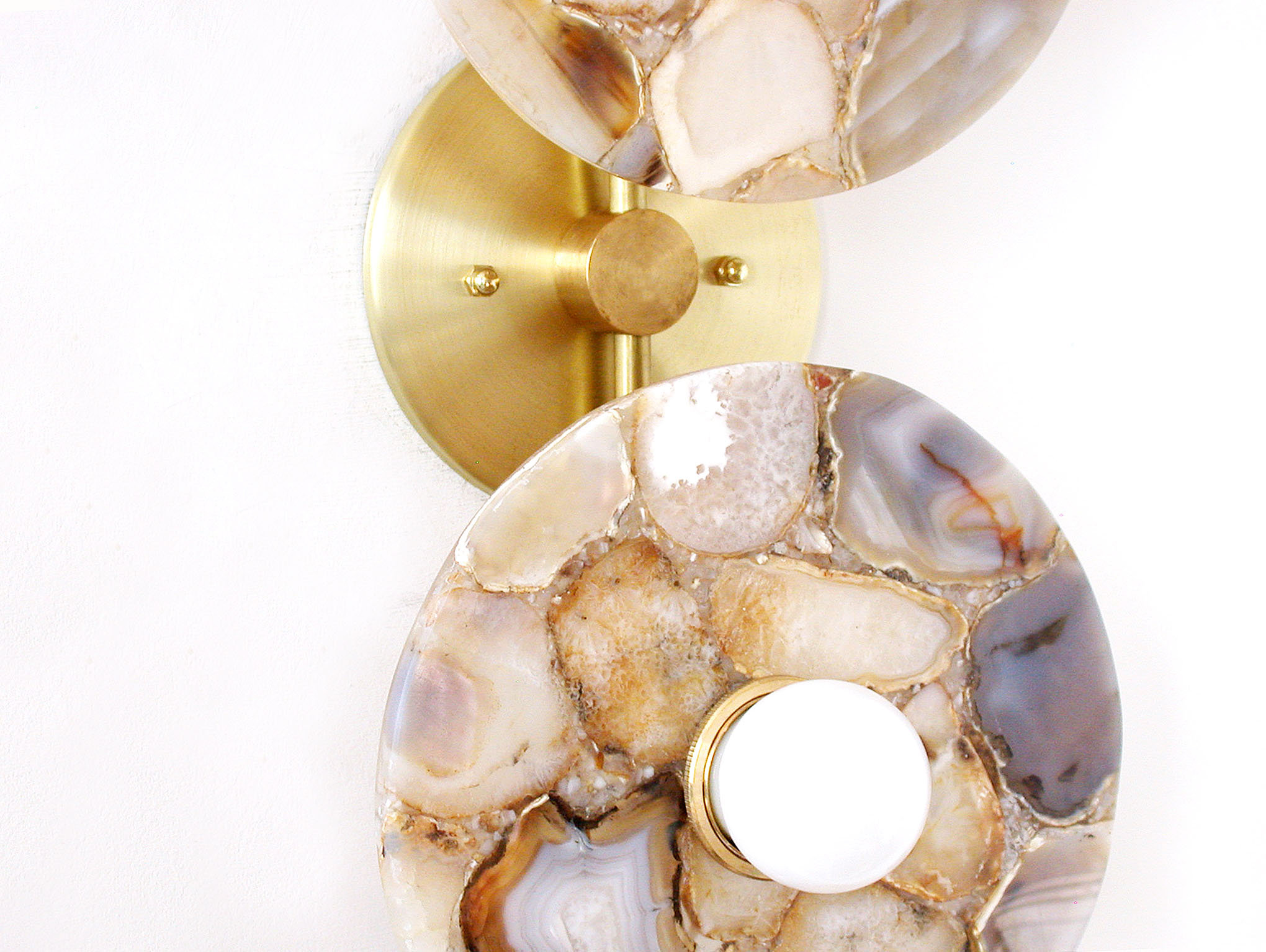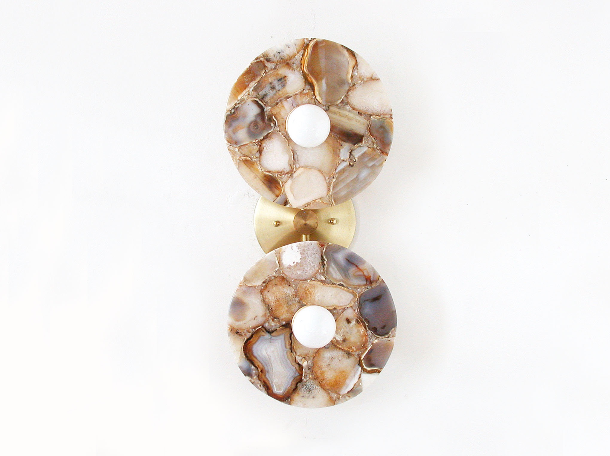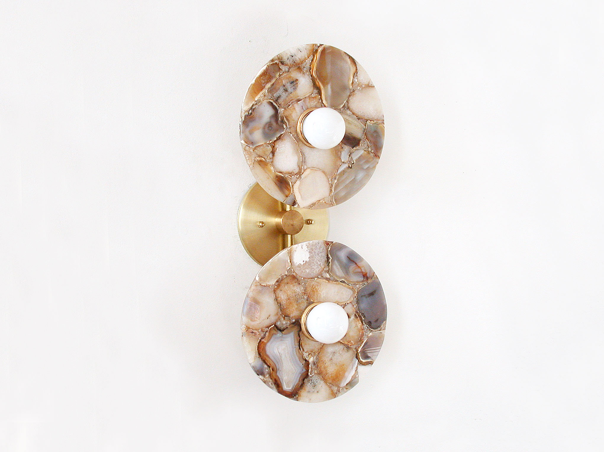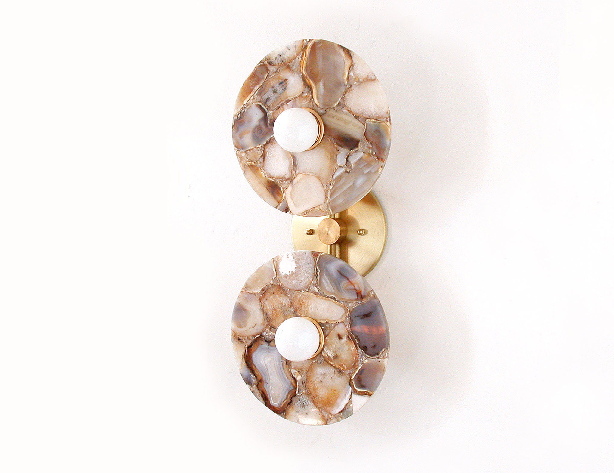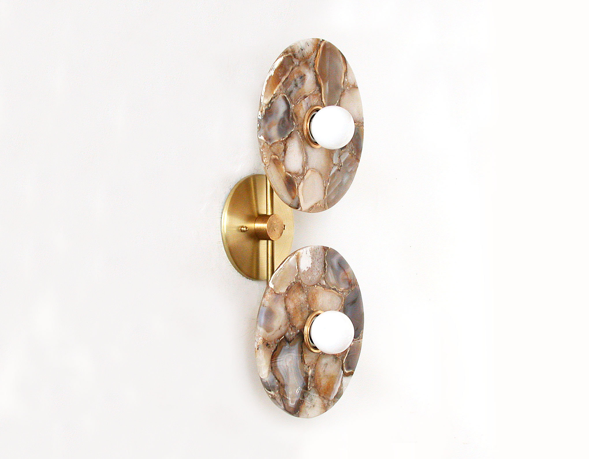 Two round agate “donut” discs are set in a brass center, each housing an opal bulb, creating a soft, glare-free, diffused effect. A natural agate mosaic, accented with translucent bands and crystal pockets, radiates a rich glow when lit—each panel is unique. The wide, airy shade is suitable for vanities and feature walls while maintaining a bright visual effect. Compatible with mainstream LED bulbs (warm white or neutral white is recommended), it offers energy savings and natural color rendering.