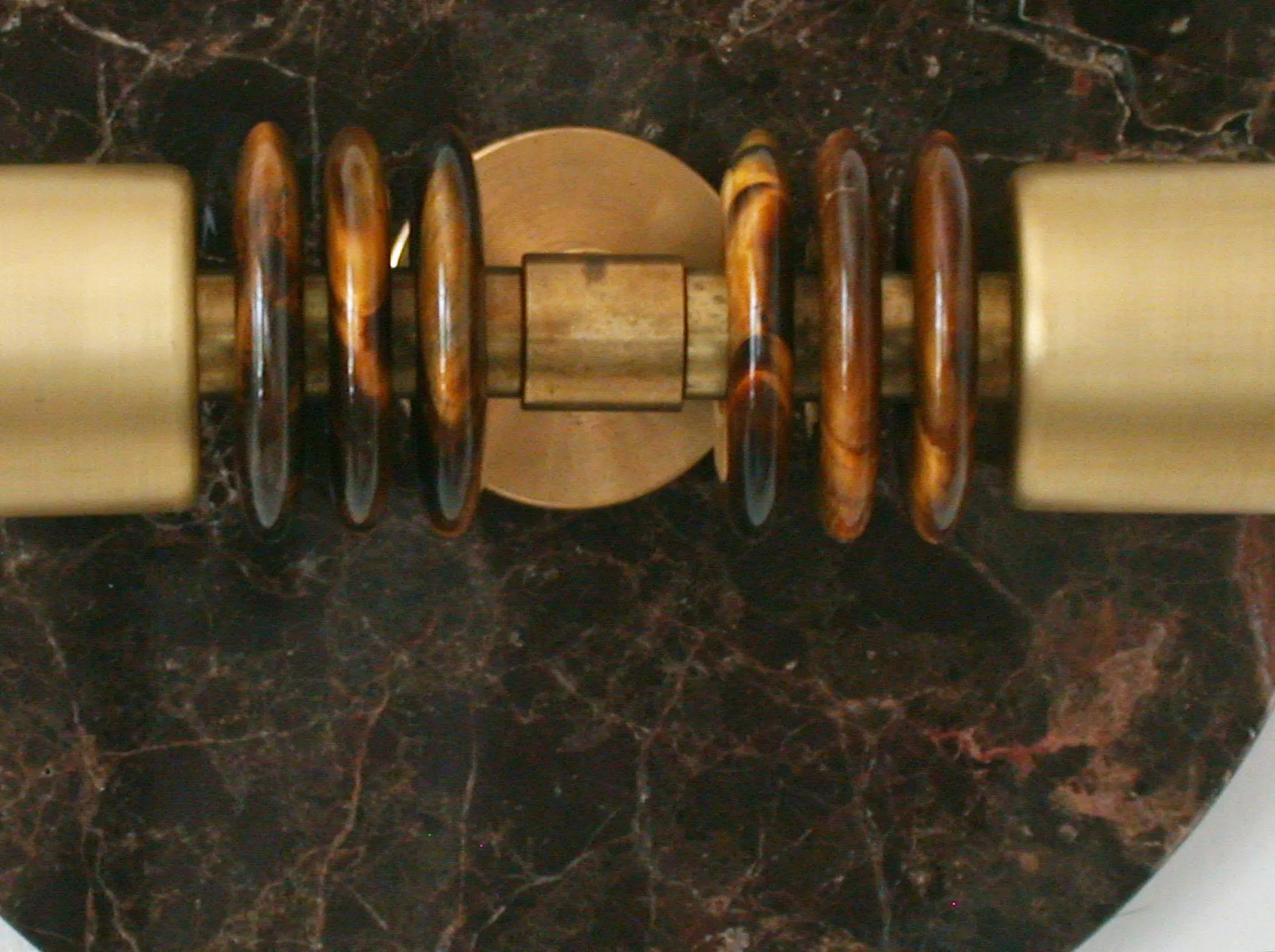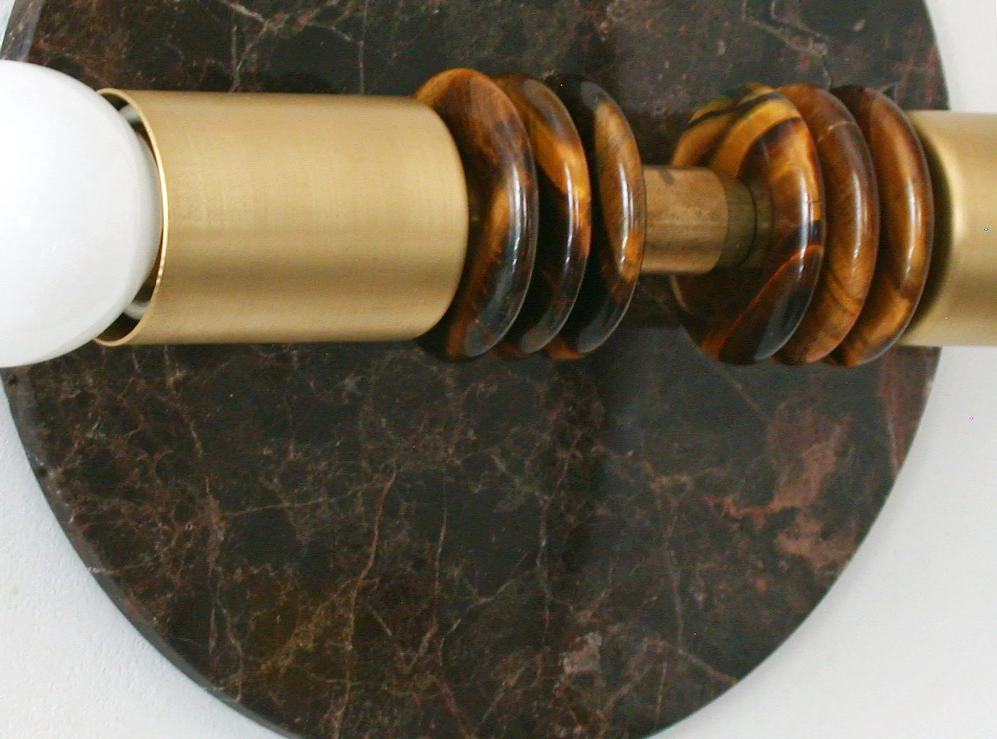 – Twin opaline globes: The frosted finish evenly illuminates both sides, softening hotspots. Stacked decorative ring: Amber/brown discs surround the center, creating a tactile contrast and a luxurious feel.