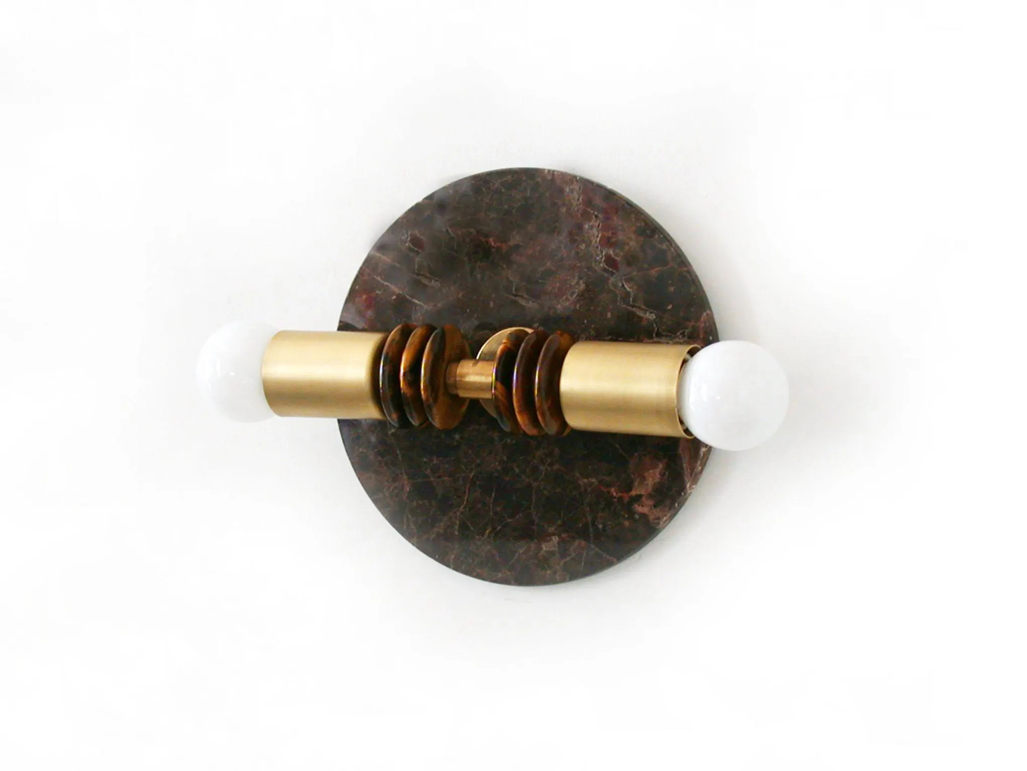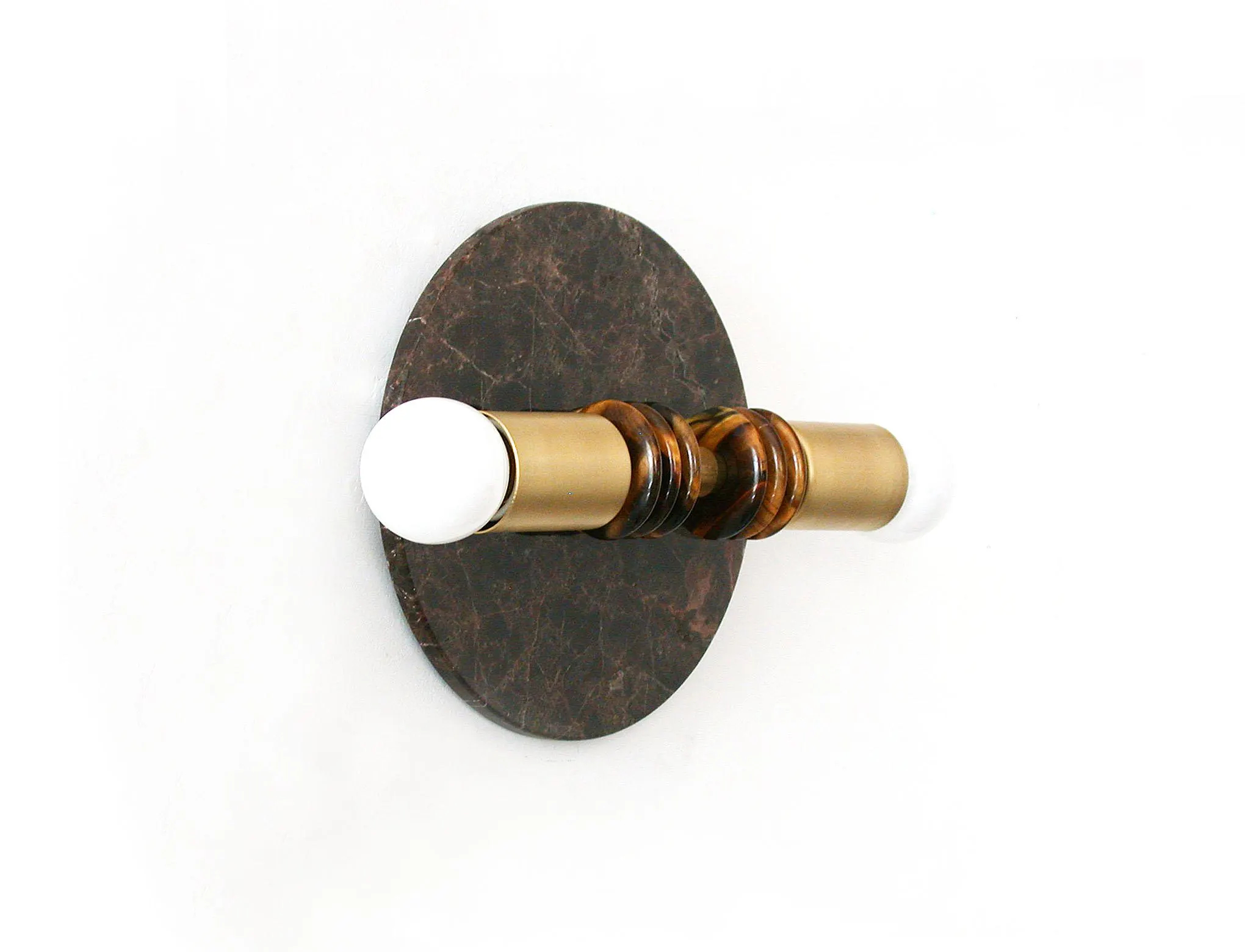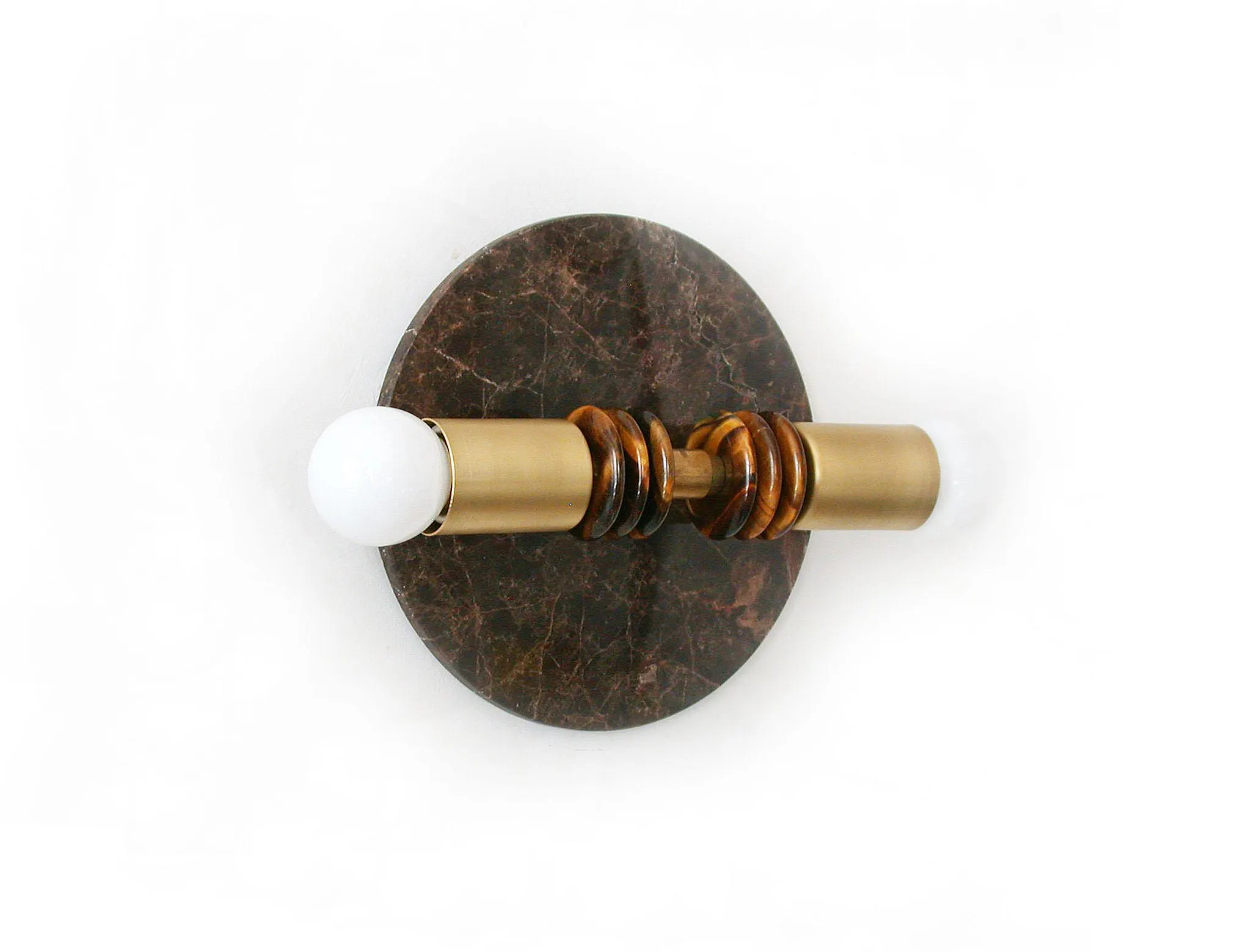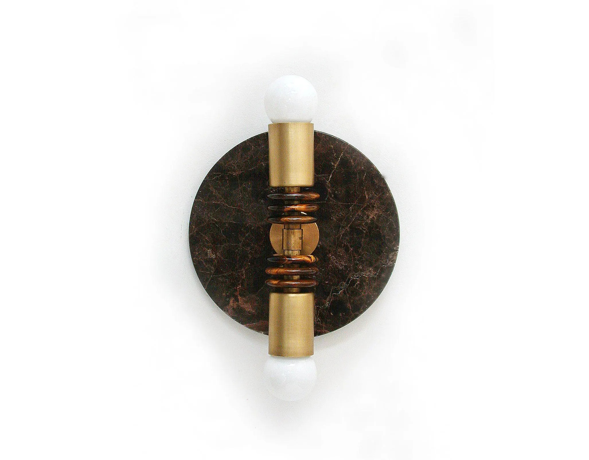 — A round dark marble back panel anchors a horizontal brass bar, topped by two opaline globes, providing soft, glare-free illumination on either side.