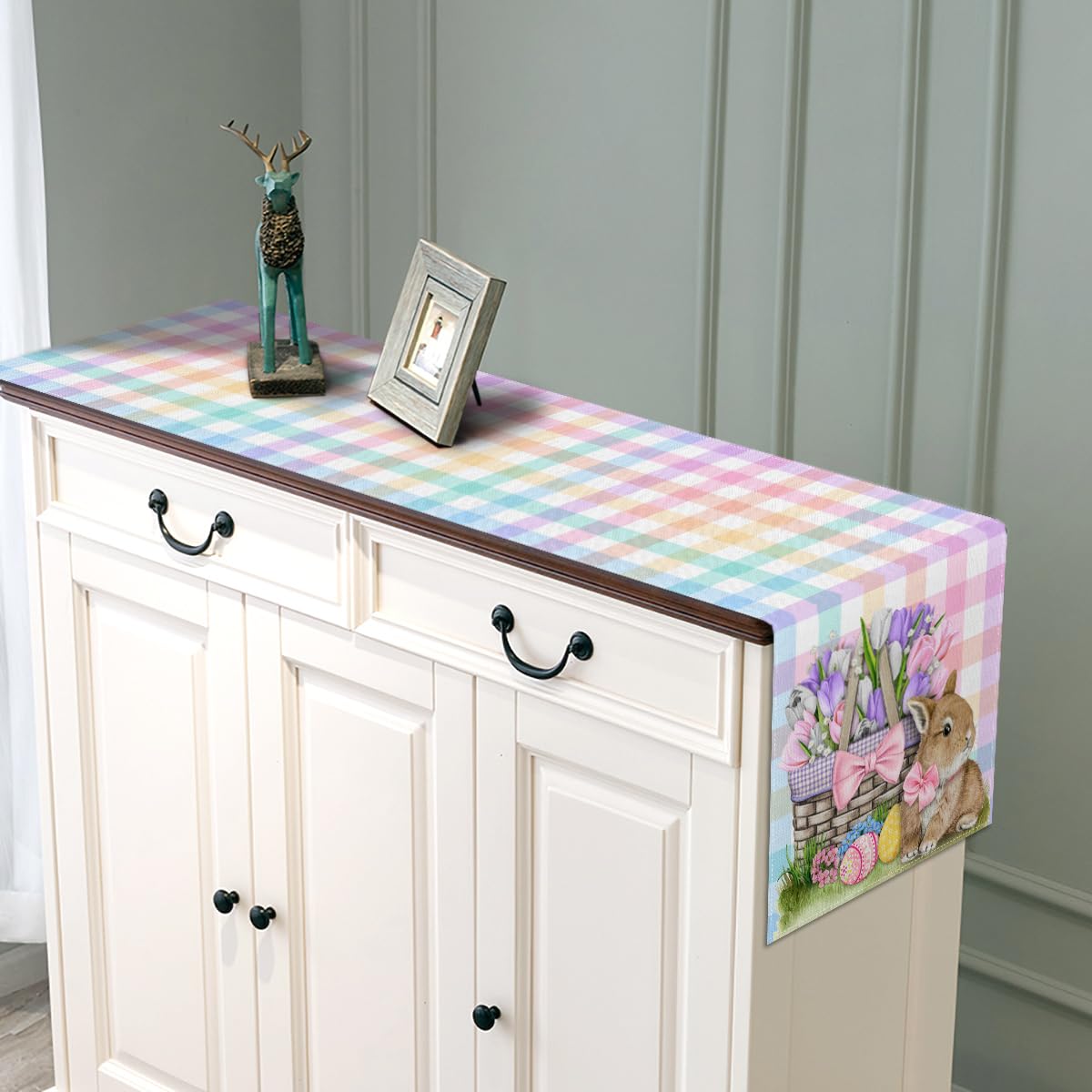 Welcome spring with this charming Easter table runner. A soft plaid background features adorable bunnies, a tulip basket tied with ribbons, and colorful eggs, creating a perfect seasonal accent for your table. The linen-like polyester blend offers the comfort of natural fibers, durability, and easy care, perfect for a busy kitchen and holiday entertaining.