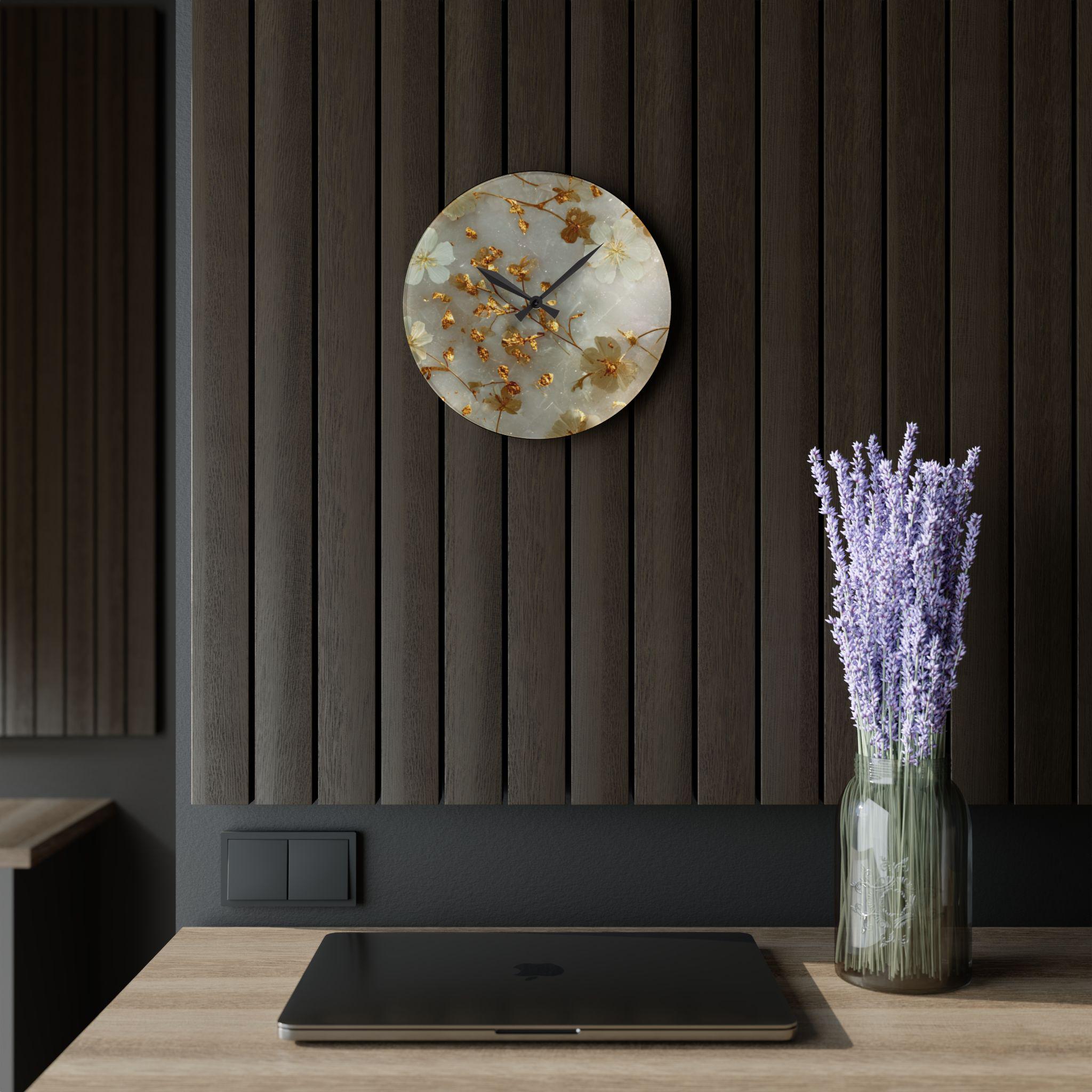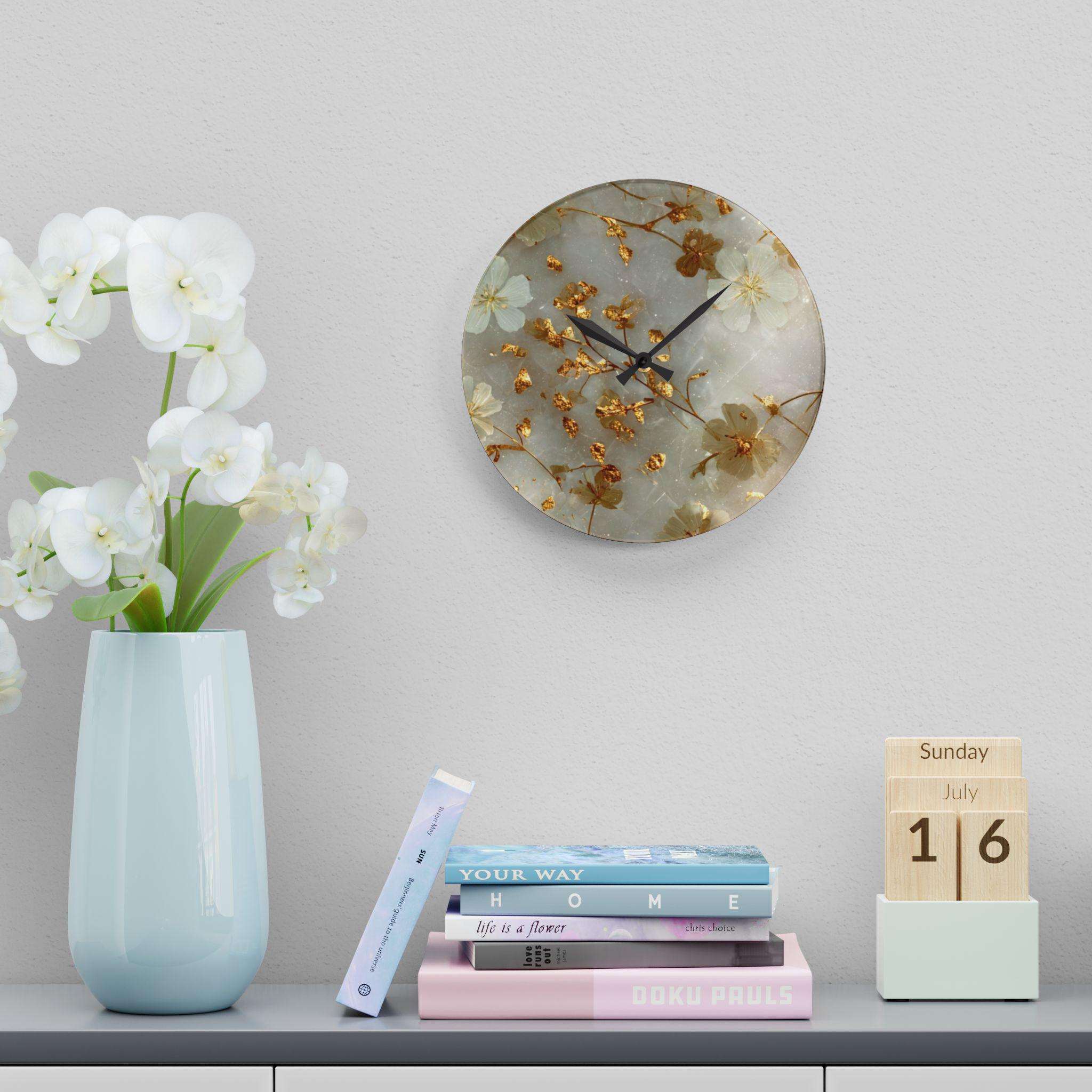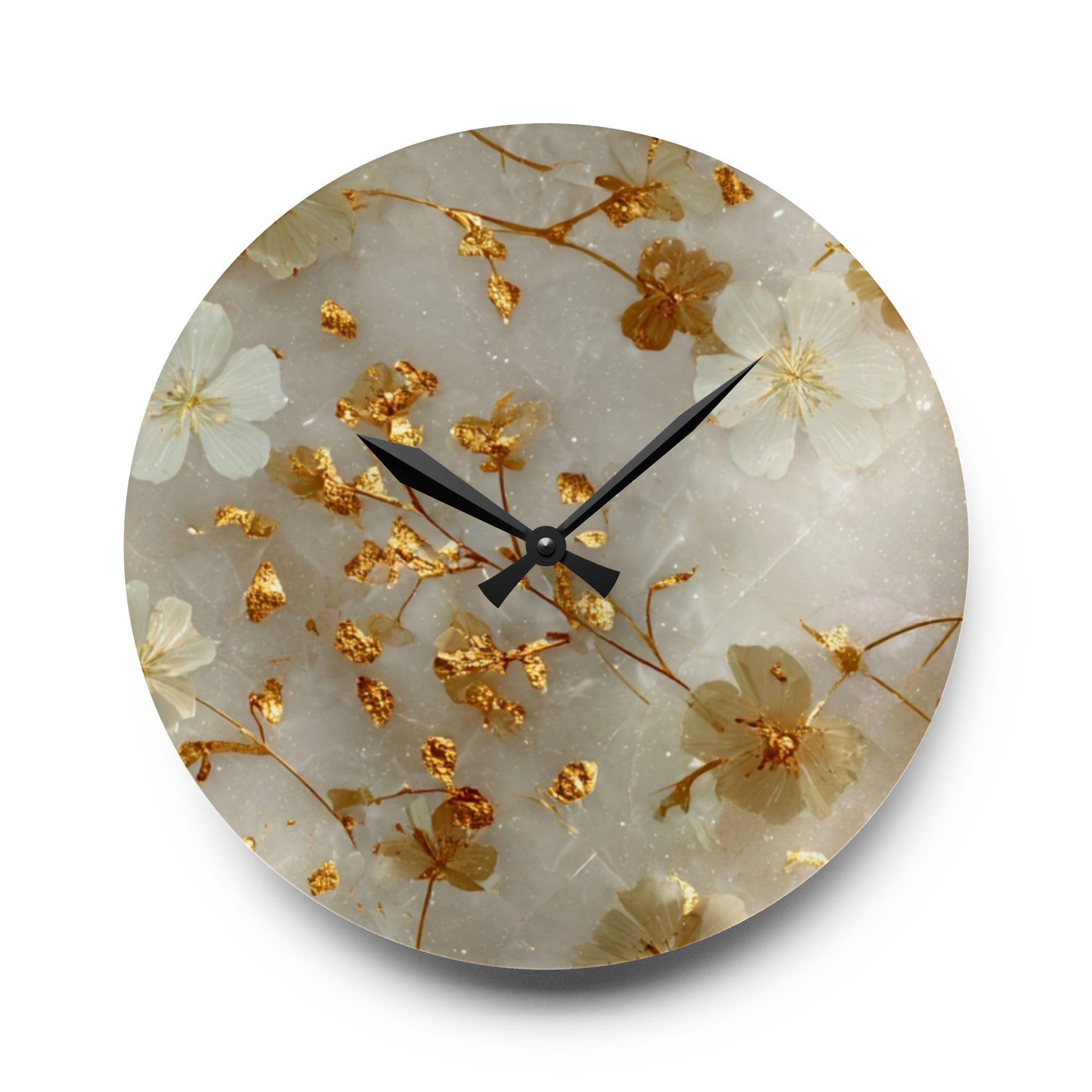 This wall clock perfectly blends the delicate beauty of floral motifs with luxurious gold accents, creating a refined and tranquil decorative piece. The background, resembling finely frosted stone, is adorned with translucent white flowers and shimmering gold leaf details. The result is a dreamlike and elegant clock, exuding warmth, sophistication, and modern luxury.