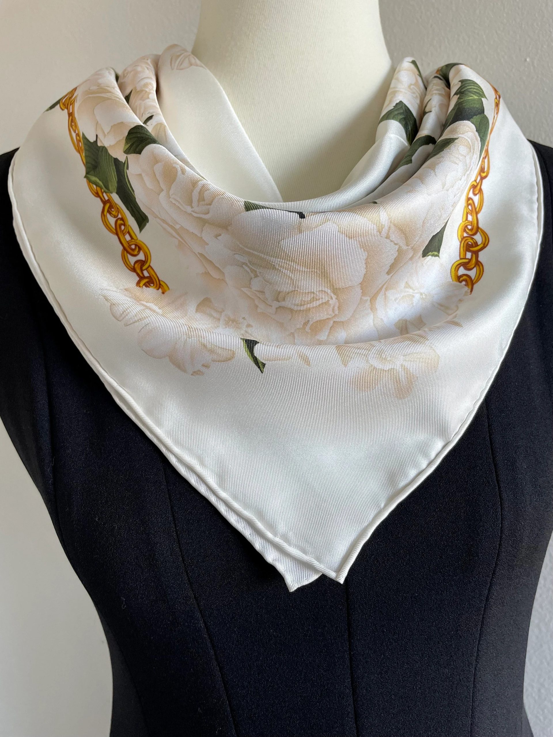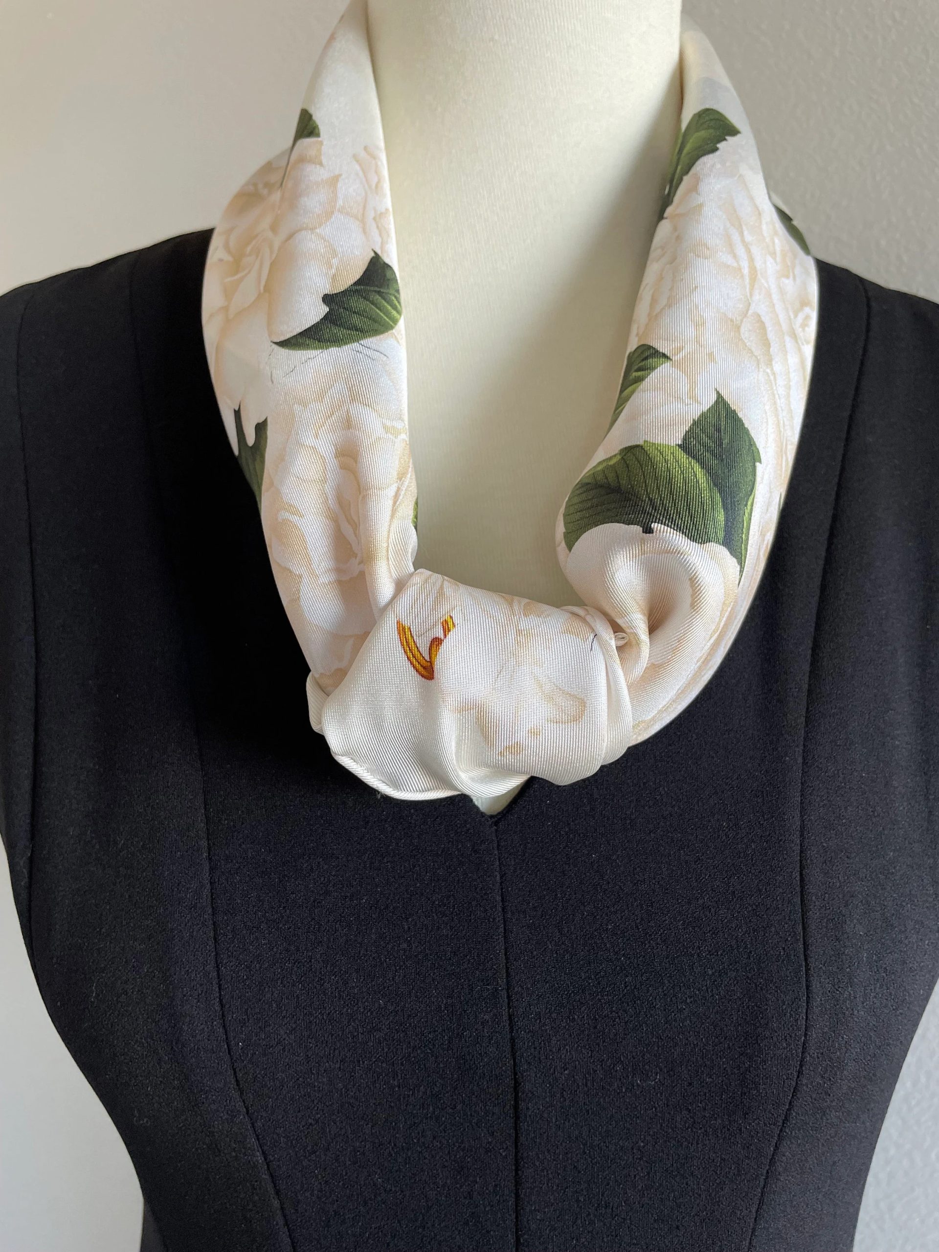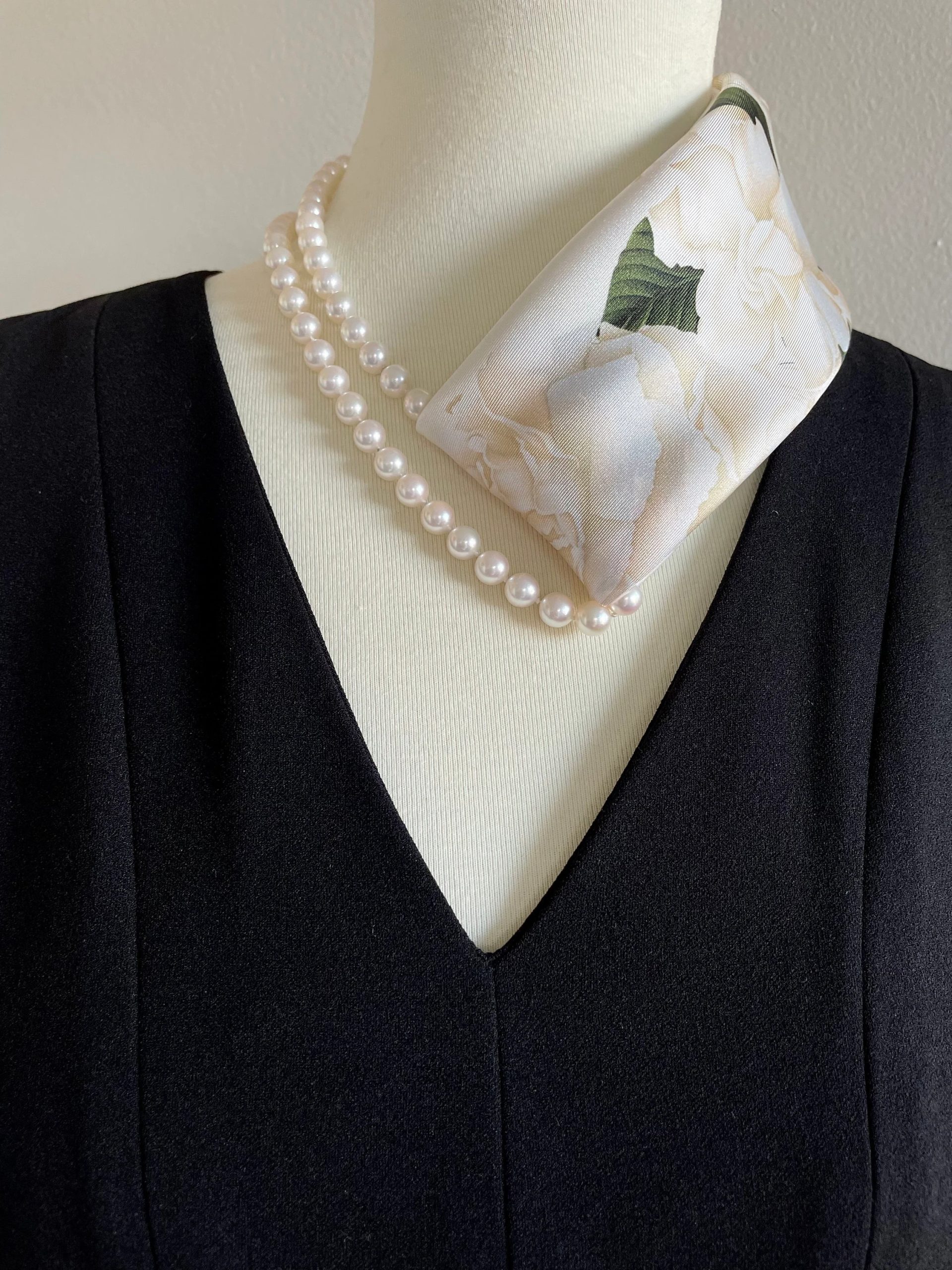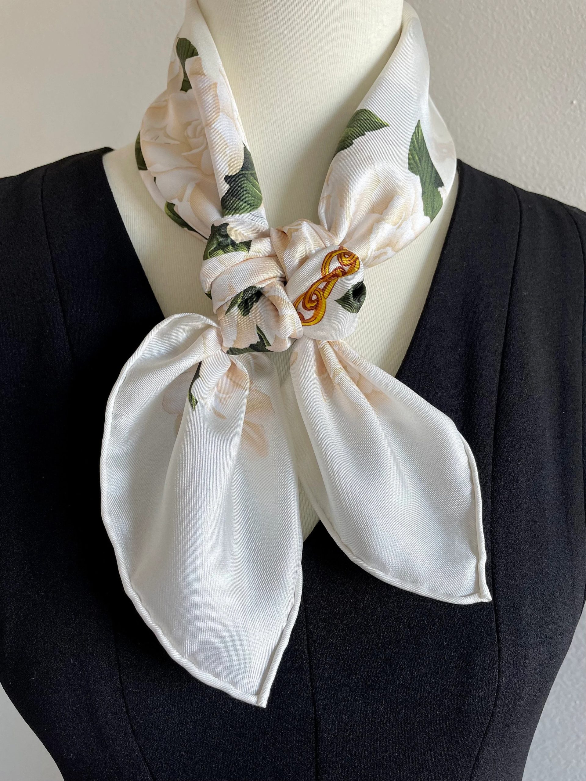 This silk scarf is a gentle finishing touch to any elegant outfit—whether it’s a subtle elegance in the workplace or a gentle embellishment in everyday life, it allows the soft beauty of white roses to naturally blend into your attire.