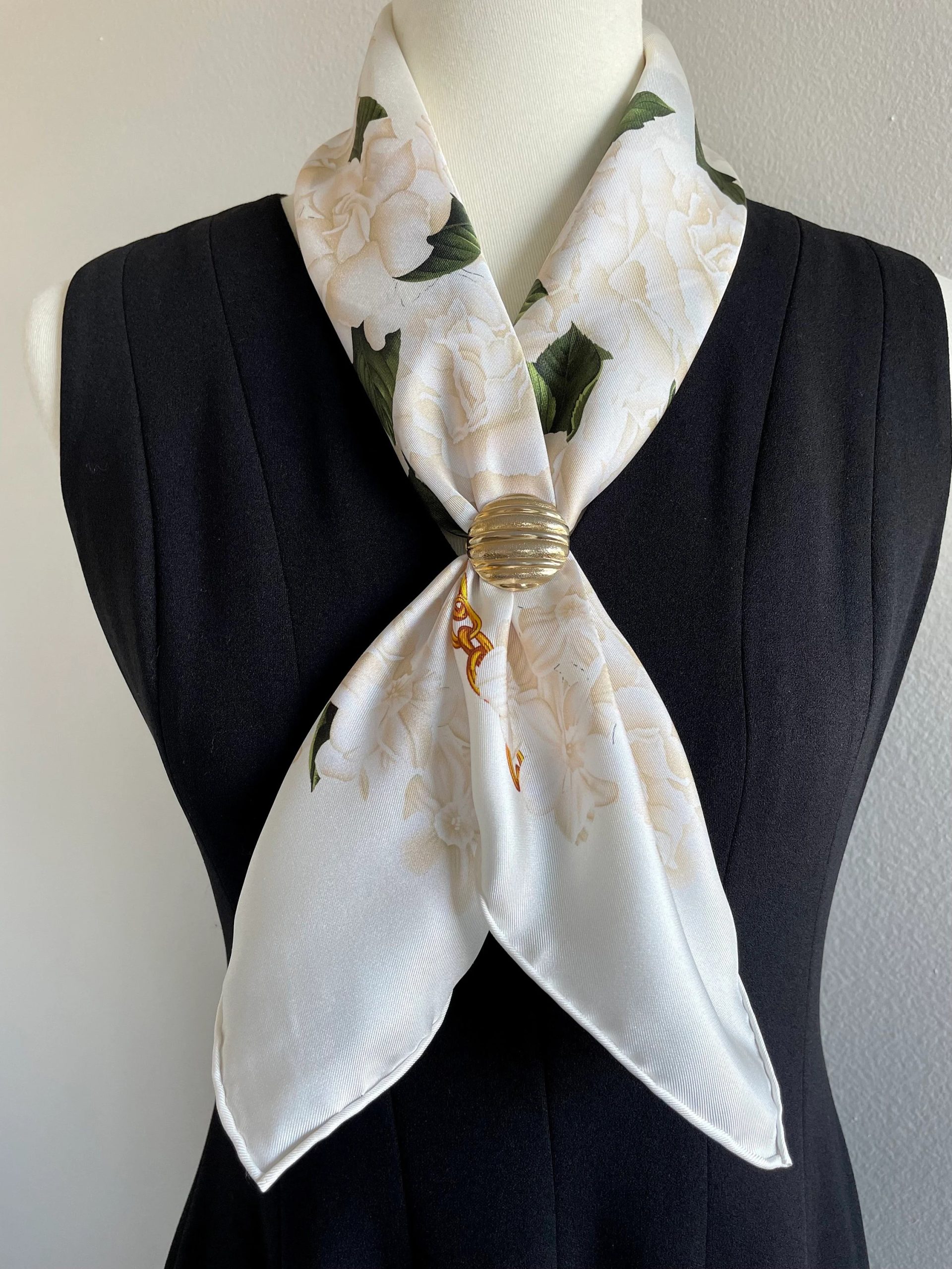 **Elegant Commuter Knot:** Fold the scarf into a wide strip, wrap it around the back of your neck, and secure it at the front with a metal buckle, revealing a portion of the white rose petals. Pair it with a black suit and white shirt for a touch of soft, elegant detail to your work attire.