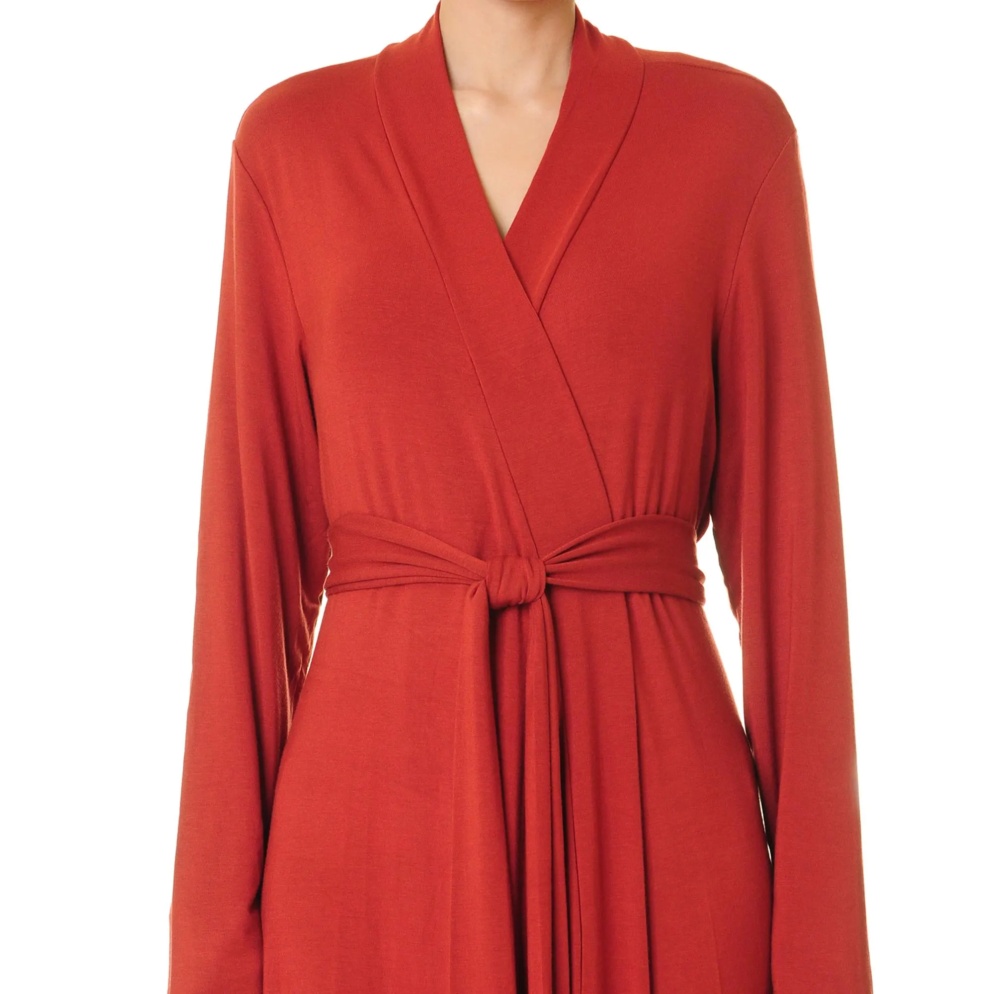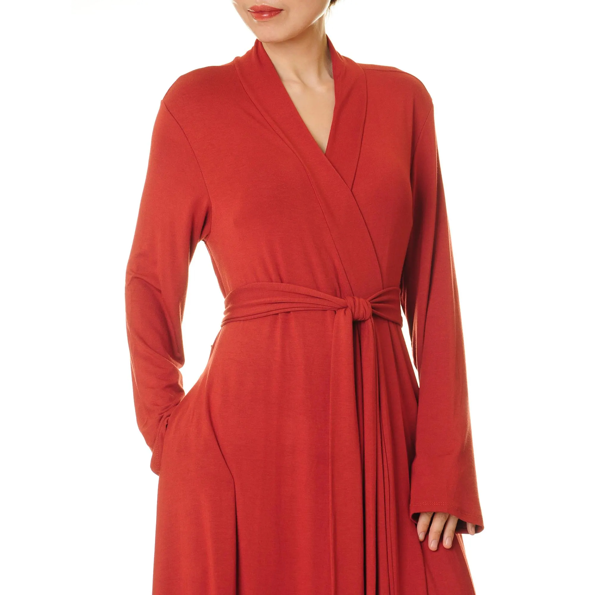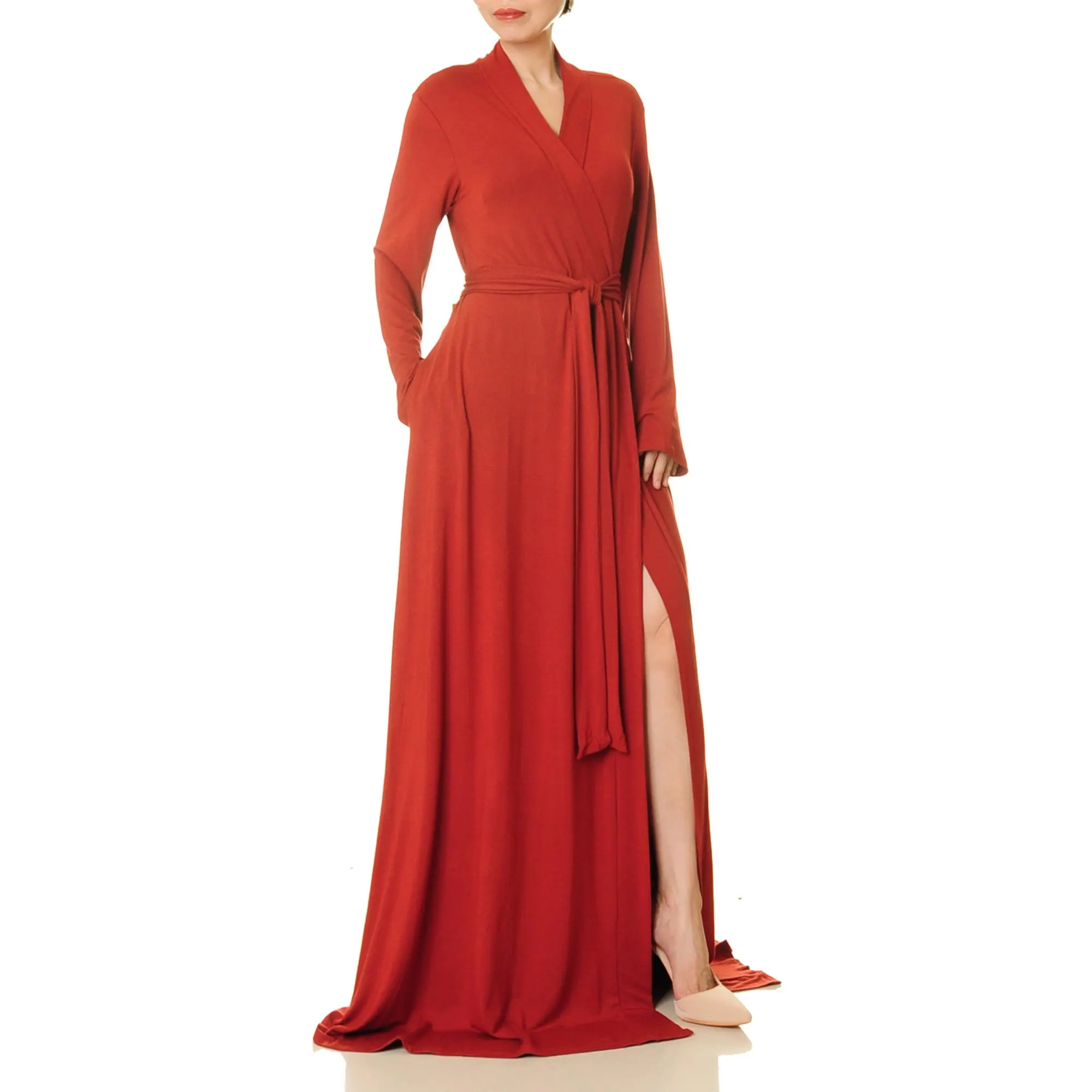 This deep ember red wrap robe cinches with a simple tie and drapes to the floor. Its long sleeves, generous drape, and soft feel make it effortless whether you’re at home or on the go. The practical side pockets and flowing skirt dance gracefully with every step.