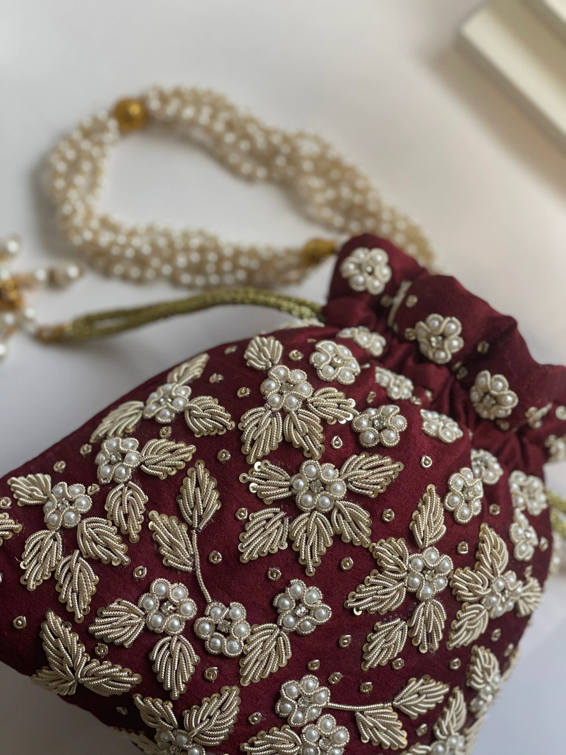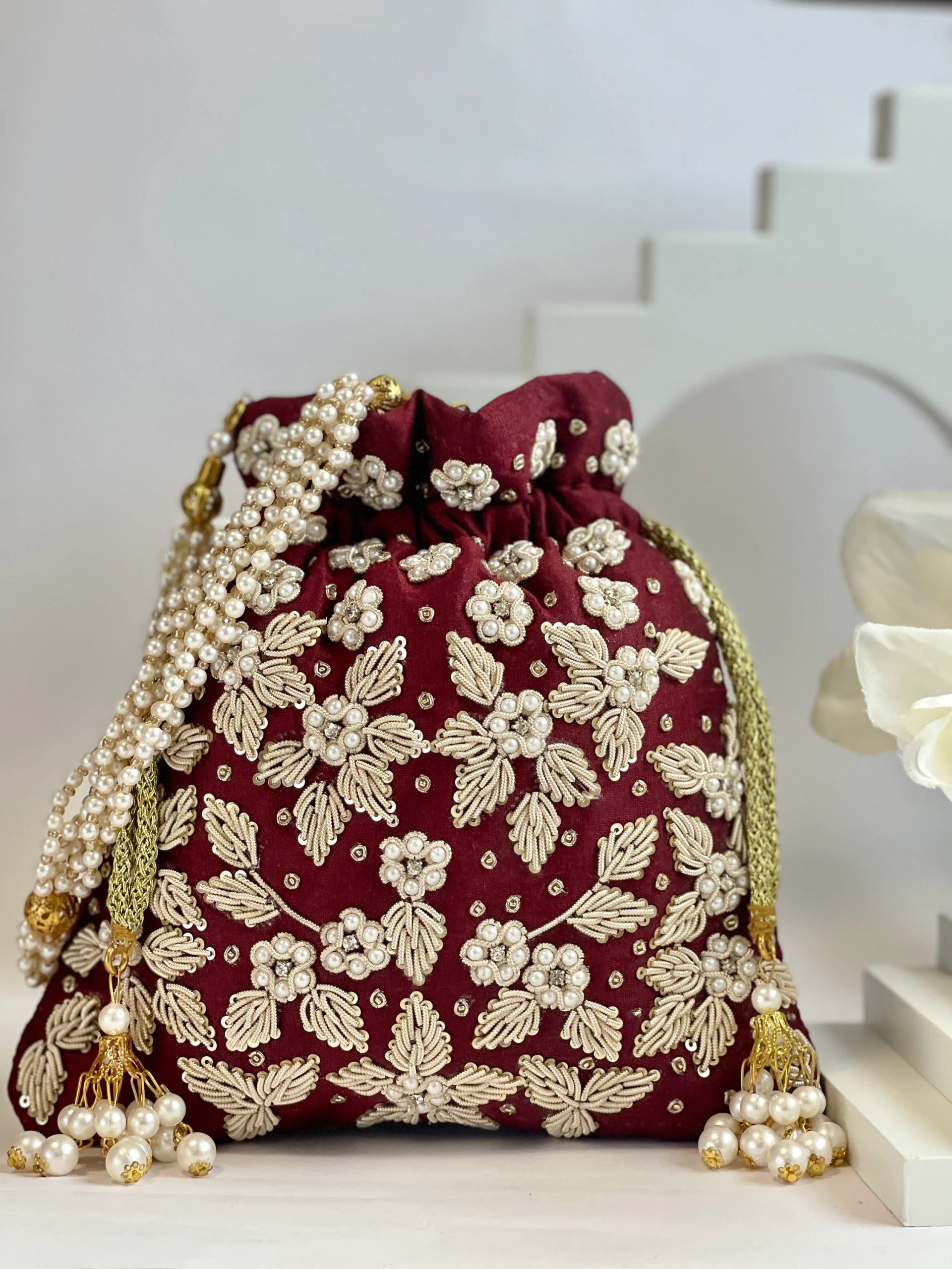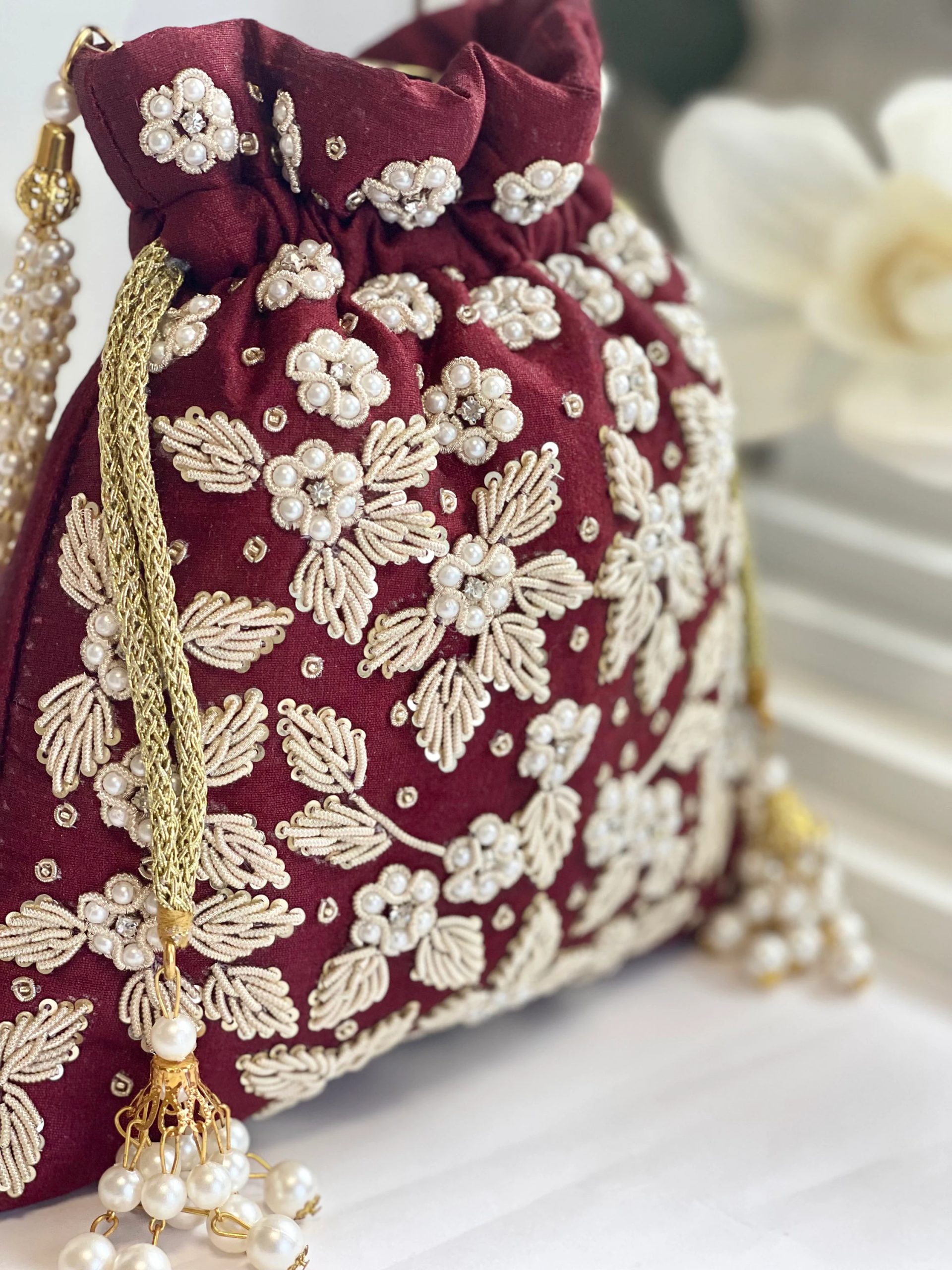 This luxurious tote bag features a deep burgundy fabric base, adorned with exquisite and intricate floral and leaf embroidery. Each design is accented with ivory thread, hand-set pearls, and delicate beadwork, creating a beautifully textured and elegant visual effect across the entire surface. The drawstring ends are embellished with gold tassels and strands of pearls, adding a touch of ethereal movement. A long, pearl-studded handle further elevates the bag’s sophistication, combining practicality with jewel-like refinement.