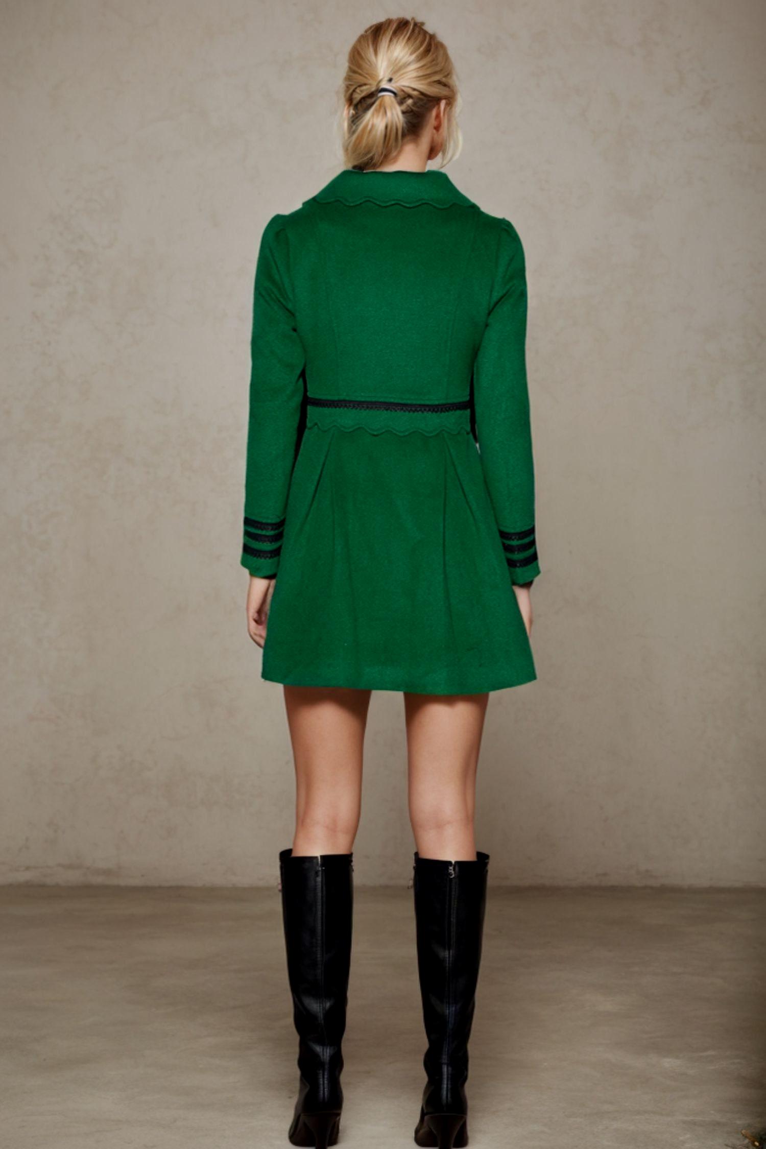 This emerald green cropped coat is playful yet sophisticated, featuring a scalloped collar and curved front for a retro-modern feel. The bodice is fitted and flared, with a mini A-line hem for ease of movement. Contrast trapezoidal seams at the waist and cuffs add a sharp, defined silhouette. The single-breasted button-down front, inset sleeves, and side pockets make it easy to wear every day.