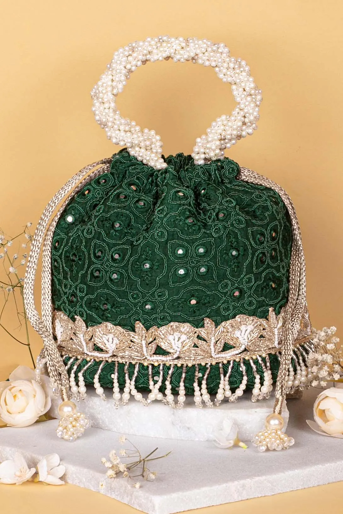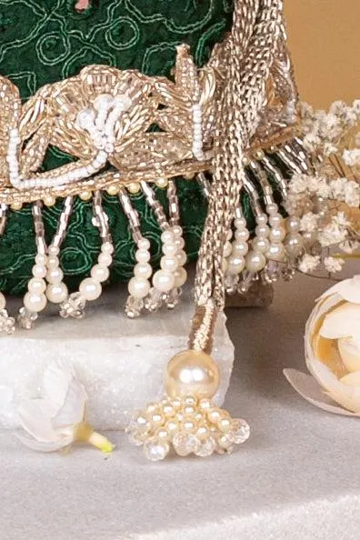 The bag’s rich emerald velvet base evokes a shimmering gemstone in the dark night, exuding a noble and mysterious aura. The surface is interwoven with openwork embroidery and sequins, resembling a “galaxy of diamonds woven into velvet,” reflecting a delicate and luxurious luster as light passes through it. The pearl-woven handles resemble a “flowing pearl moon ring,” complemented by the gold embroidered trim and pearl tassels at the bottom of the bag. The retro, royal feel exudes a lively and ethereal air. Set against a warm background and floral arrangements, it enhances the grandeur and romance of the celebration, like a “luxury treasure bag” custom-made for a special occasion.