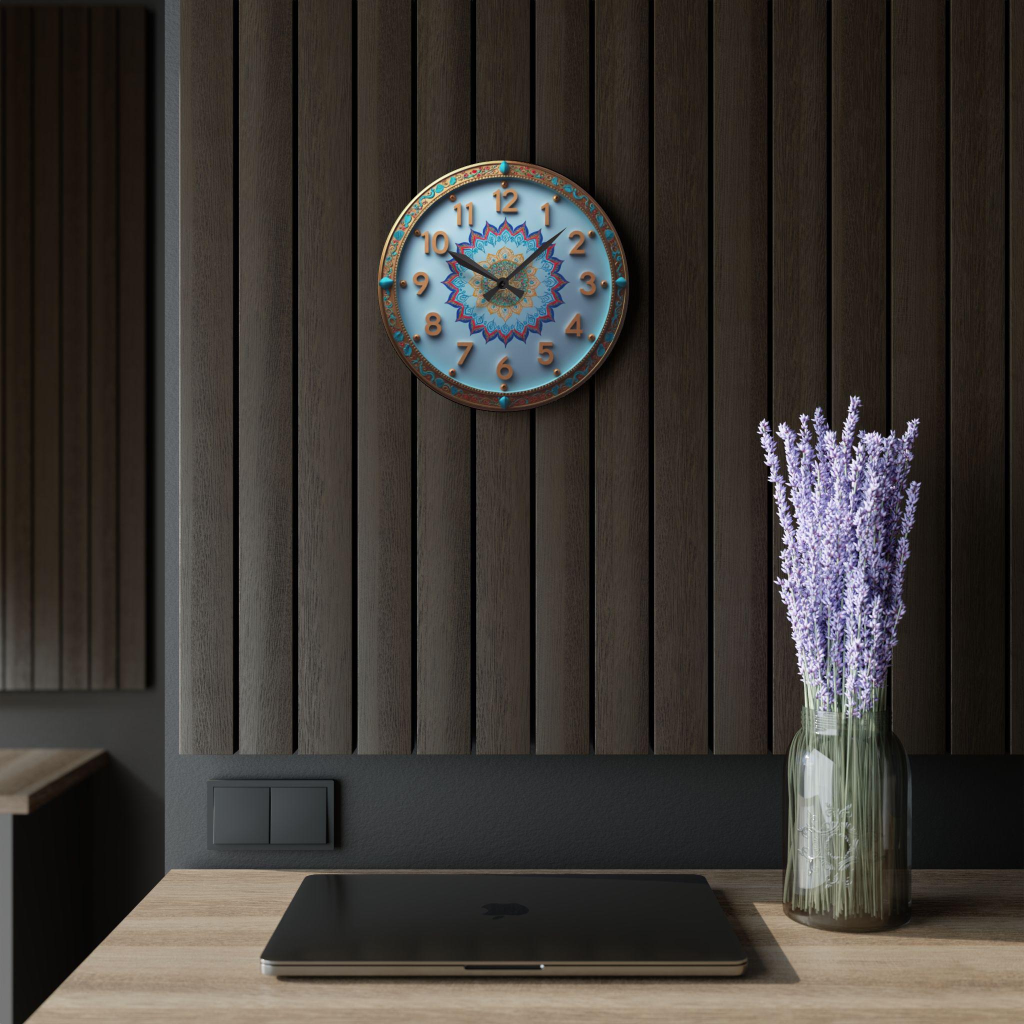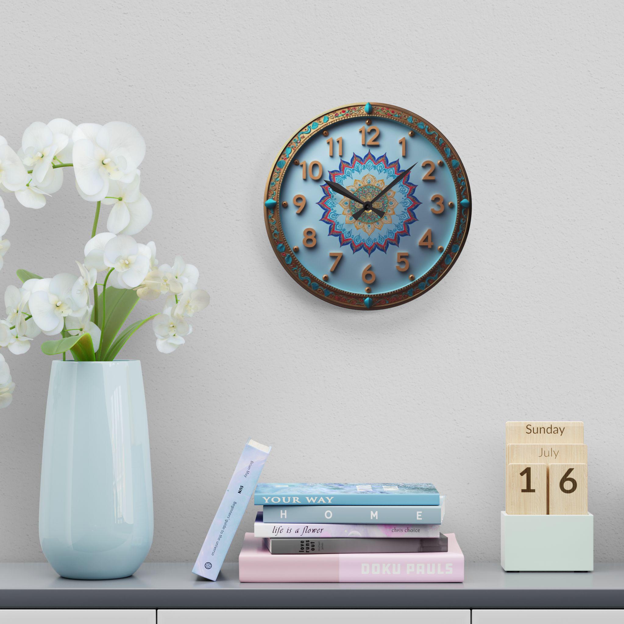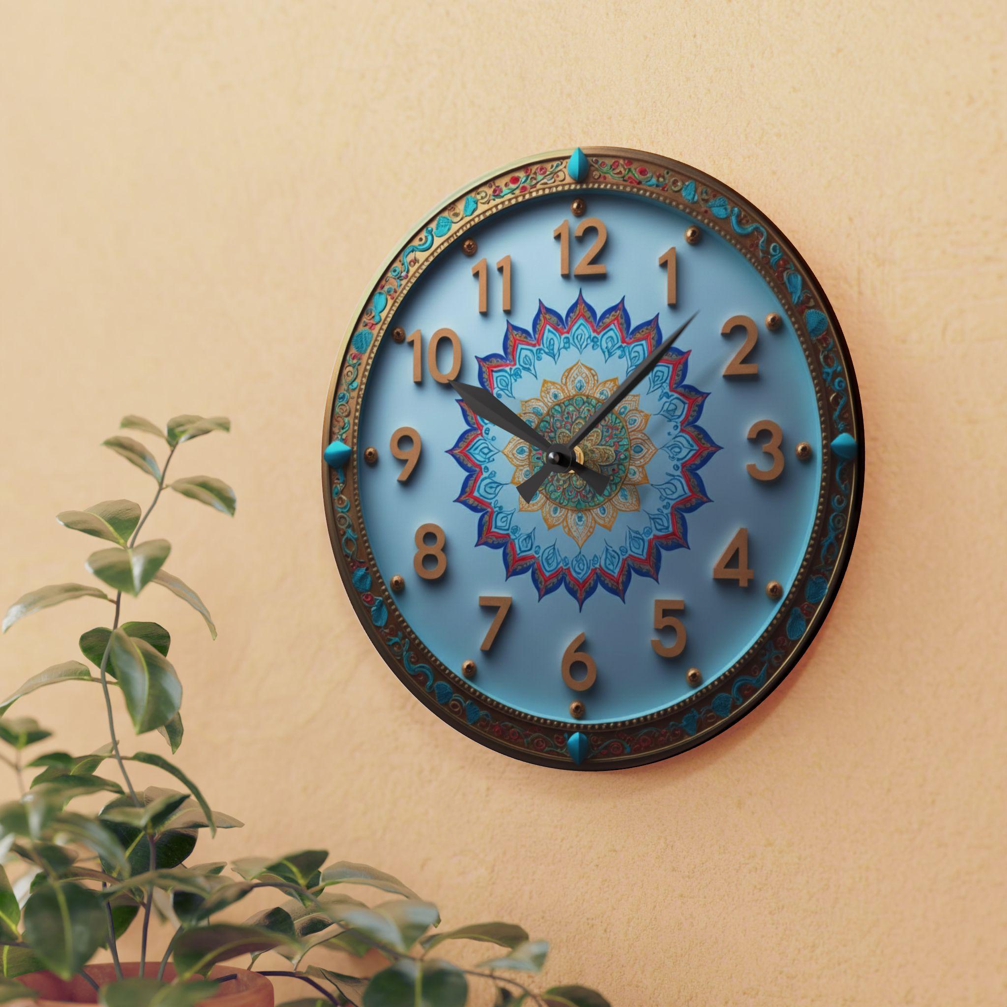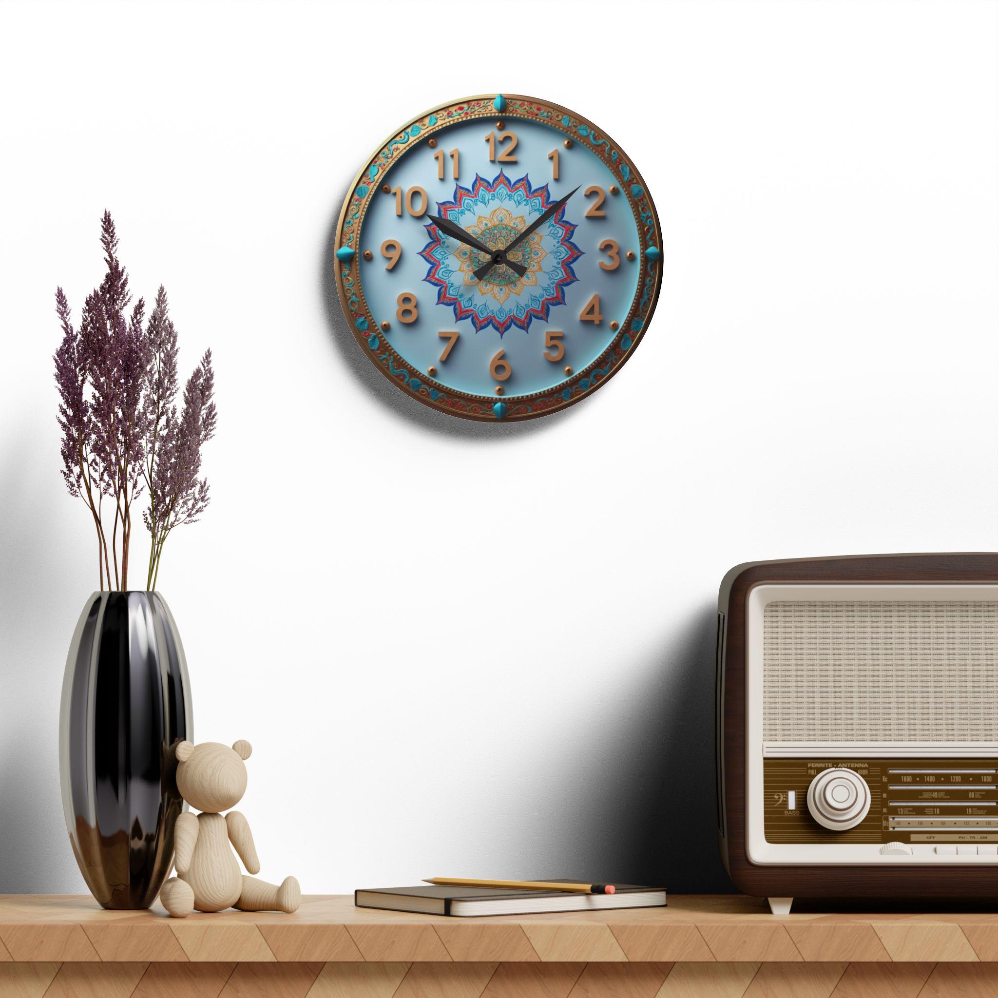 This exquisitely crafted wall clock adds a touch of artistic luxury to any space. The clock face features a vibrant mandala pattern at its center, dominated by blue, gold, red, and turquoise hues, exuding a delicate symmetrical beauty and rich cultural charm. The surrounding border is adorned with ornate decorative patterns and jewel-like turquoise accents, giving it an elegant vintage appeal, making it both a work of art and a timekeeping instrument.