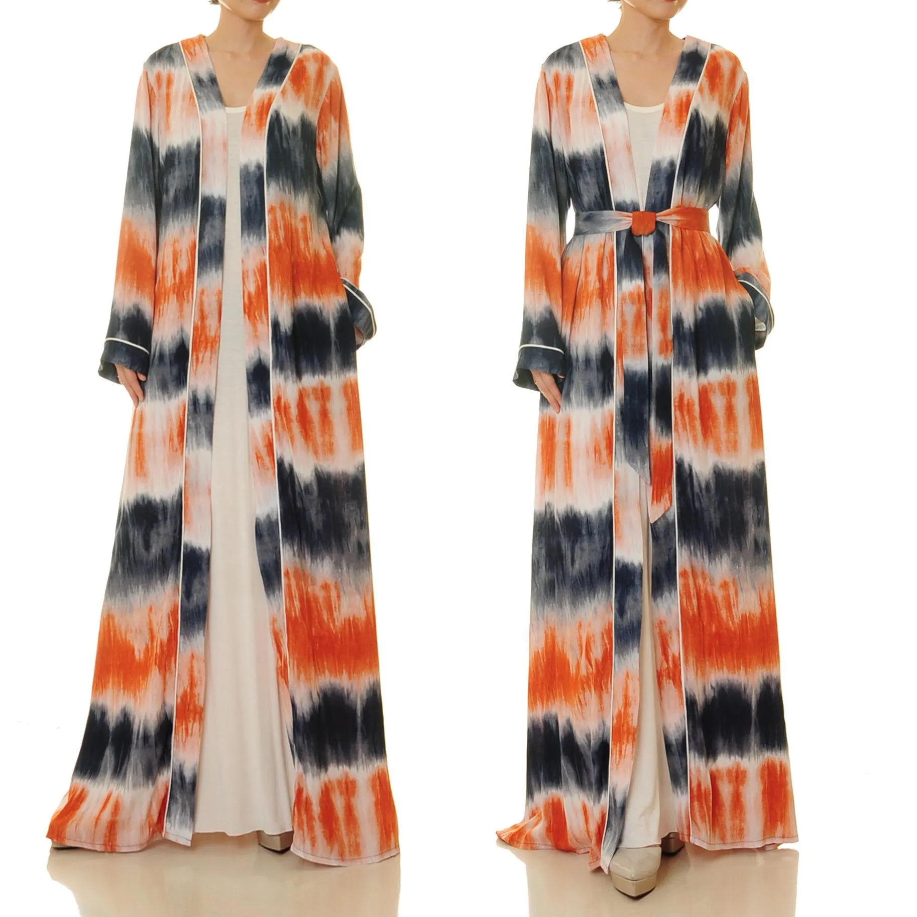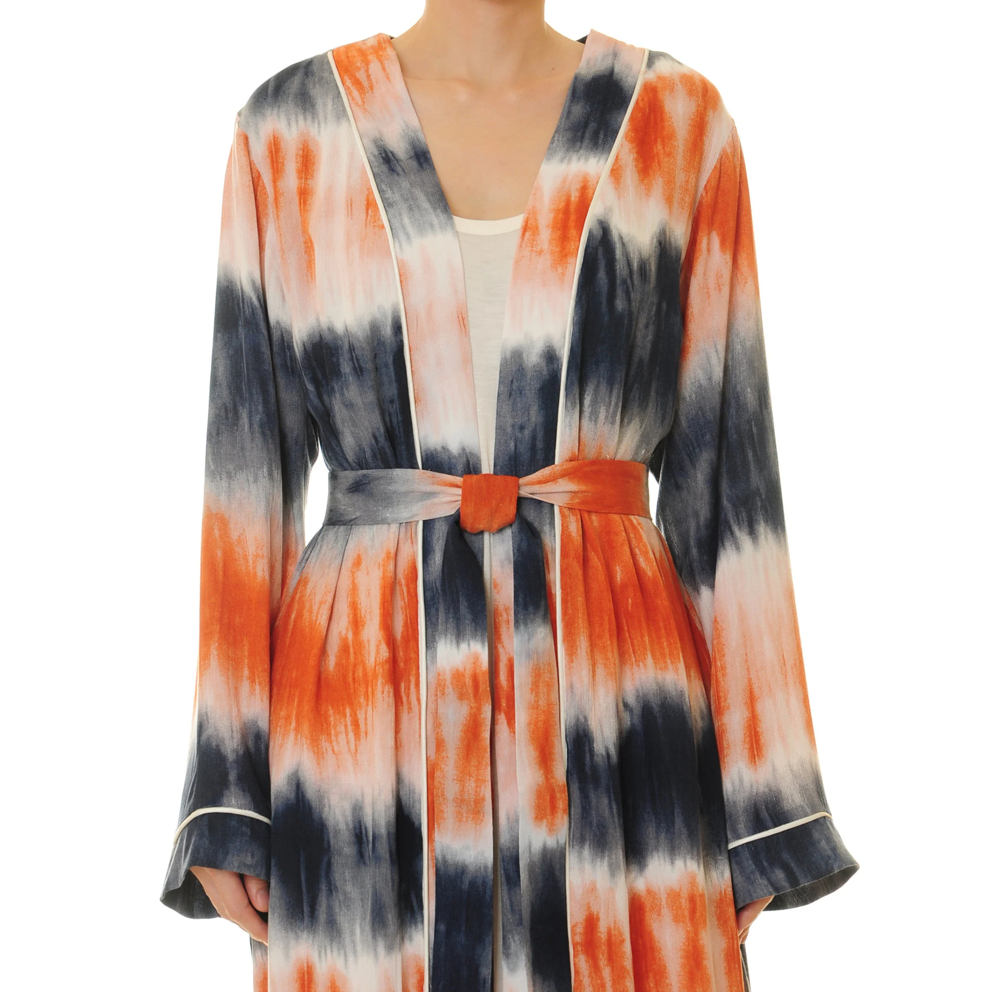 This robe outerwear piece features a minimalist front-opening design with a striking tie-dye color scheme: Flame Orange and Ink Blue intertwine against a white background, reminiscent of a sunset illuminating the ocean. The V-neckline flatters the neckline, and the built-in waistband allows for an adjustable fit. The long sleeves and flowing hem create a slender vertical line, and the center front slit enhances mobility and a sense of lightness. Throw it casually for a relaxed look, or tighten the waistband for a more refined look.