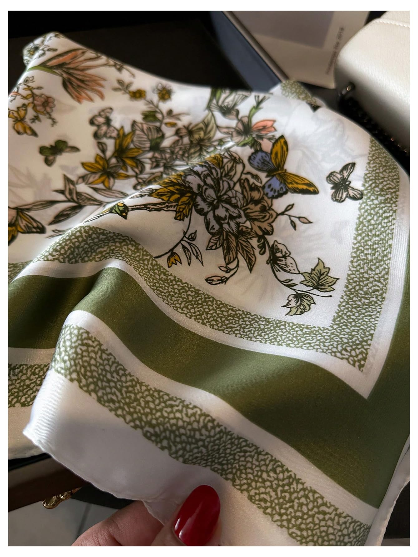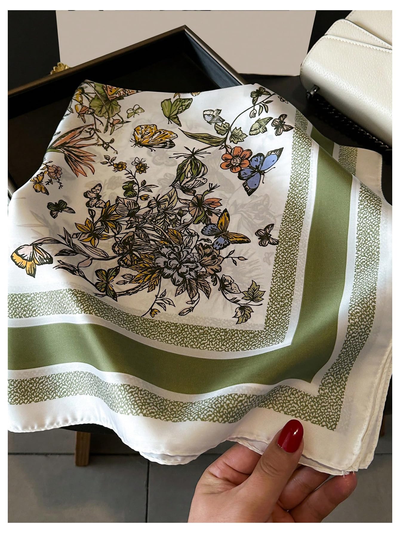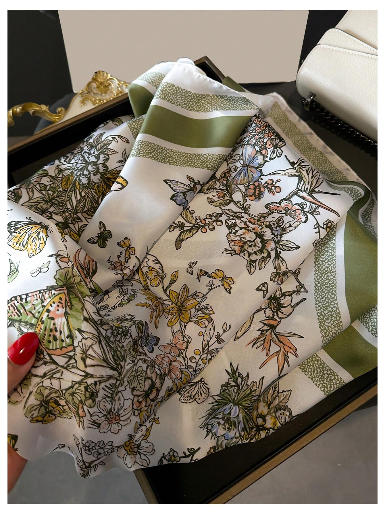 Ivory white background with black and gold line-drawn floral and foliage, accented with olive green and light green trim, creating a fresh and elegant look. The satin-smooth fabric has a subtle sheen and natural drape, feeling comfortable against the neck and fitting neatly when knotted; a perfect accessory for commuting or outings.