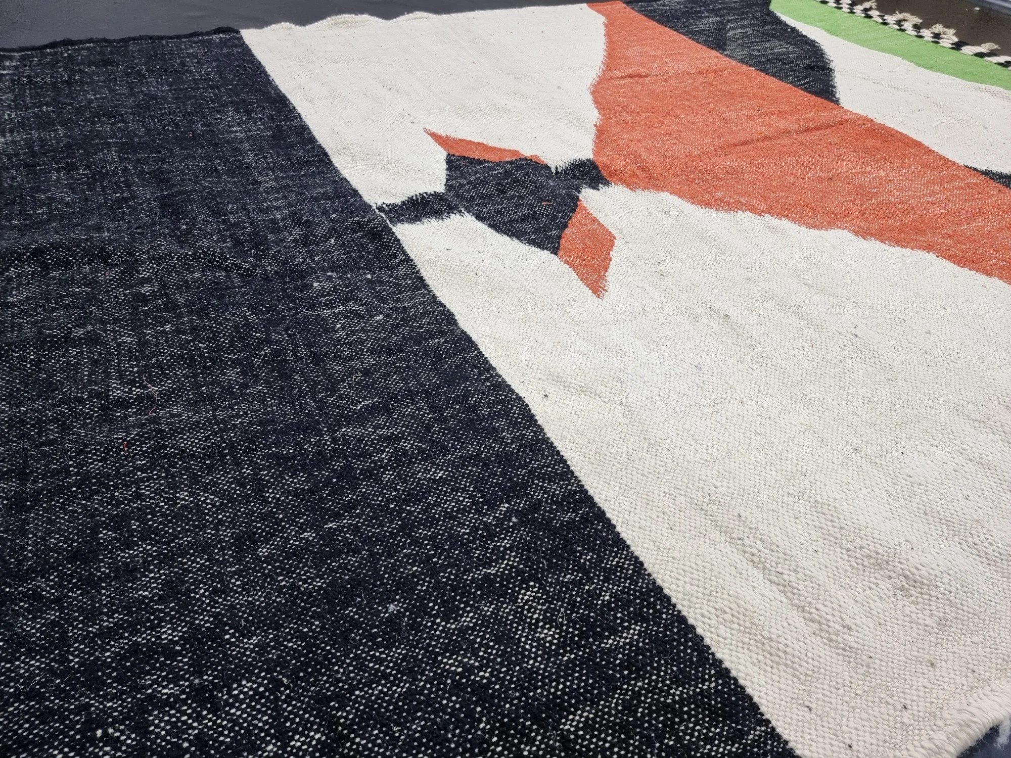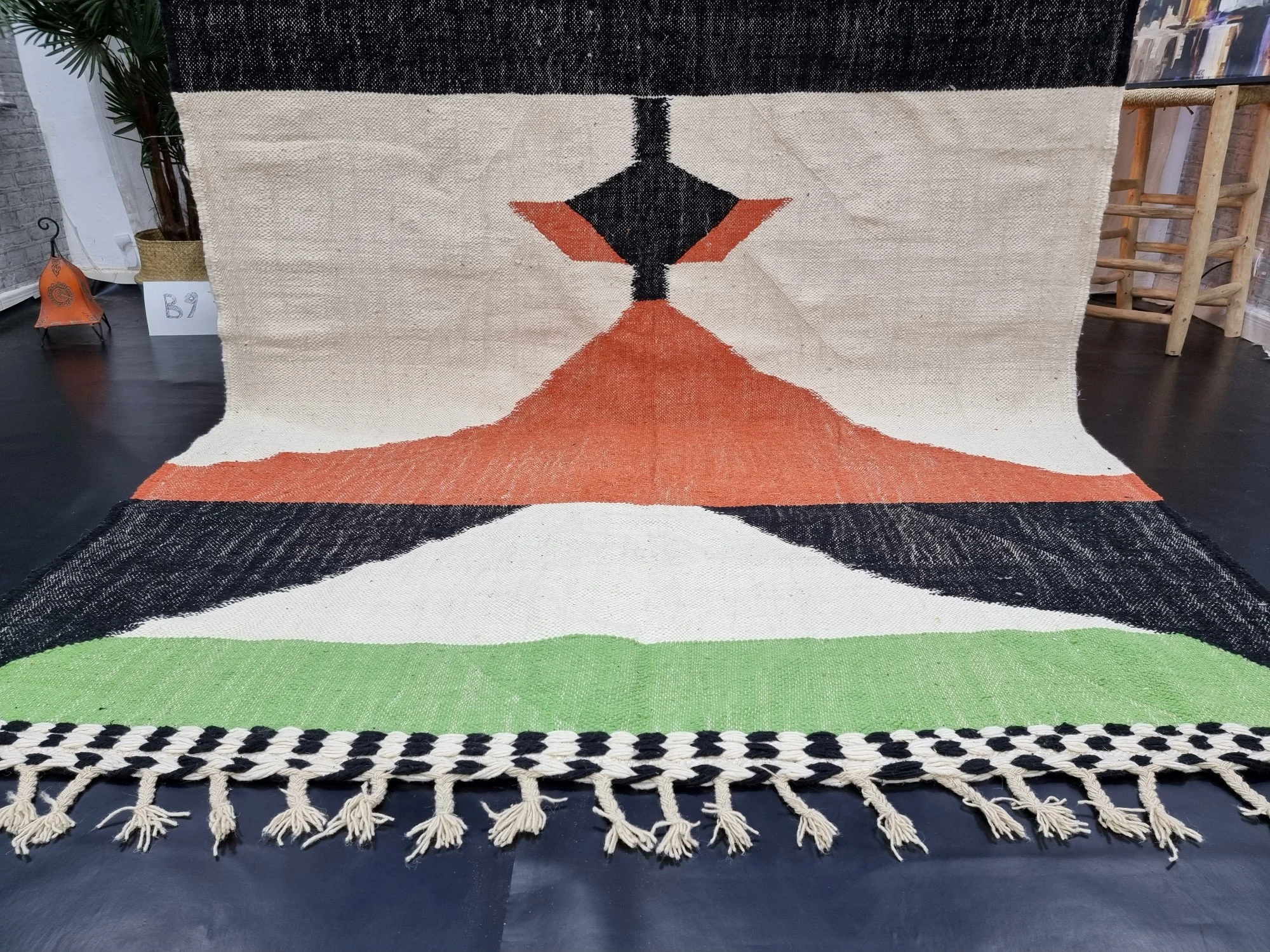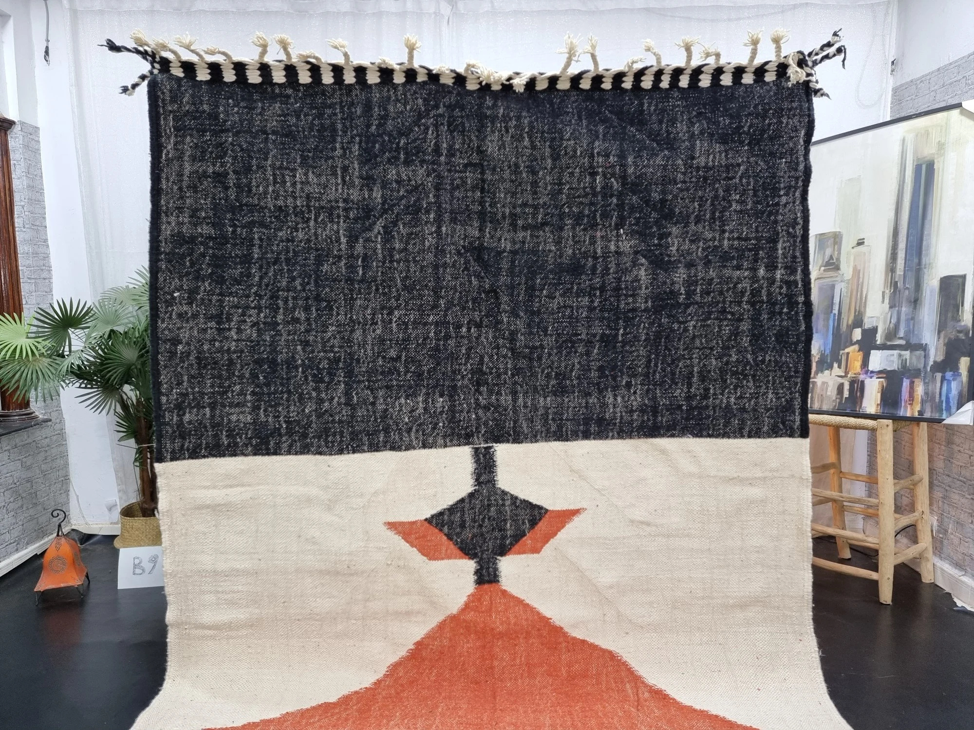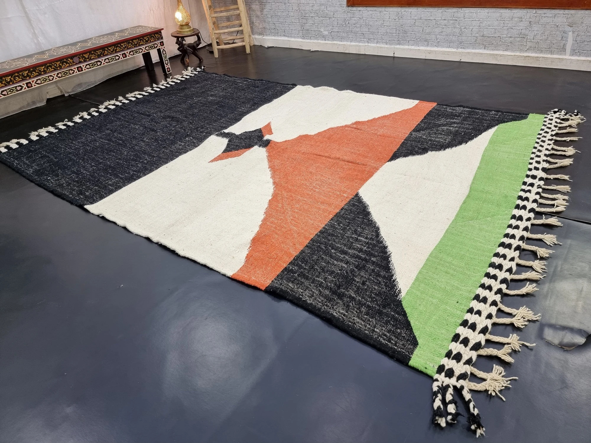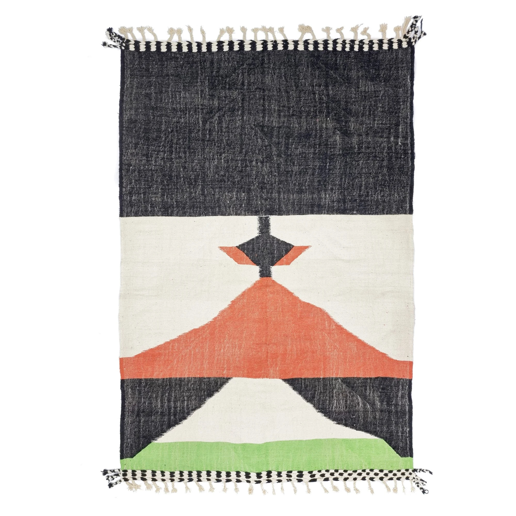 The pattern’s edges are delicately handwoven, creating a unique blend of color and contours thanks to the artisan’s fingertips. The base features a black and white polka-dot border and naturally draped hand-woven tassels. Each tassel is unique in length and knotted, swaying gently as you walk, imbuing the rug with the languid, dynamic beauty of tribal art.