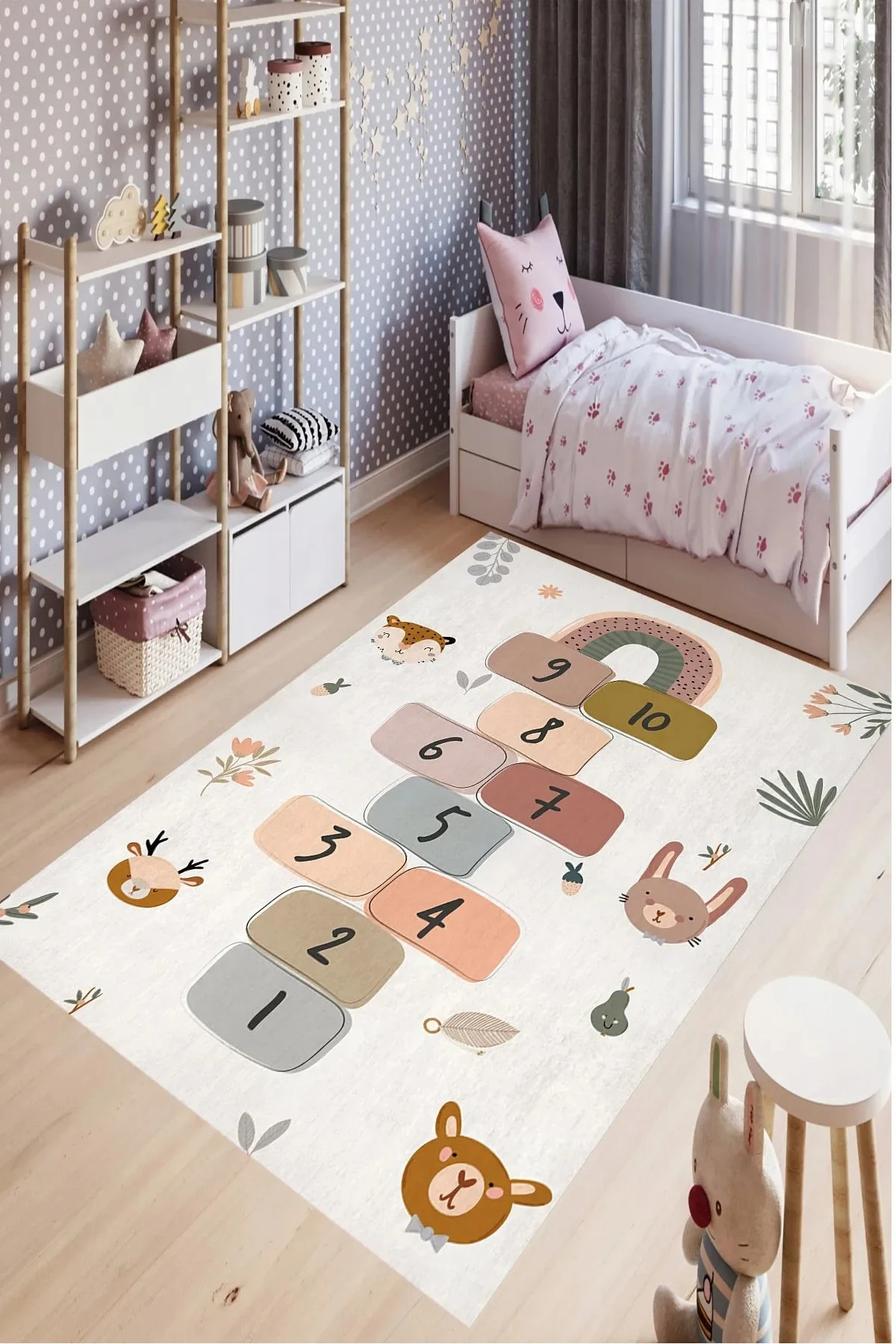 Children’s bedroom: Place this rug next to their bed, allowing children to play “Forest Hopscotch” daily, filling their mornings and bedtimes with the joy and ritual of natural exploration.