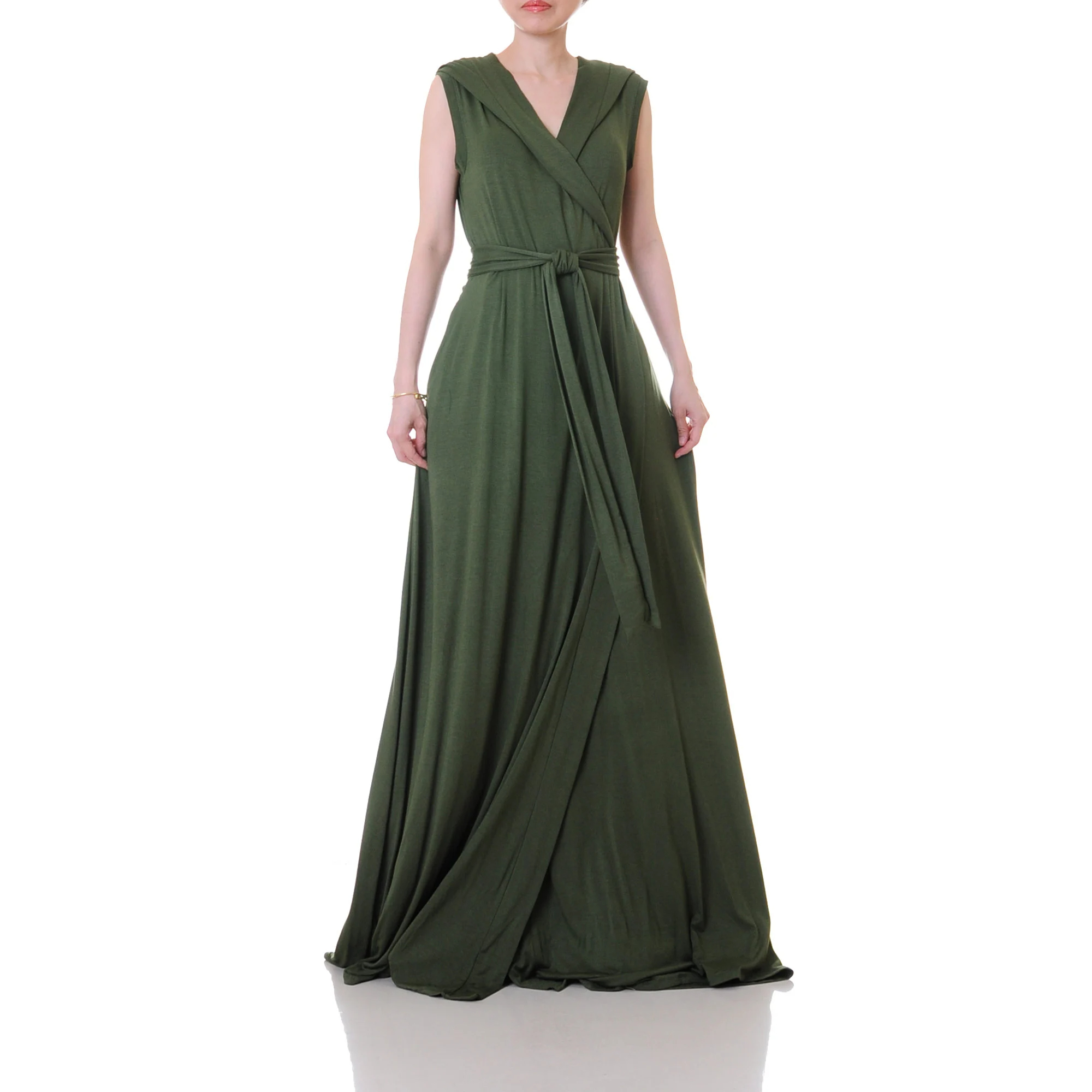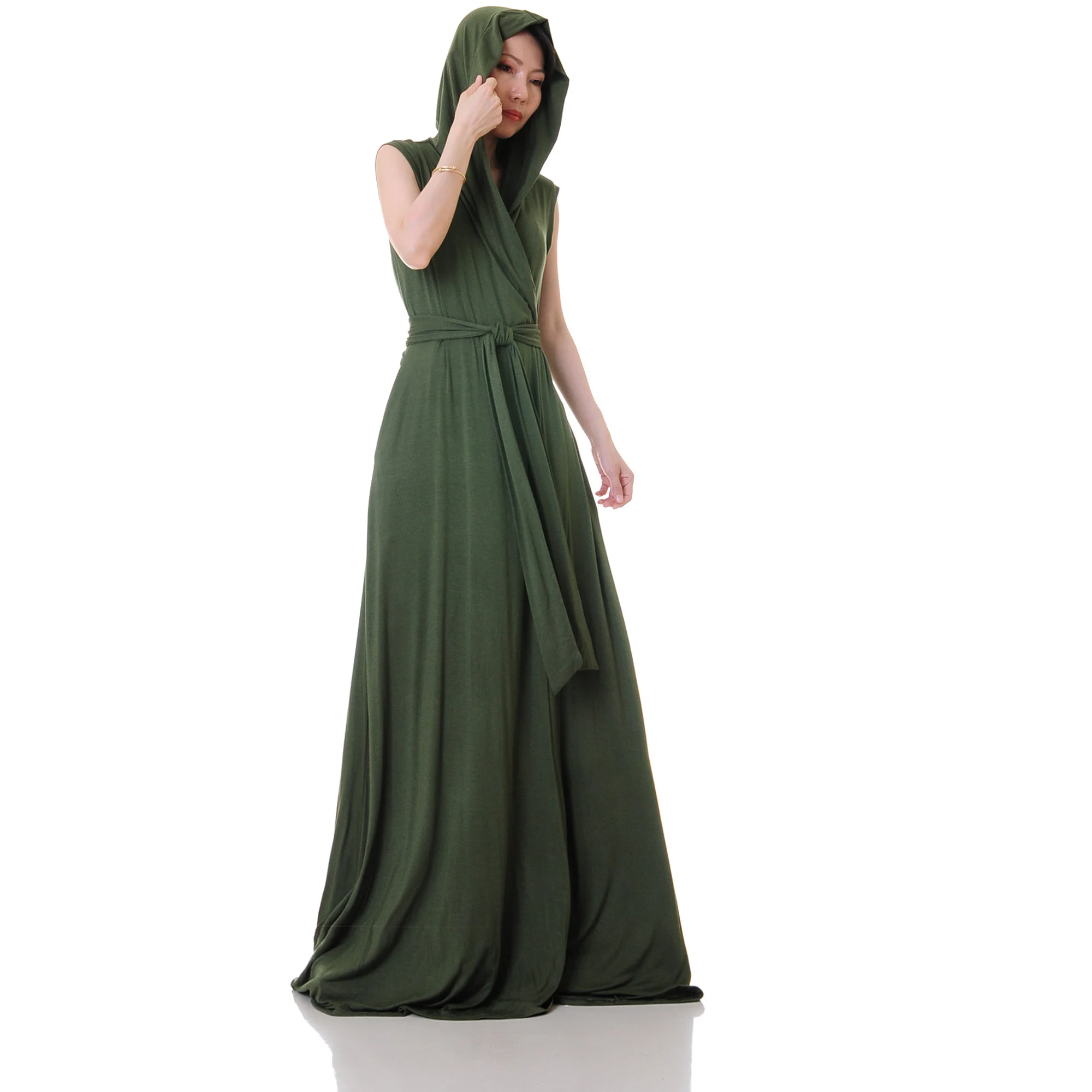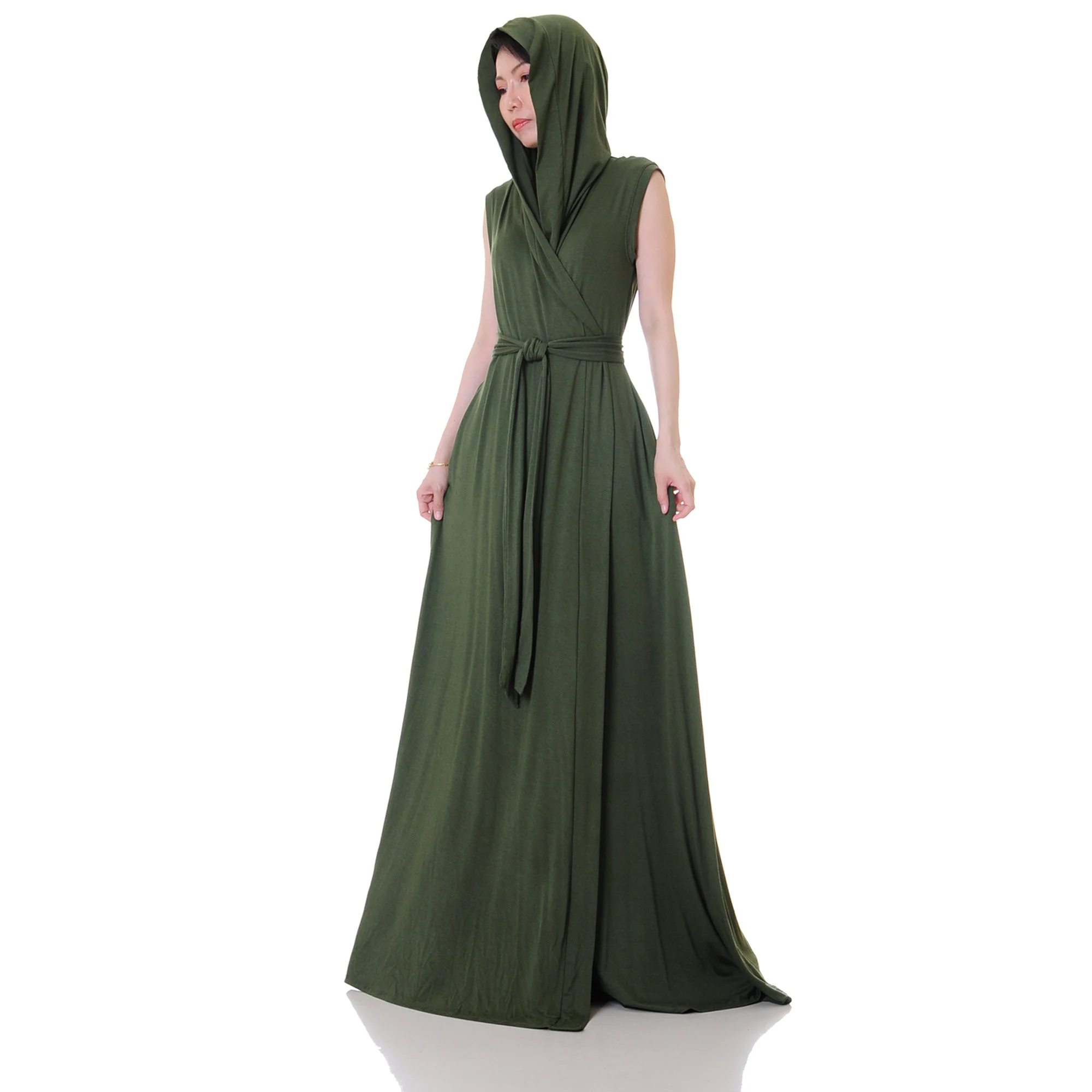 This forest green gown features a hooded and wrapped silhouette: a generous hood creates a sense of presence and shape, a wrap-around V-neck and matching belt adjust the fit, and a long hem that curves smoothly as you walk. The sleeveless design allows for easy layering—wear it alone or layer it with a cape or windbreaker, perfect for everyday wear, photoshoots, vacations, and themed parties.