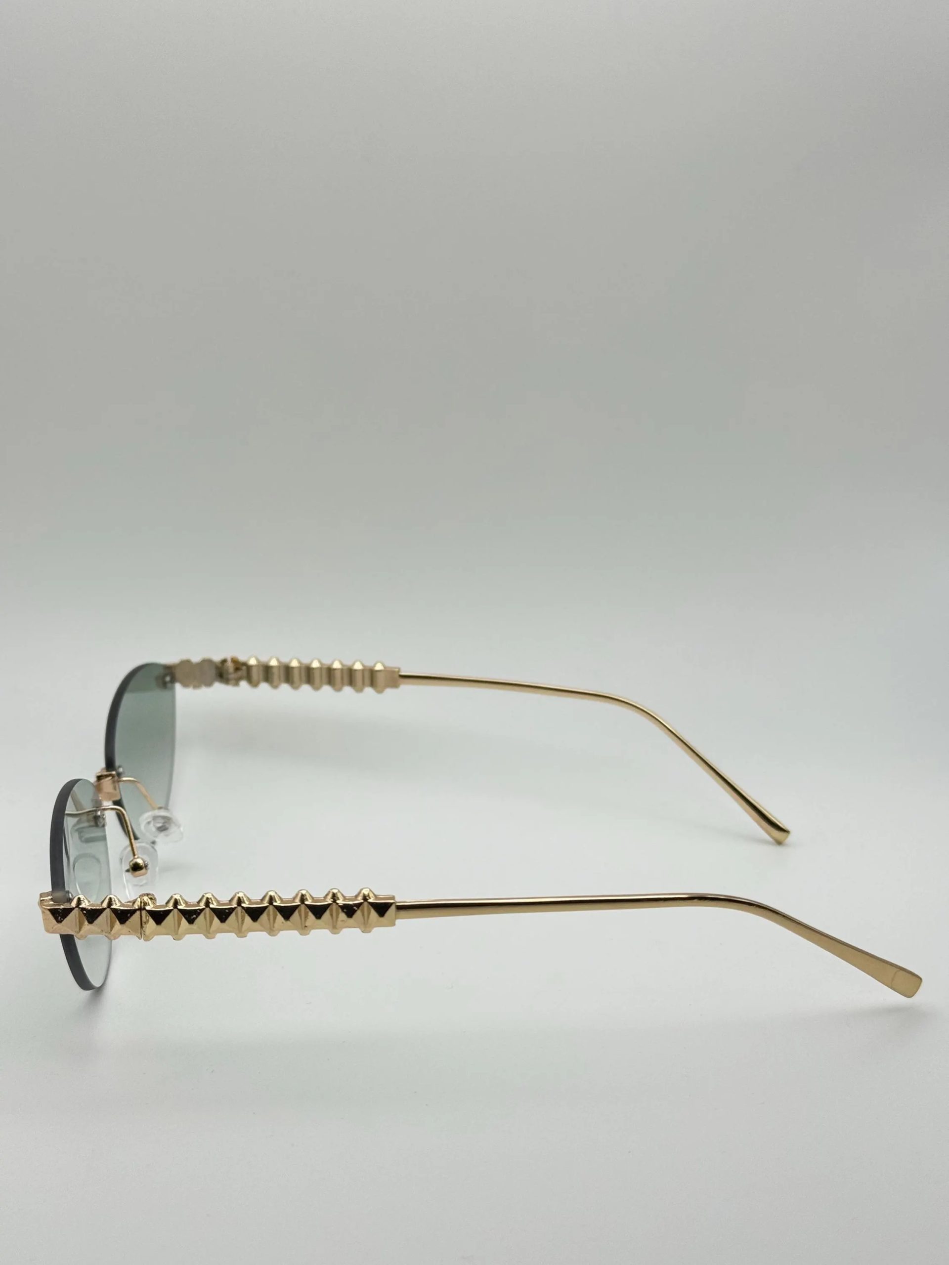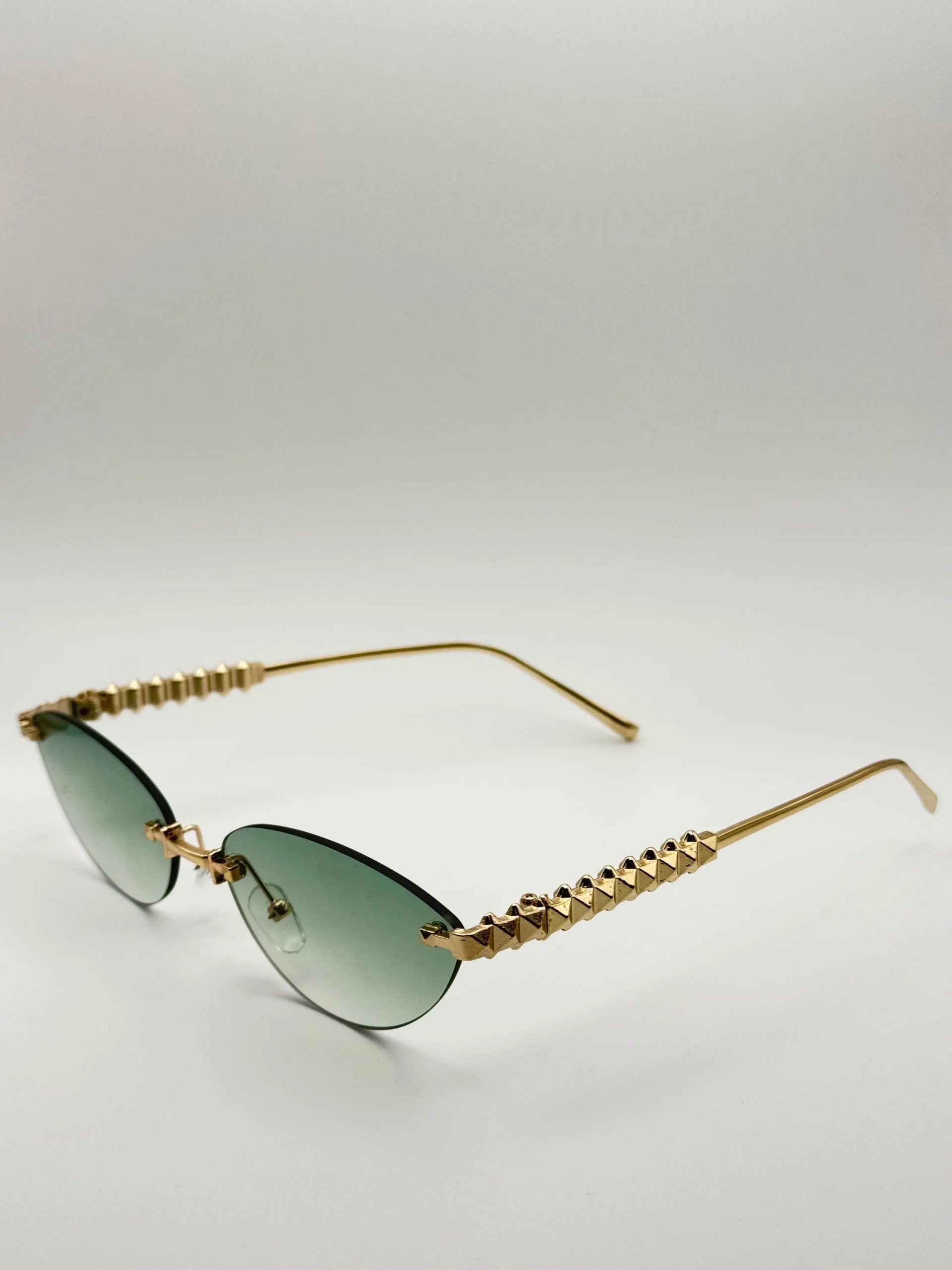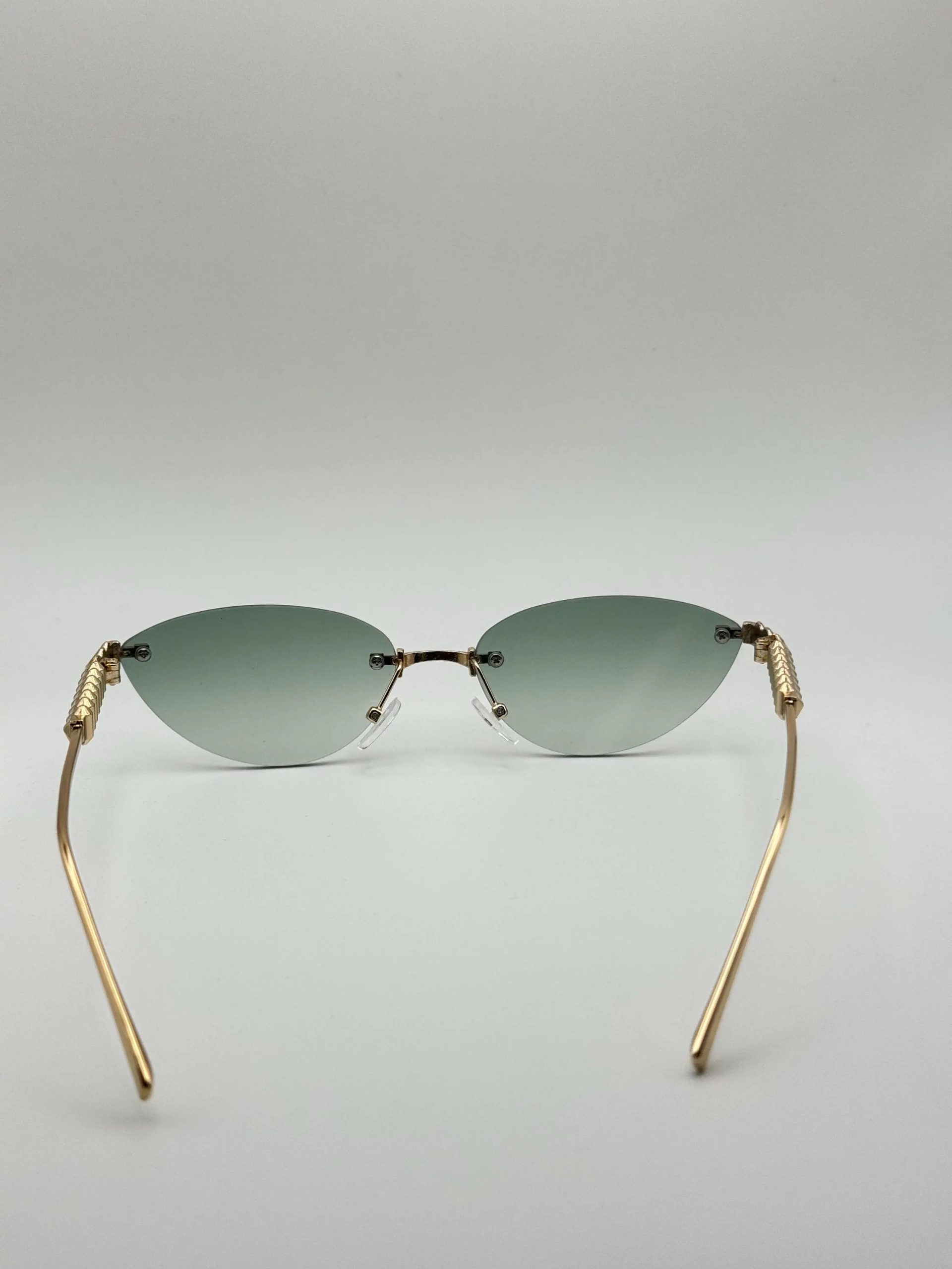 This is a frameless cat-eye sunglasses collection that emphasizes a “sweet, cool, and subtly luxurious” vibe. The main visual element is the floating gradient green lens, paired with a gold chain-style metal frame. It retains the advantages of the cat-eye shape in flattering facial proportions (upward lines that slim the jawline), while the frameless design softens any heaviness. The chain embellishment uses a three-dimensional splicing technique, making the exquisite details the focal point of the look. The gradient green lens transitions from a clear light green to a deep dark green, offering excellent sun protection in strong light and a soft, transparent look in low light. It’s not only a practical everyday sun protection item but also a finishing touch to create a “sweet and cool girl” or “sophisticated and sexy” style—the delicate metal embellishment doesn’t weigh down the face, and the cat-eye shape suits most face shapes, effortlessly balancing sweet and cool fashion styles.