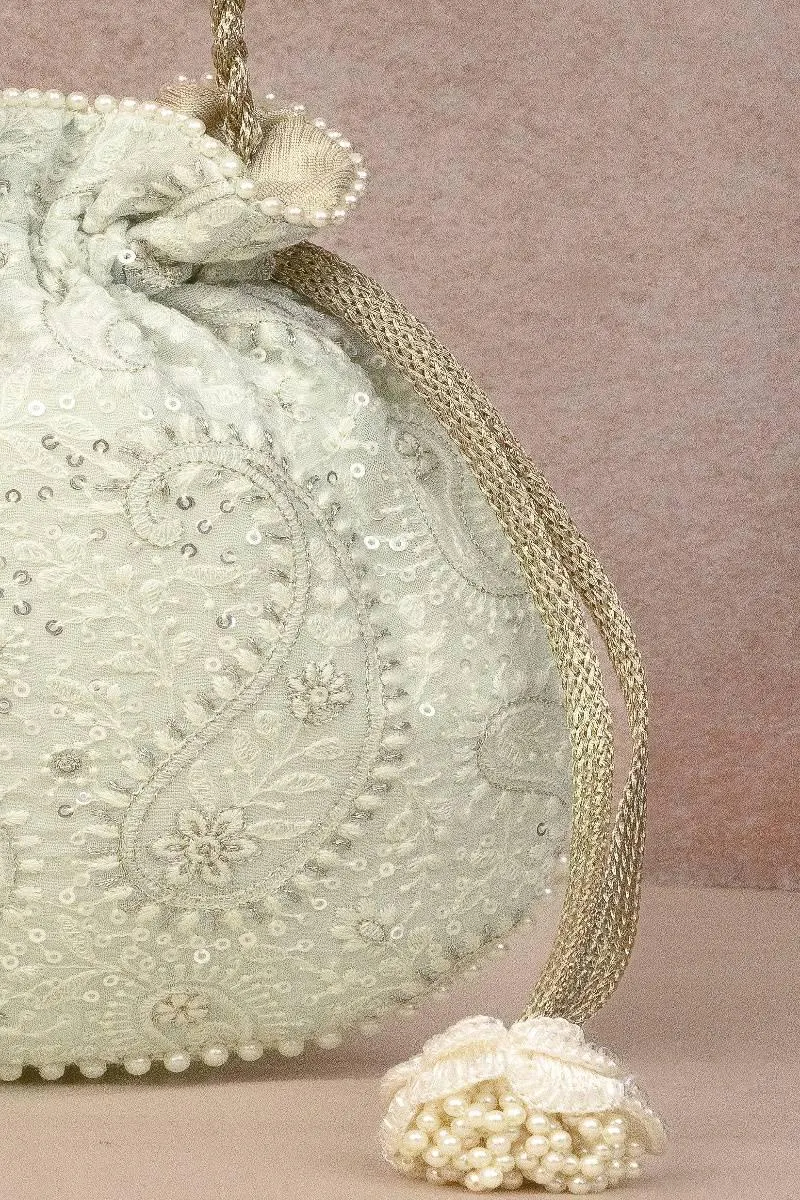 The bag’s base is a soft, light mint green, evoking a gentle, soothing atmosphere, reminiscent of a meadow shrouded in mist on a spring morning. The embroidery on the paisley lace is delicately crafted, its winding, flowing pattern imitating “naturally grown vines” woven into the fabric, creating a sense of elegance within its transparency. Pearl embellishments along the edges and drawstring resemble “morning dew pearls” condensed within the lace, adding a touch of luxurious softness to the fresh feel.