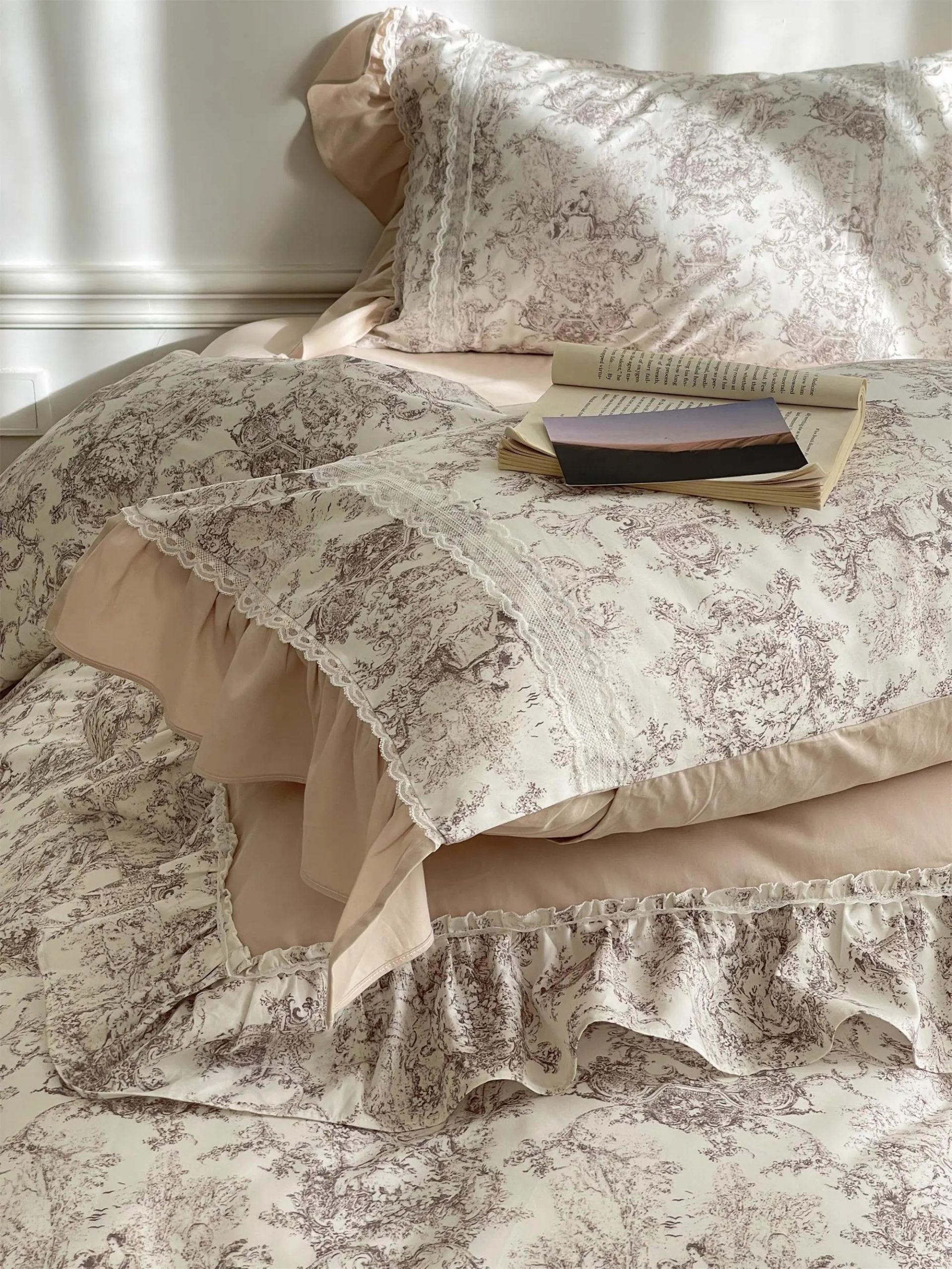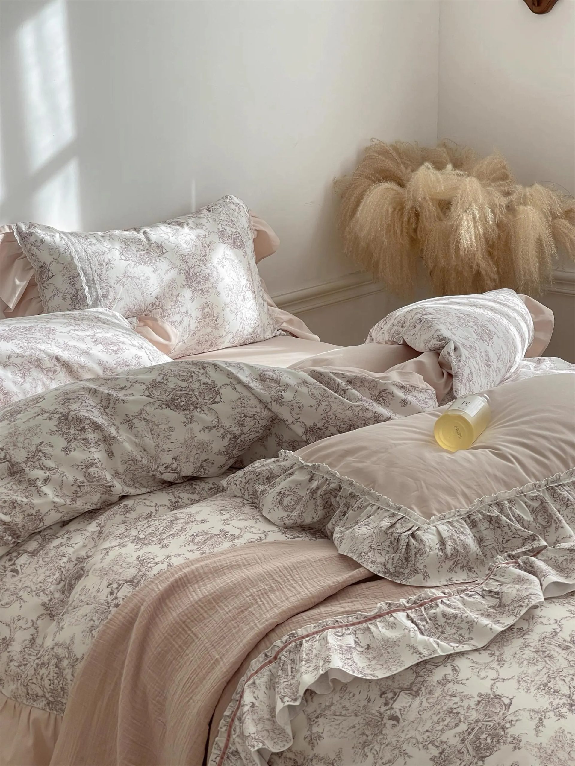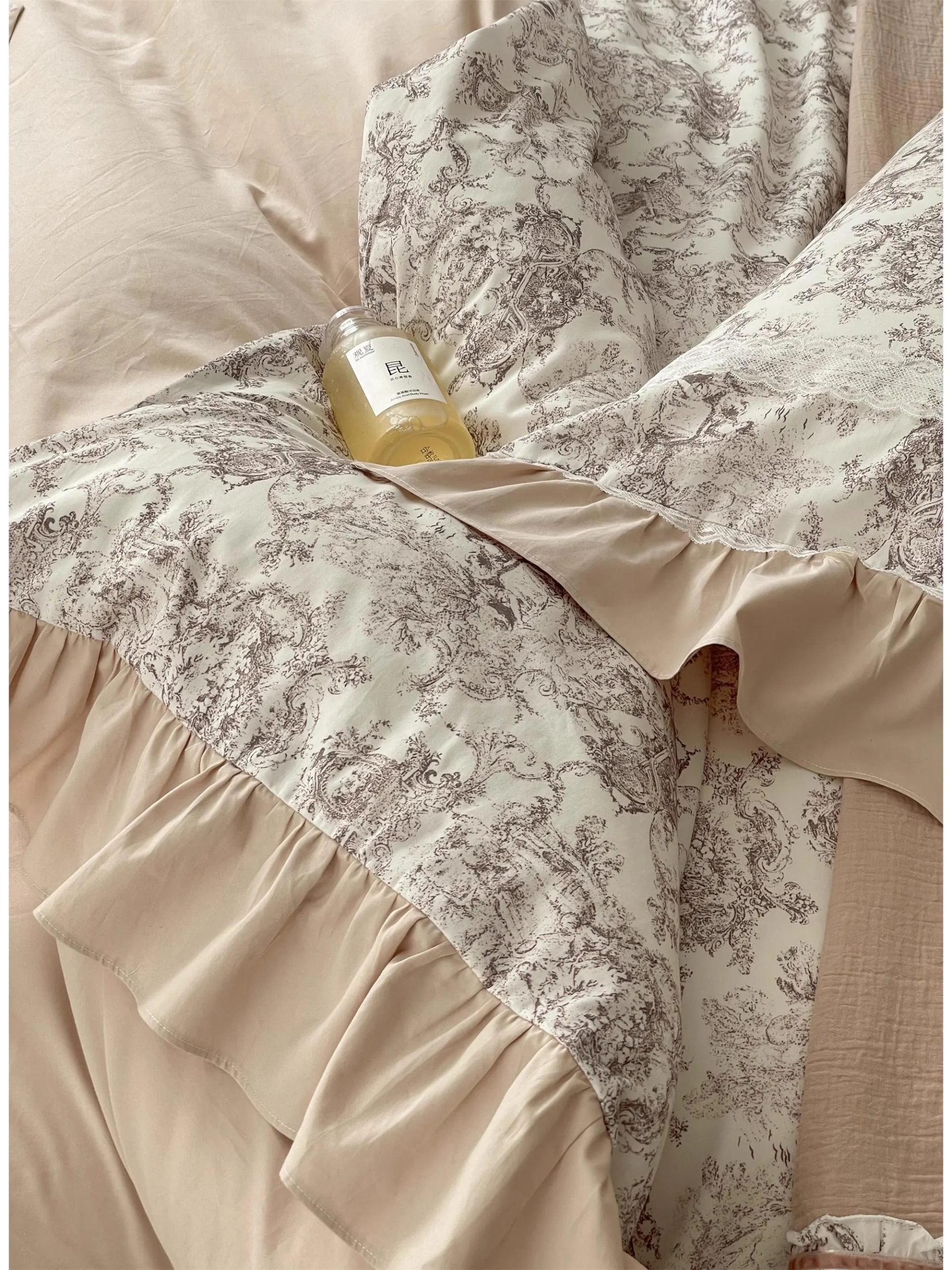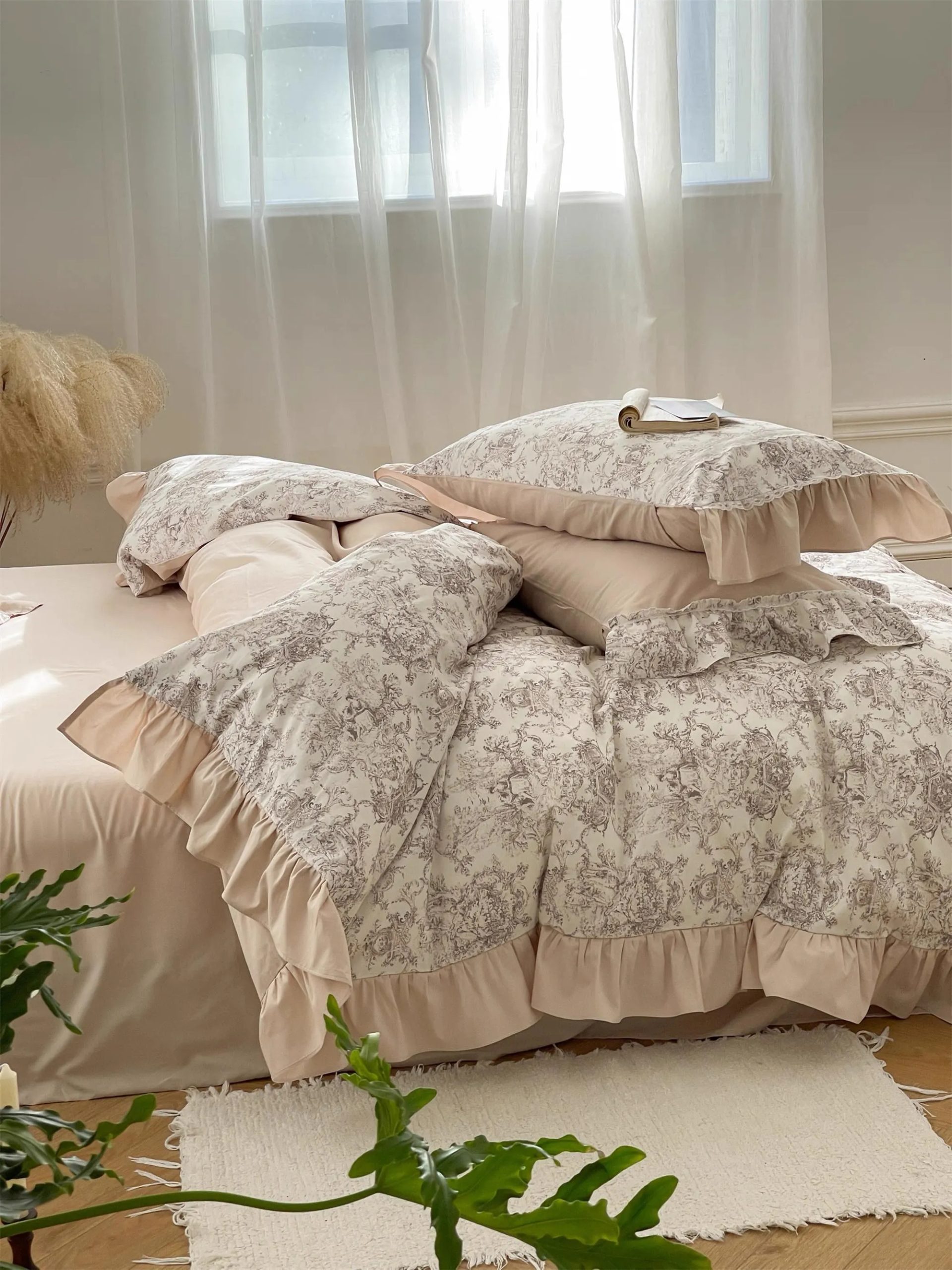 Ruffled Edges: The bedding features handmade ruffled edges, creating a natural, layered look that imbues the bedding with a romantic, soft French countryside aesthetic, while exuding a sense of refined craftsmanship within its rustic simplicity.