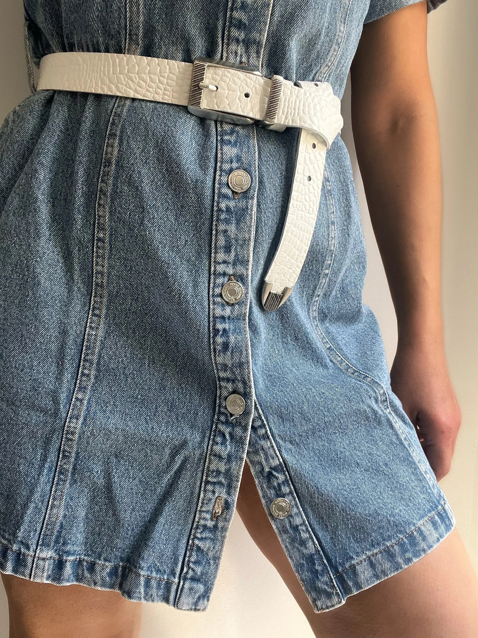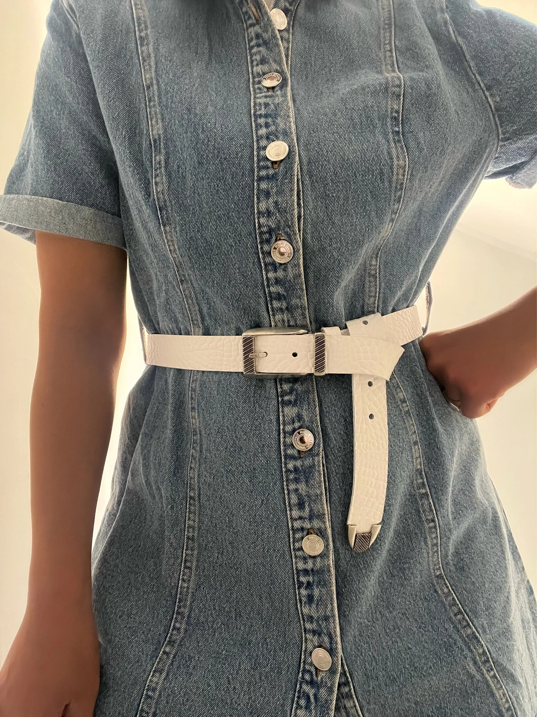 Crocodile print, white, and silver create a refreshing and retro blend: The white belt is fresh and eye-catching, while the crocodile print adds a subtle layer of depth to the solid color, avoiding monotony. Paired with a vintage silver buckle, it creates a striking contrast between fresh white and cool silver. While retaining the softness of white, the silver buckle adds a touch of vintage sharpness, elevating the belt from a basic accessory to a statement piece, easily adding a fresh and retro touch to any outfit, including a denim skirt (as shown).