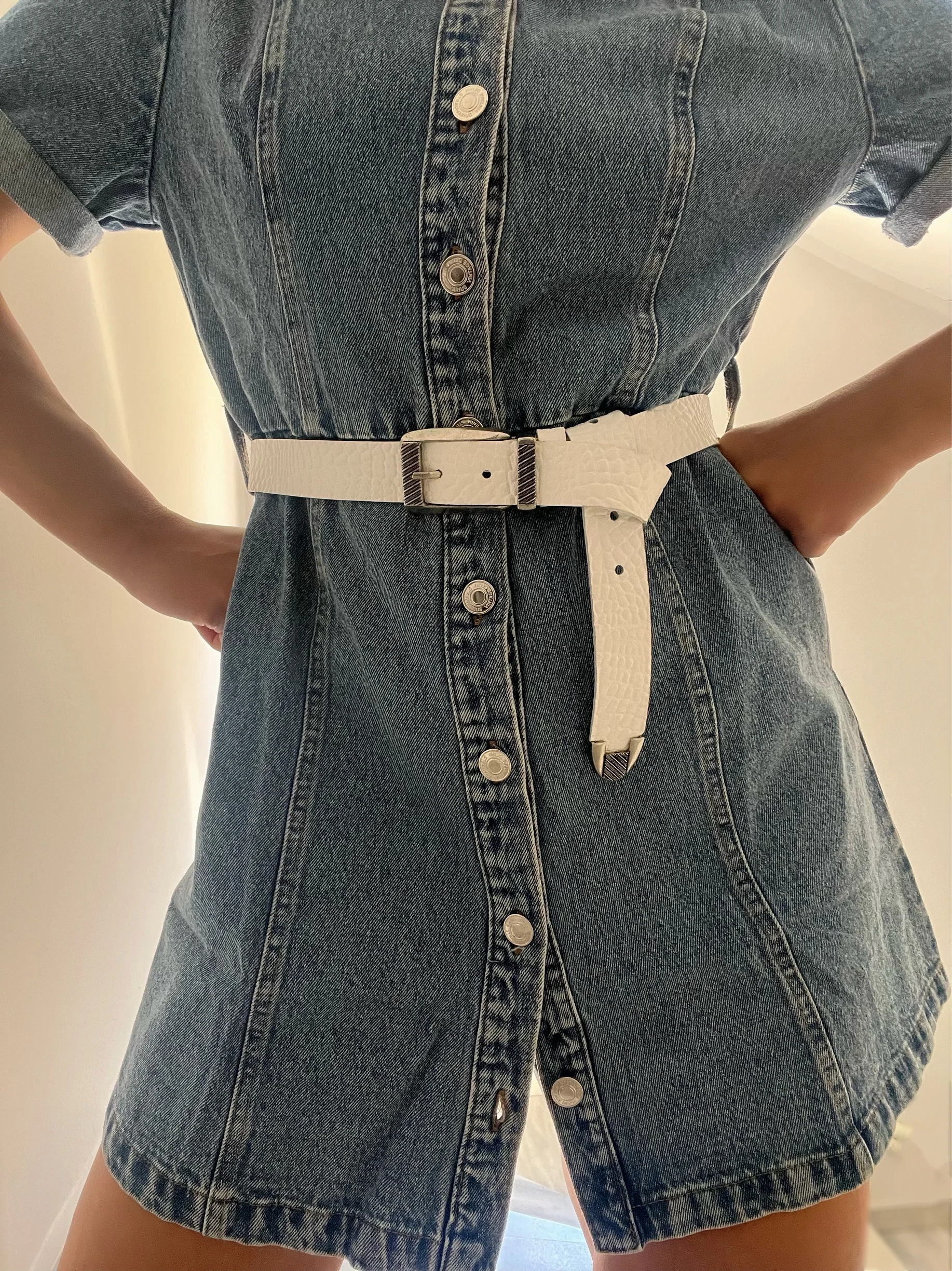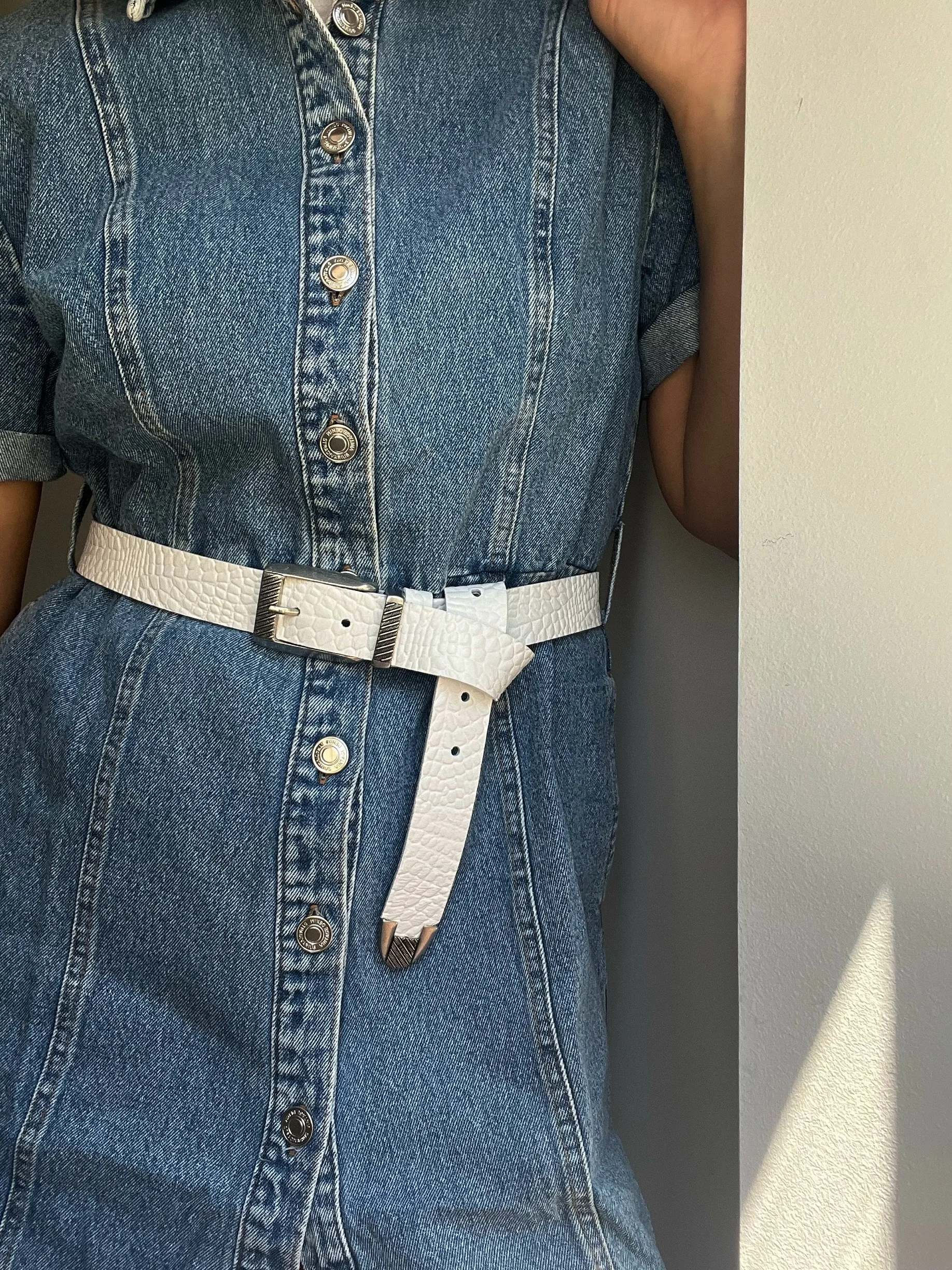 Fresh Denim Style: Paired with a denim dress (as shown), a white belt neutralizes the toughness of the denim, while a vintage silver buckle adds refined detail to the casual look. Whether you’re out and about or exploring a coffee shop, this outfit creates a fresh and casual vibe, easily becoming a focal point.