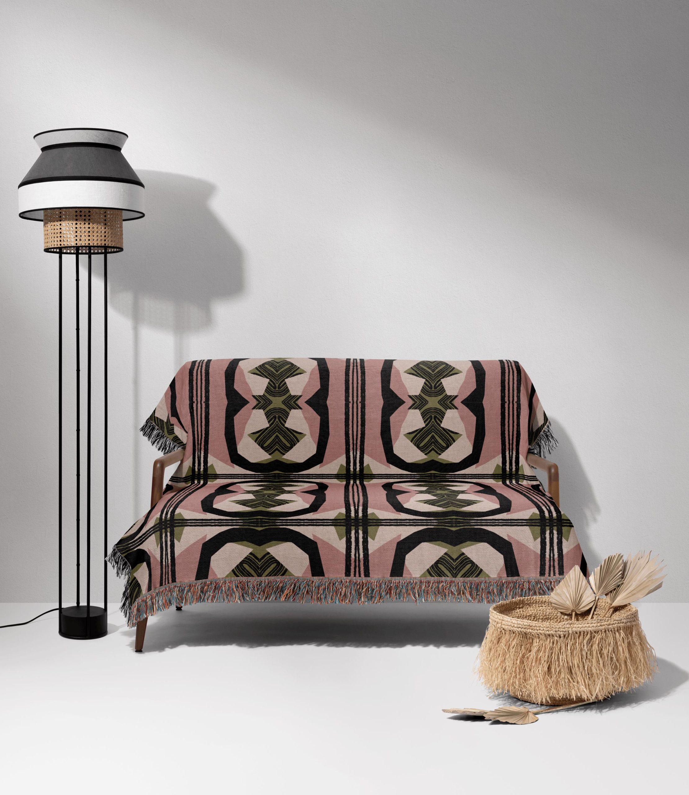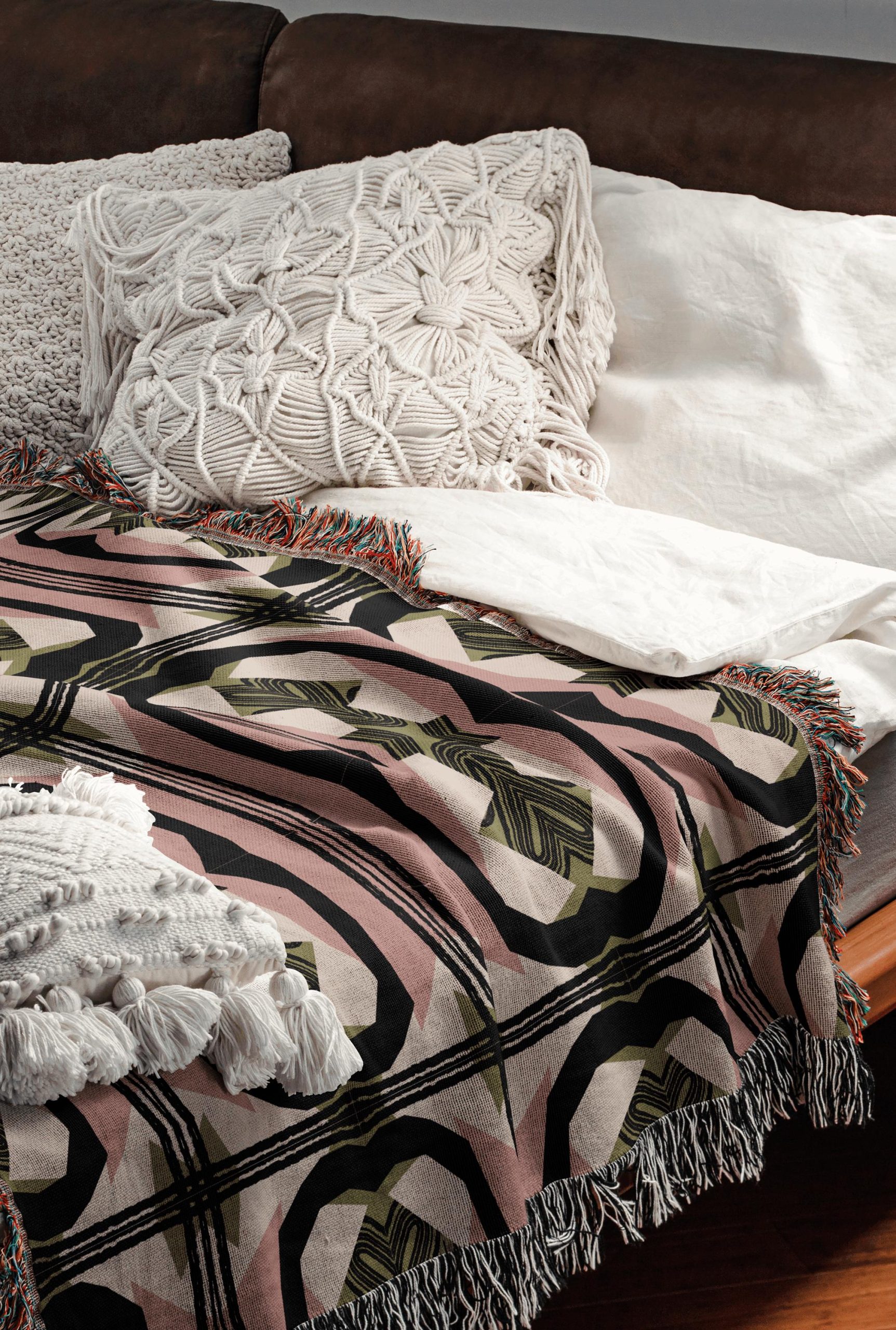 Decorative Fringe Edges – Finished with fringe trim on all sides, adding a relaxed yet intentional frame that enhances the graphic pattern.
