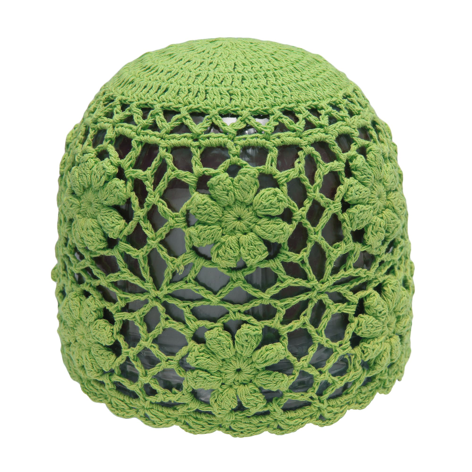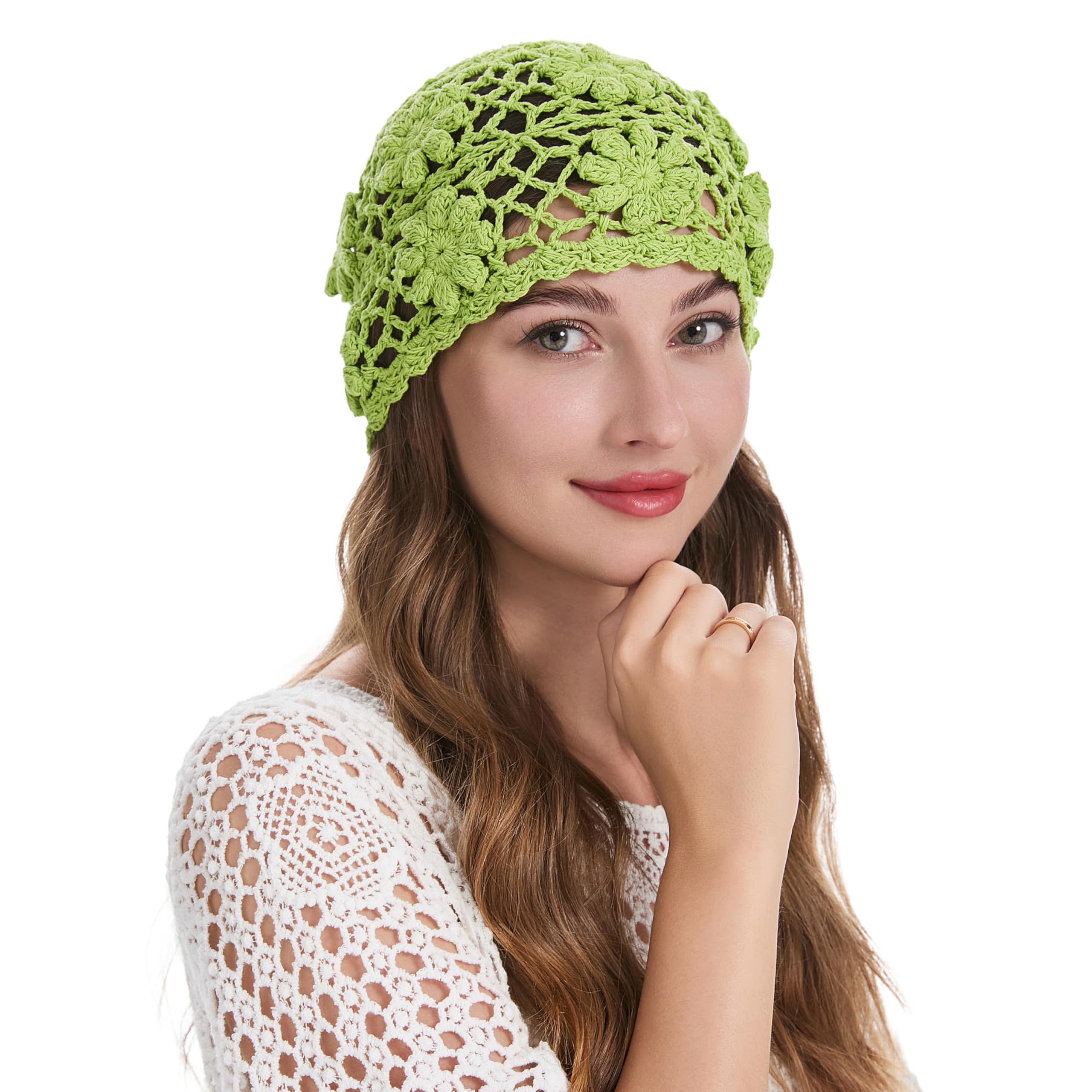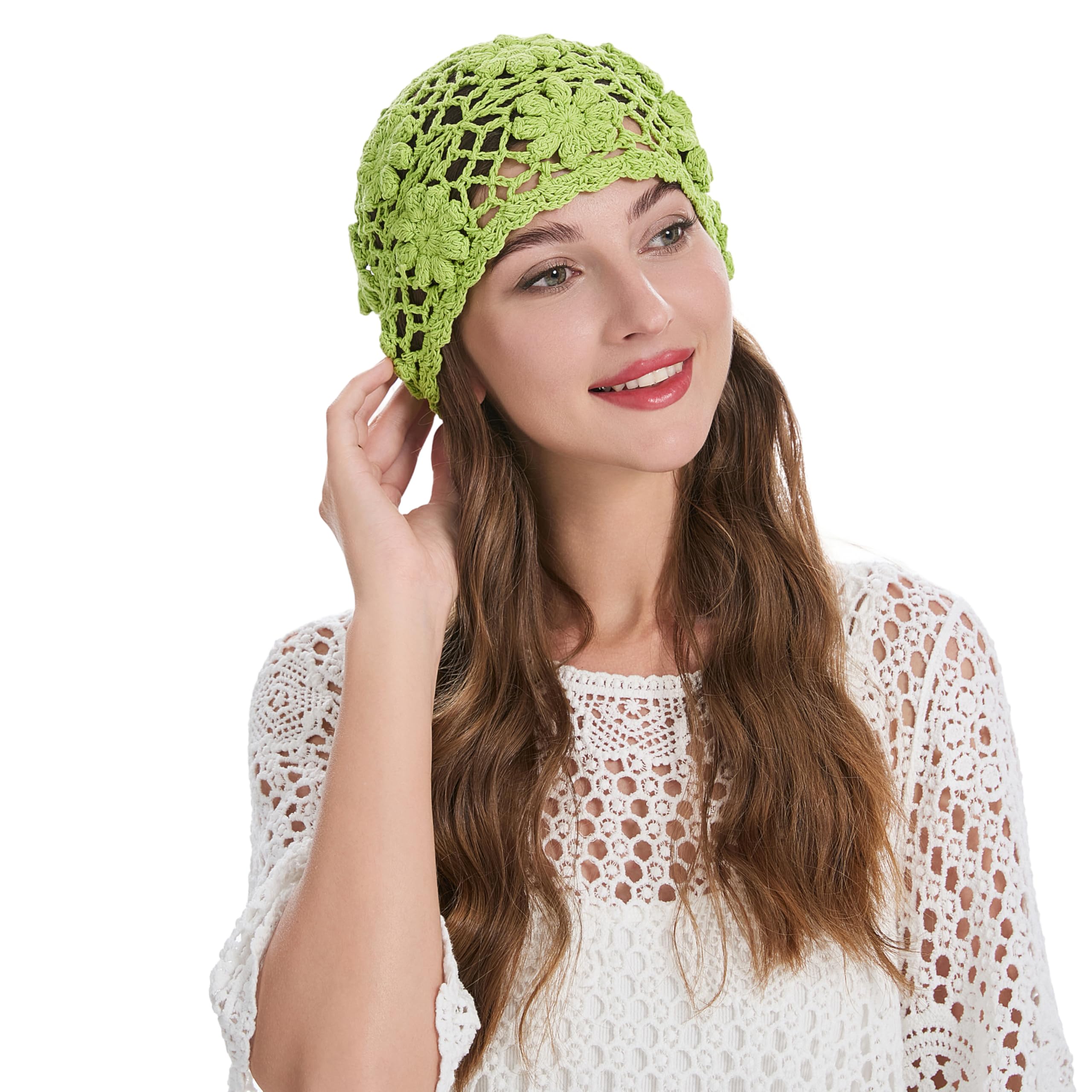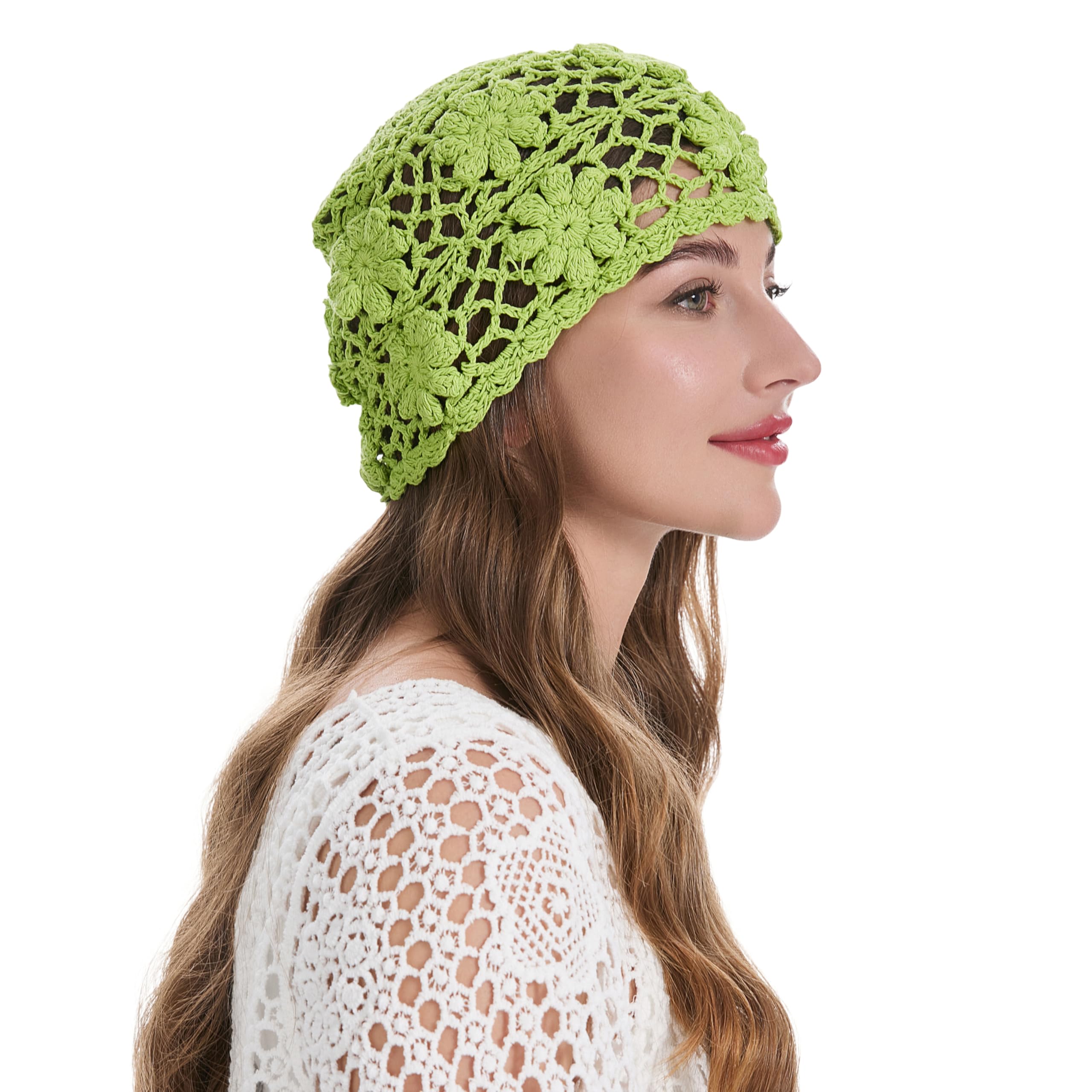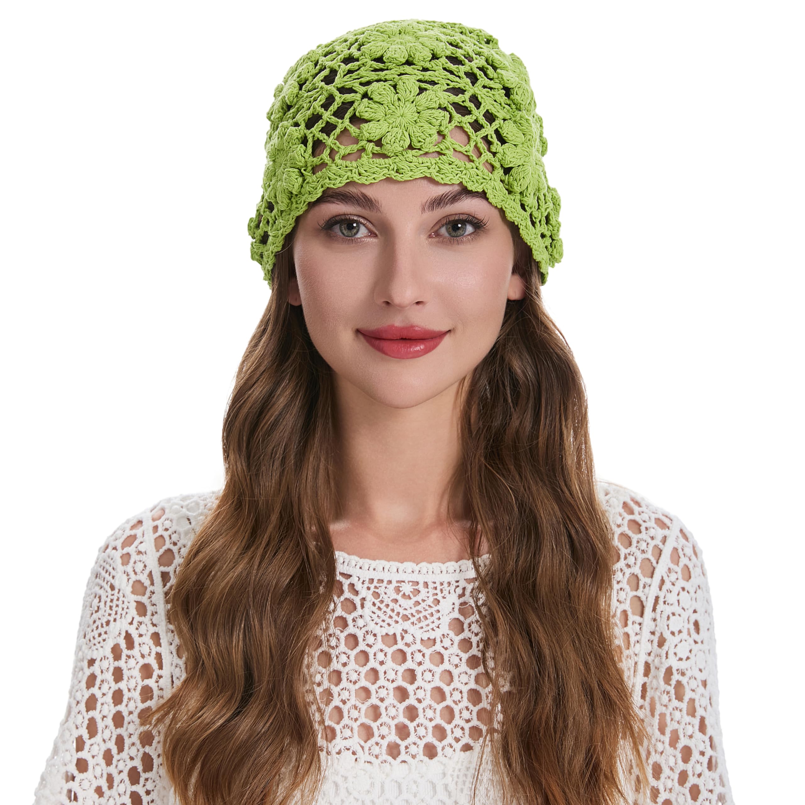 This green crochet cap is fresh, vibrant, and full of personality, featuring a design with openwork stitching and raised floral patterns encircling the head. The bright color and handcrafted texture give it a playful bohemian flair, instantly brightening up a simple outfit.