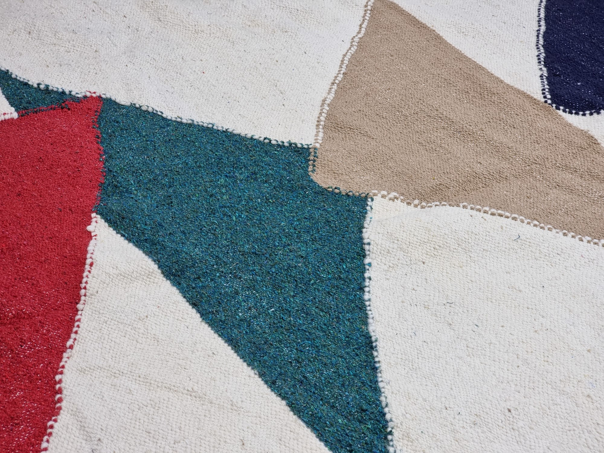 The triangular edges are delicately handwoven, with subtle undulations (the artisans’ fingertips create a unique silhouette and color transition for each triangle). The naturally draped hand-woven tassels, each with a unique length and knotted detail, gently sway as you walk, imbuing the rug with the “lazy, dynamic beauty of nomadic peoples.”