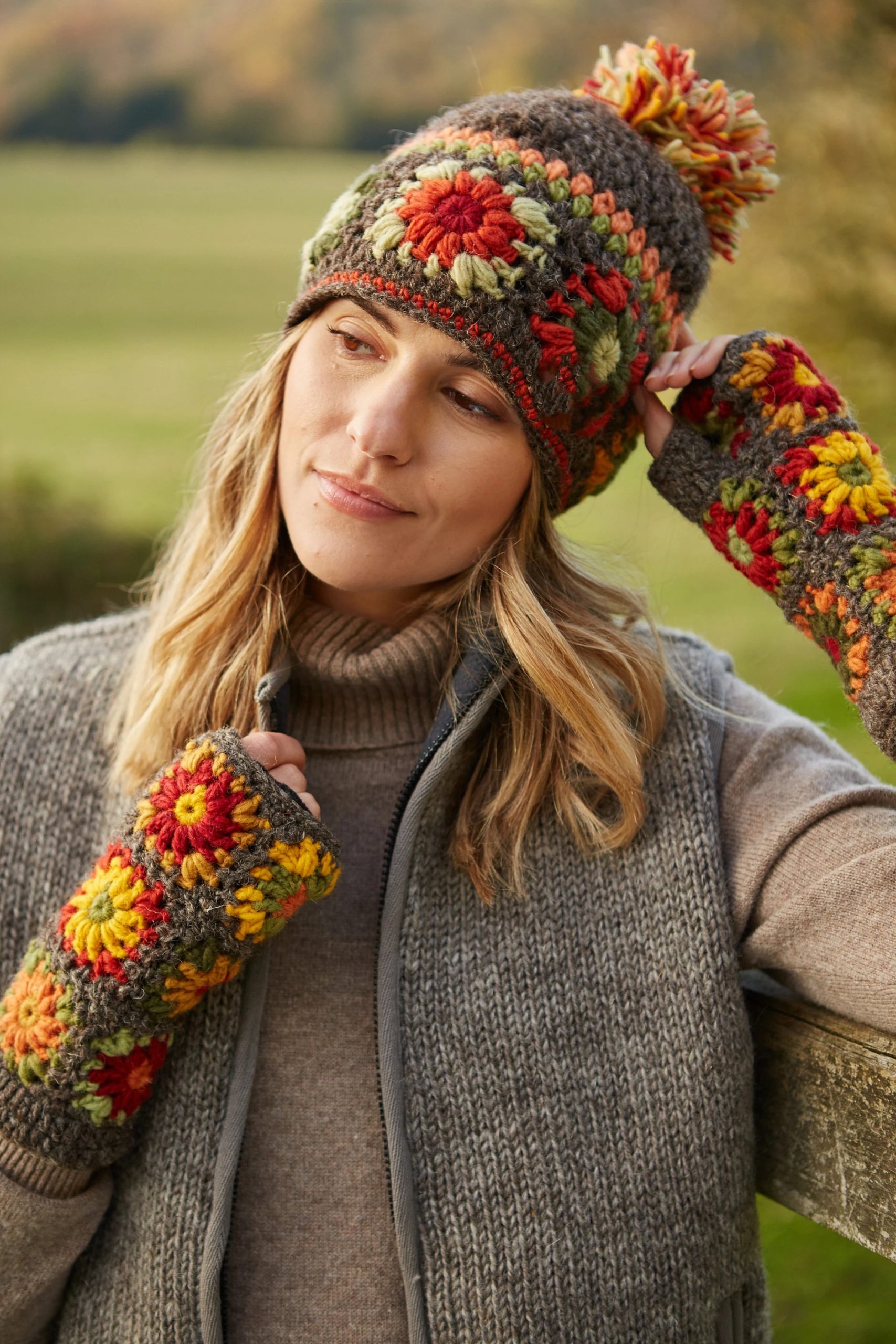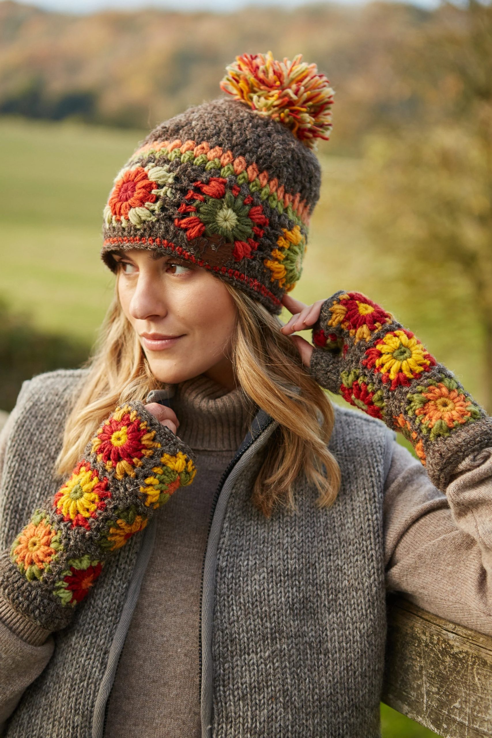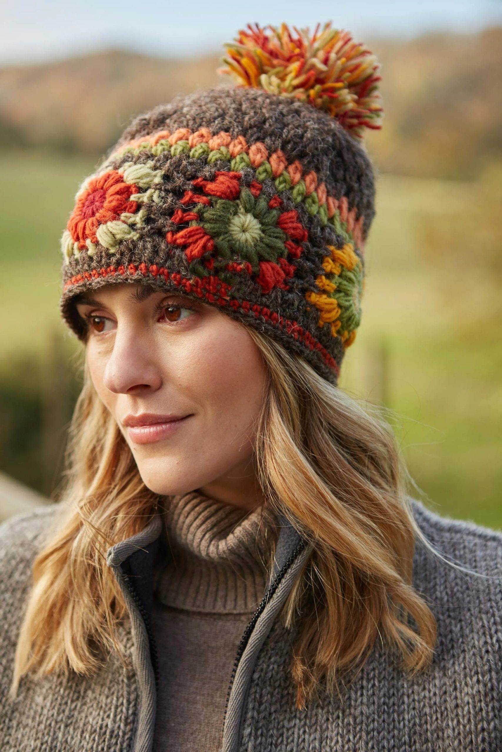 This hand-crocheted pom-pom hat features an autumnal color palette, with a mocha base adorned with floral patterns in moss green, pumpkin, olive green, and marigold colors, finished with a thick, multicolored pom-pom. The comfortable texture blends perfectly with a rustic, country style.