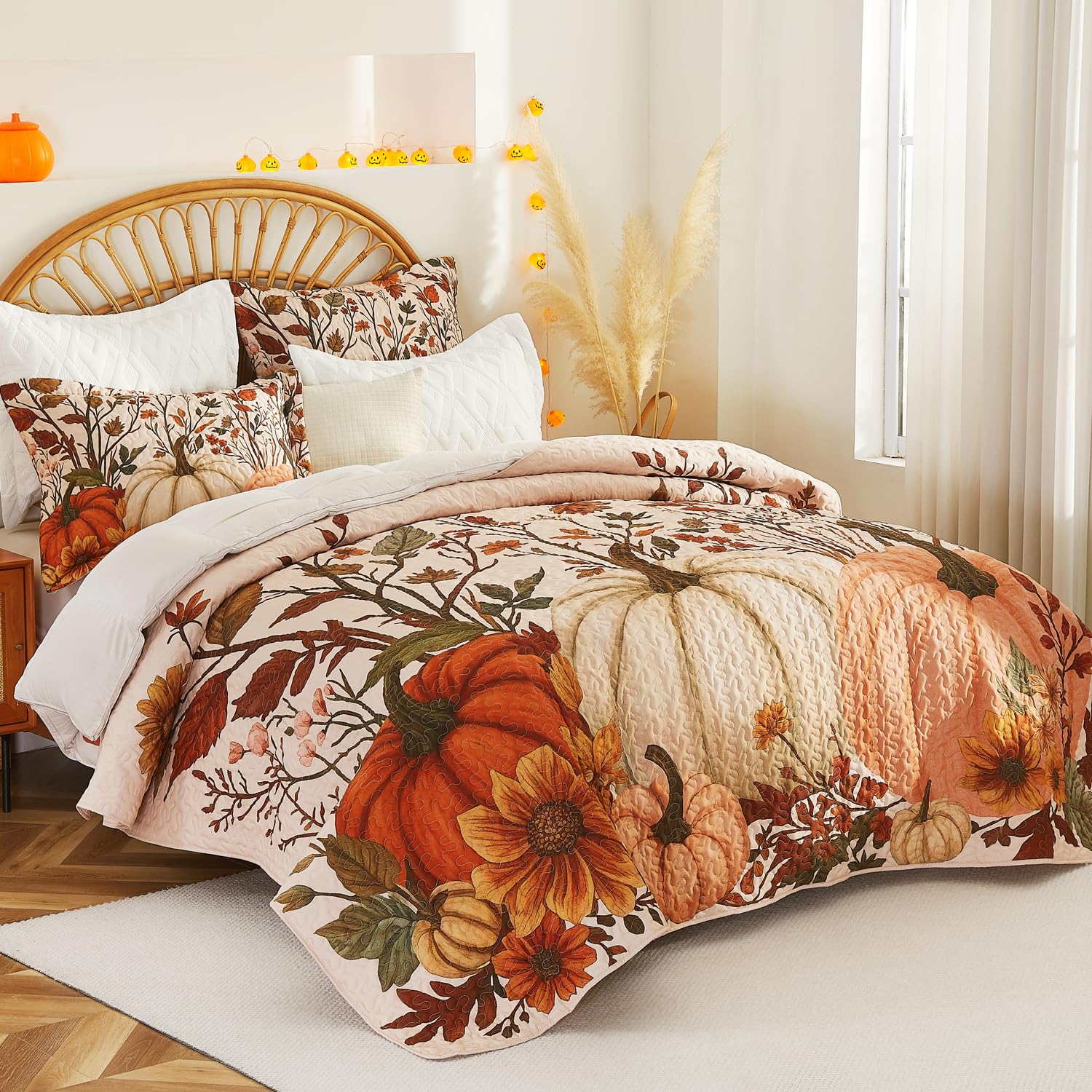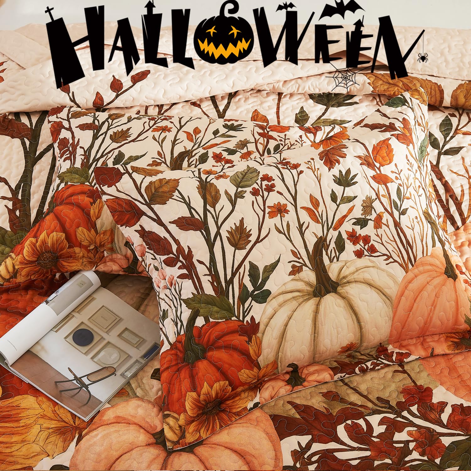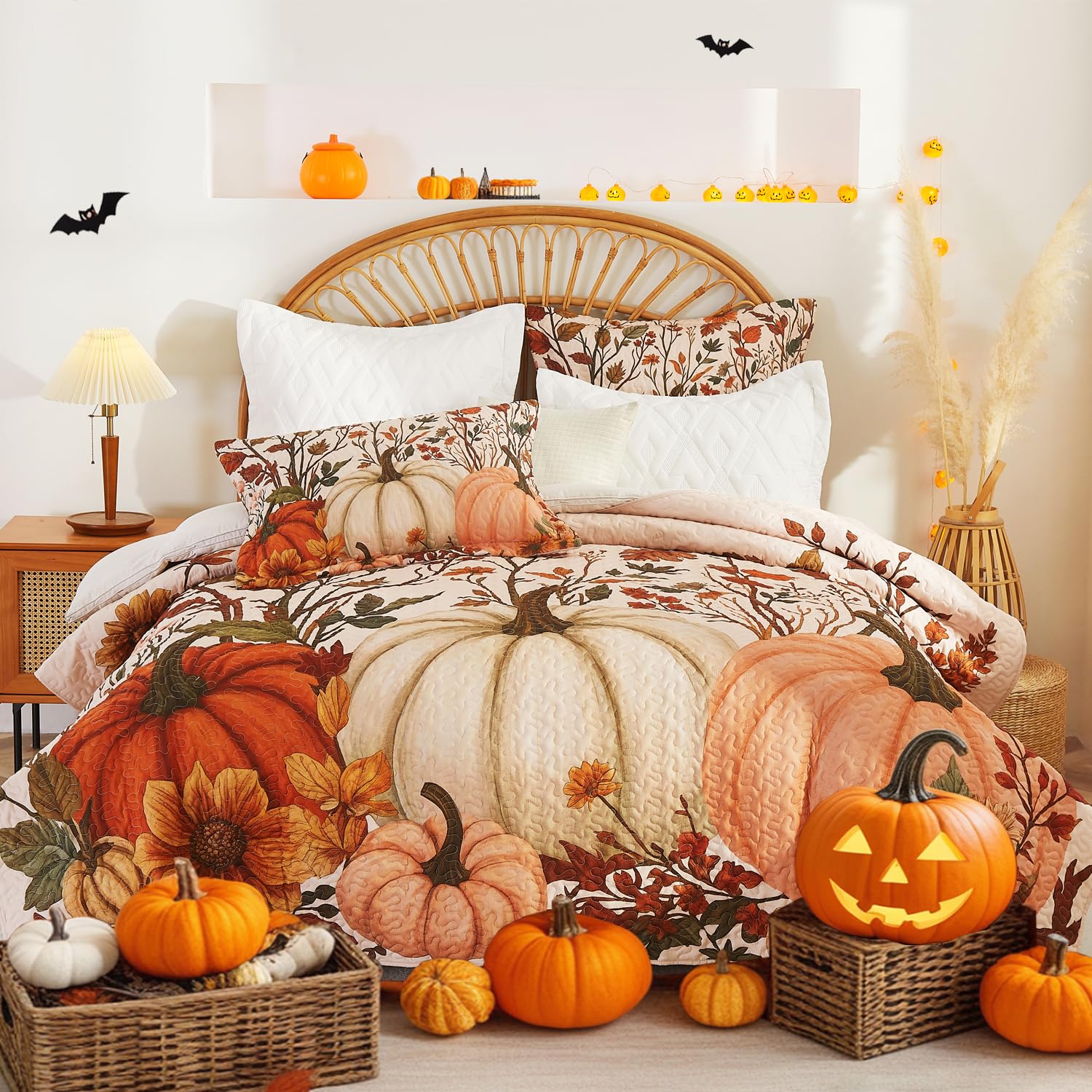 Matching pillowcases feature a coordinating pumpkin pattern, creating a harmonious and unified home décor.