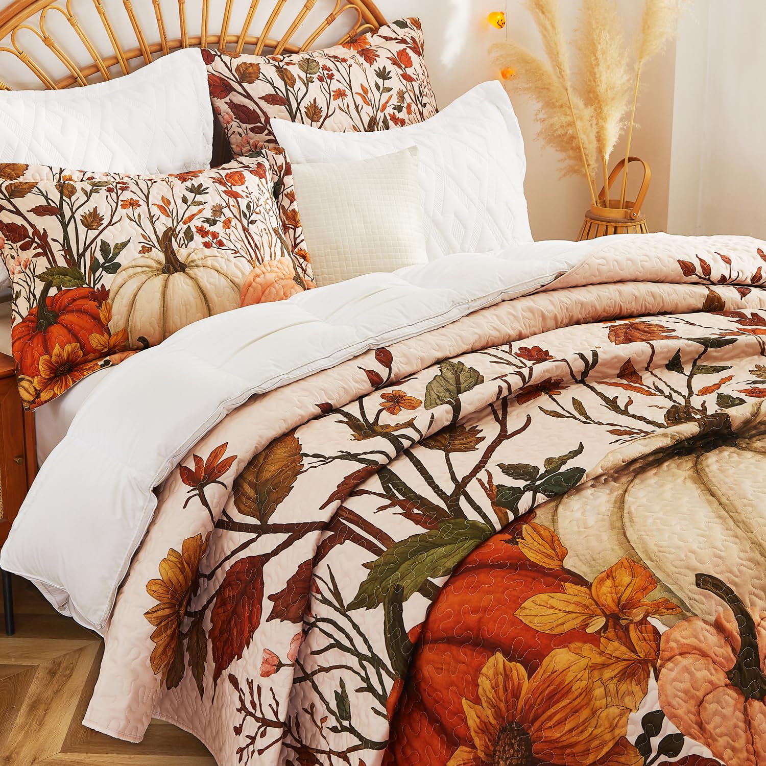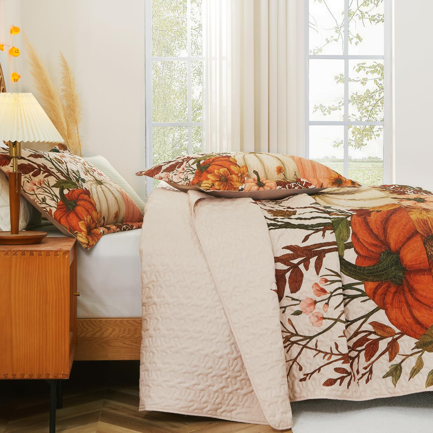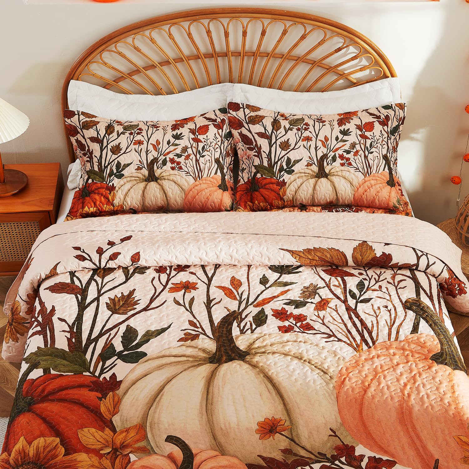 Matching pillowcases feature a coordinating pumpkin pattern, creating a harmonious and unified home décor.