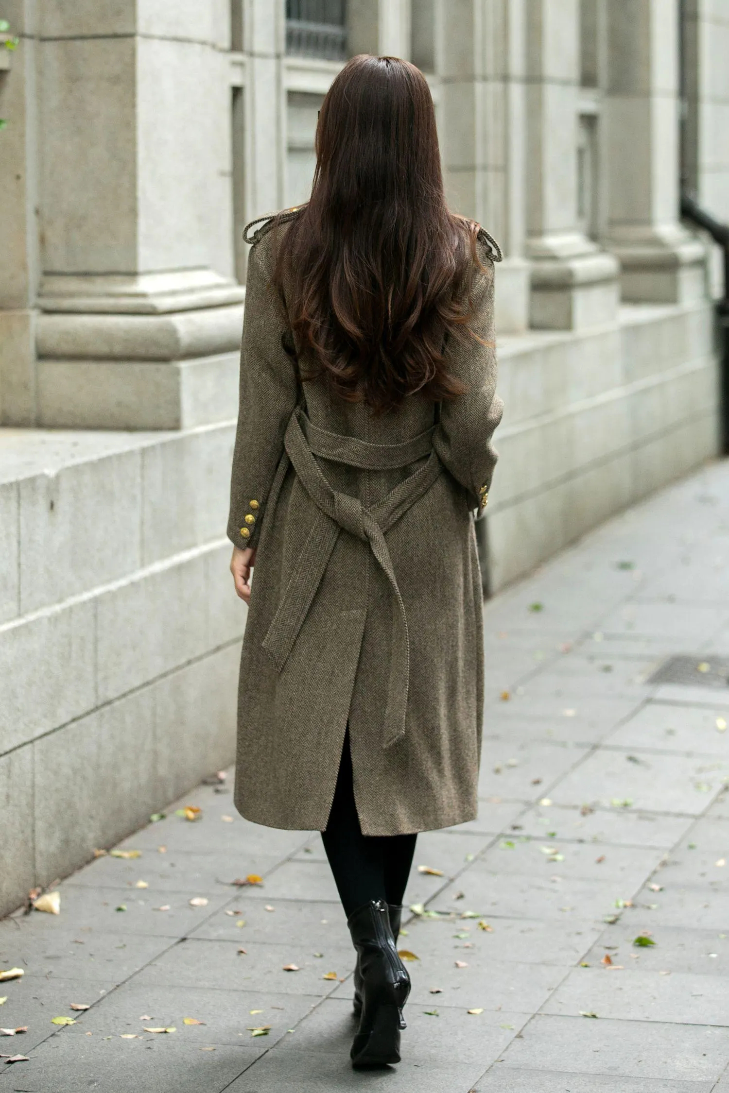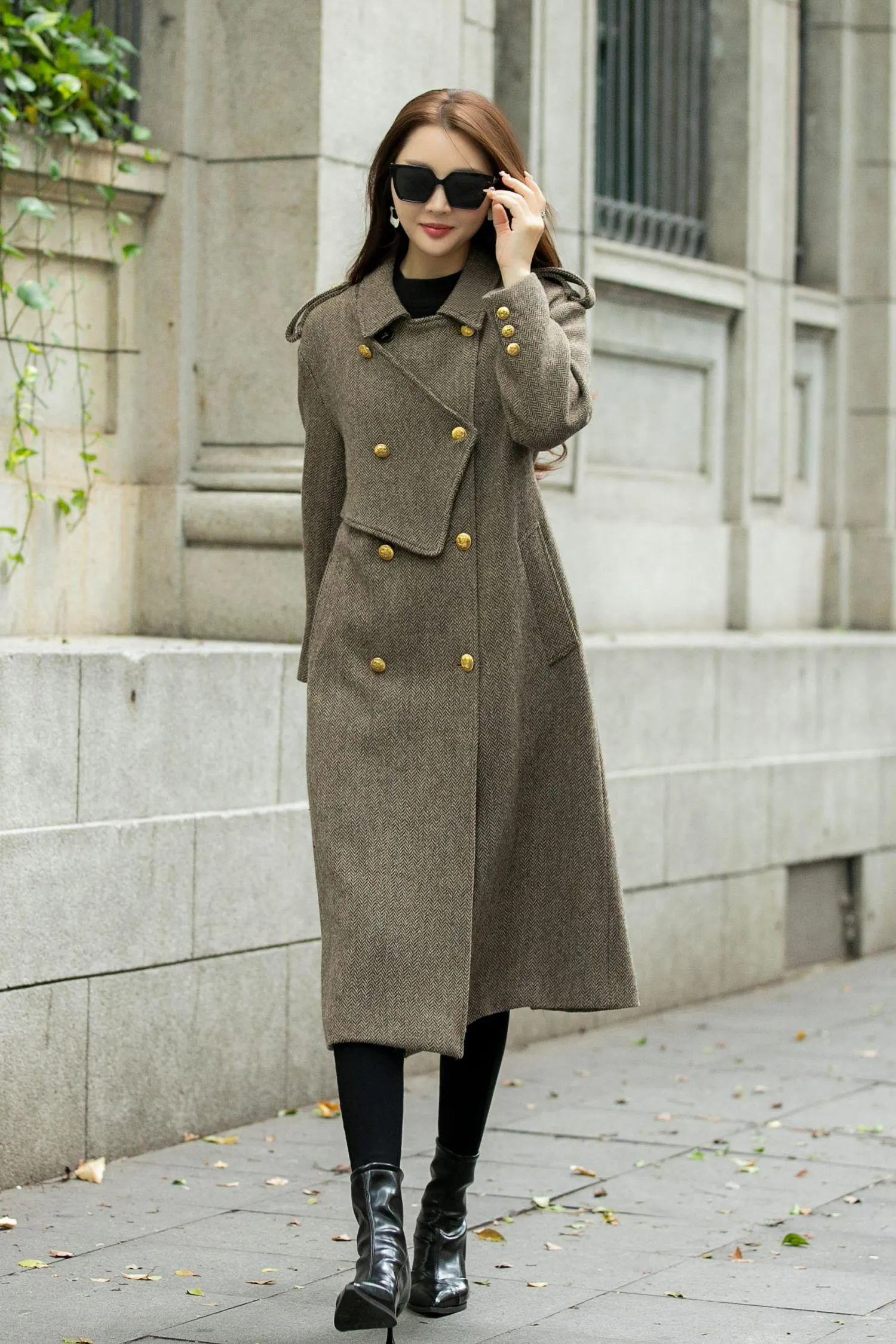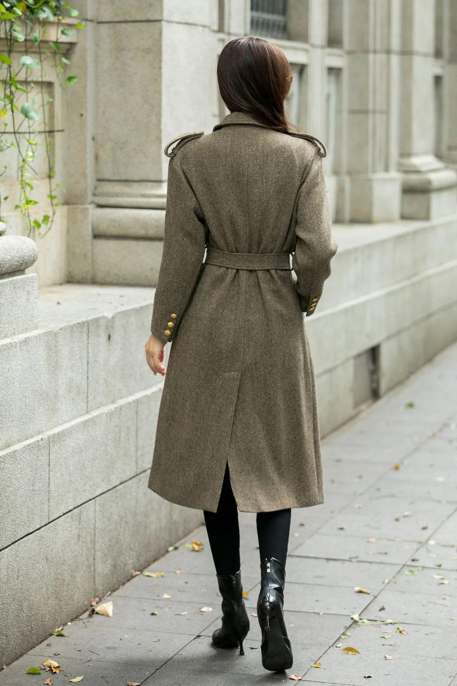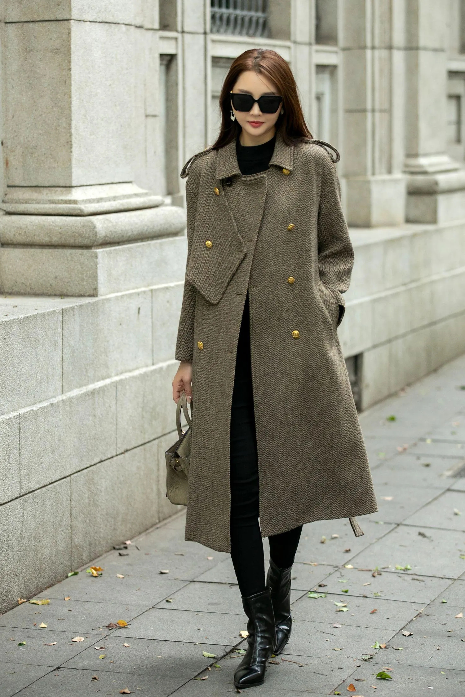 This classic trench coat is reimagined in textured herringbone tweed. Cape/storm flaps accent the shoulders for added structure and movement, while epaulettes and a double-breasted front are accented with gold-tone buttons. Ties define the waist, and straight cuffs are finished with ties for a tailored fit. Side pockets are strategically integrated, and the hem drops below the knee for a sleek, streamlined silhouette.